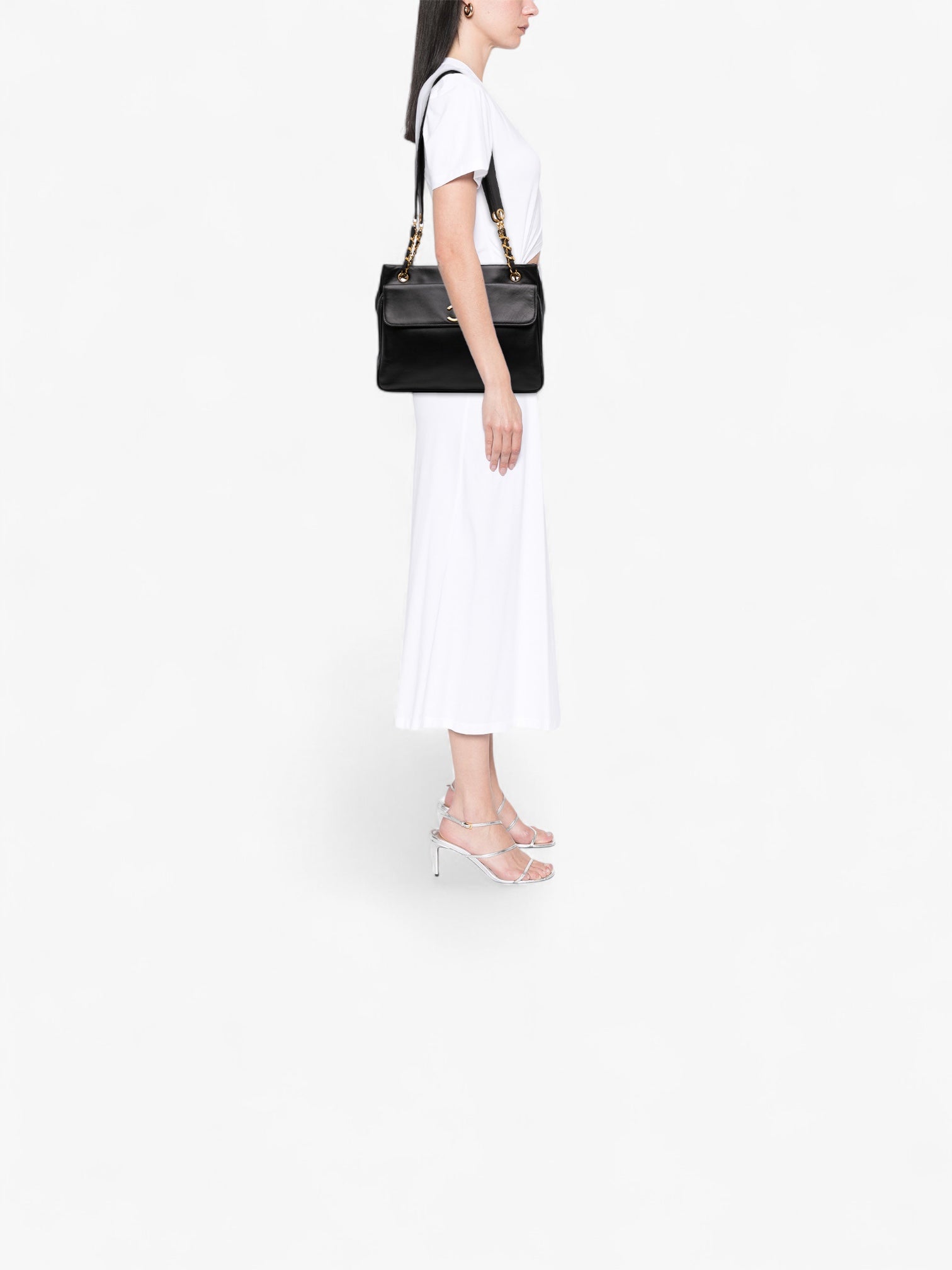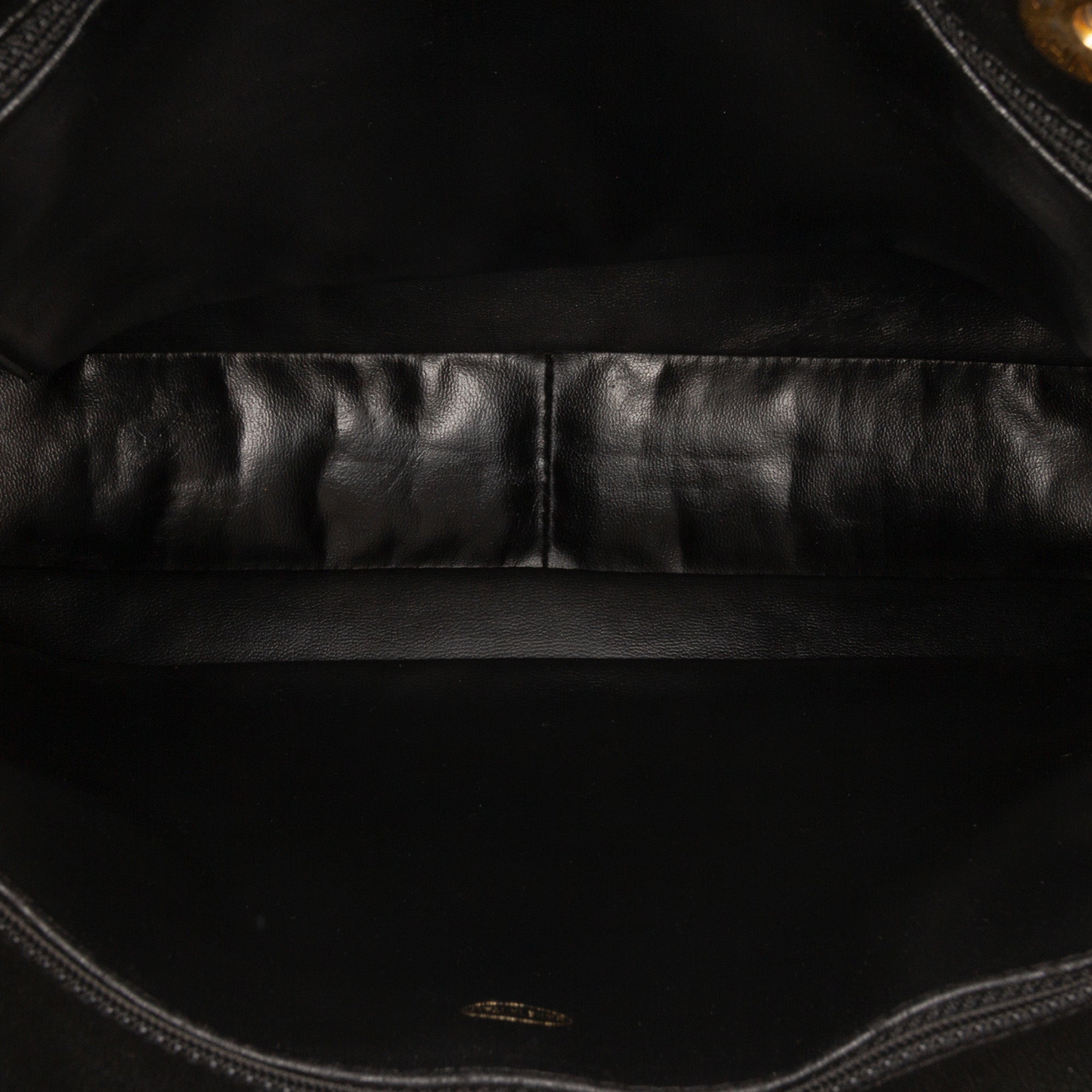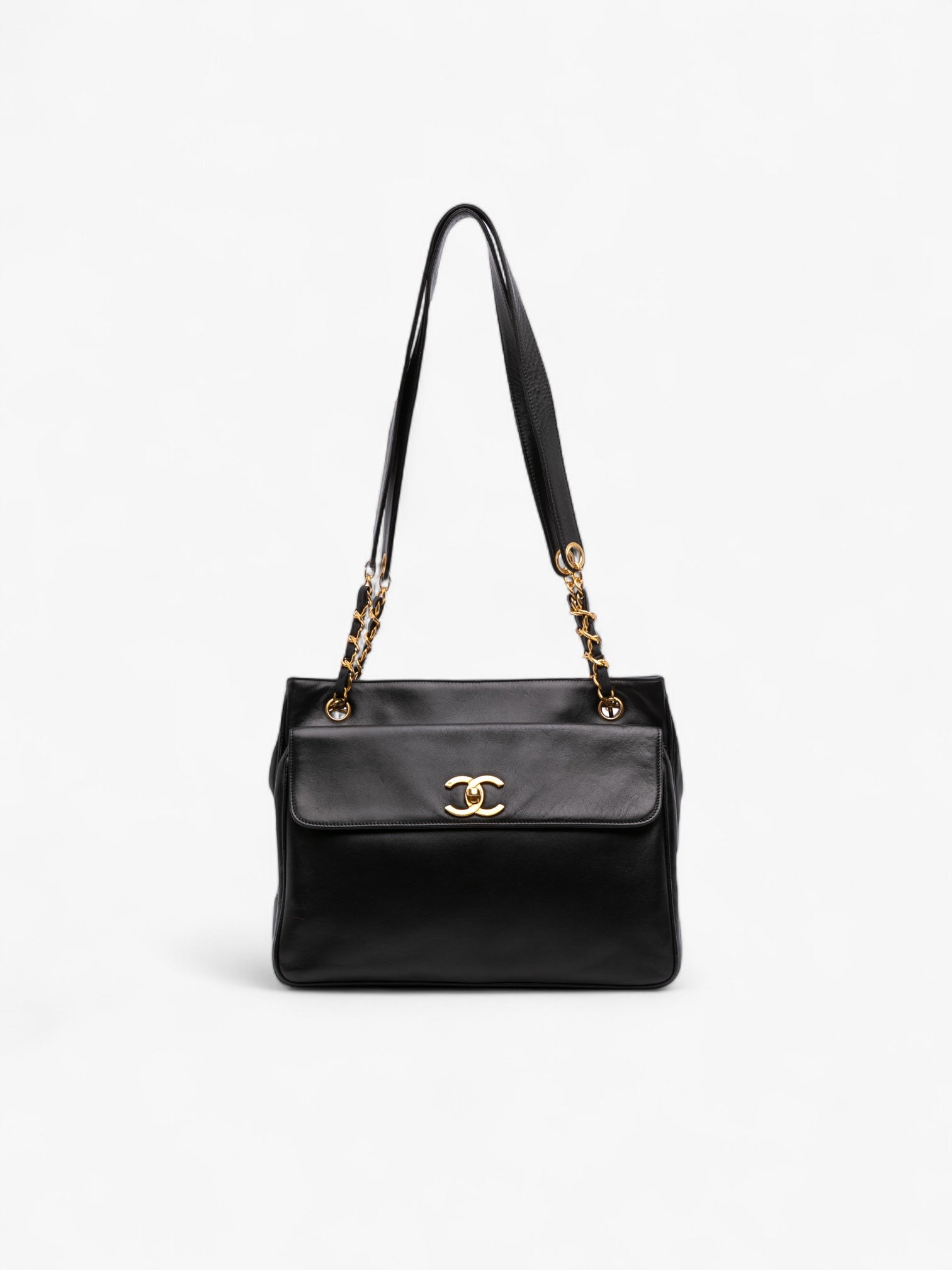 Chanel CC Lambskin Front Pocket Tote е елегантна и универсална чанта, изработена от мека агнешка кожа. Разполага с кожени дръжки, вплетени във верижки с кожена защита, отворен горен ръб с магнитни закопчалки и външен преден джоб с капак и емблематичното CC закопчаване. Чантата включва и външен заден джоб, както и просторен интериор с вътрешни джобове с цип и отделения, което я прави едновременно стилна и практична за ежедневна употреба.