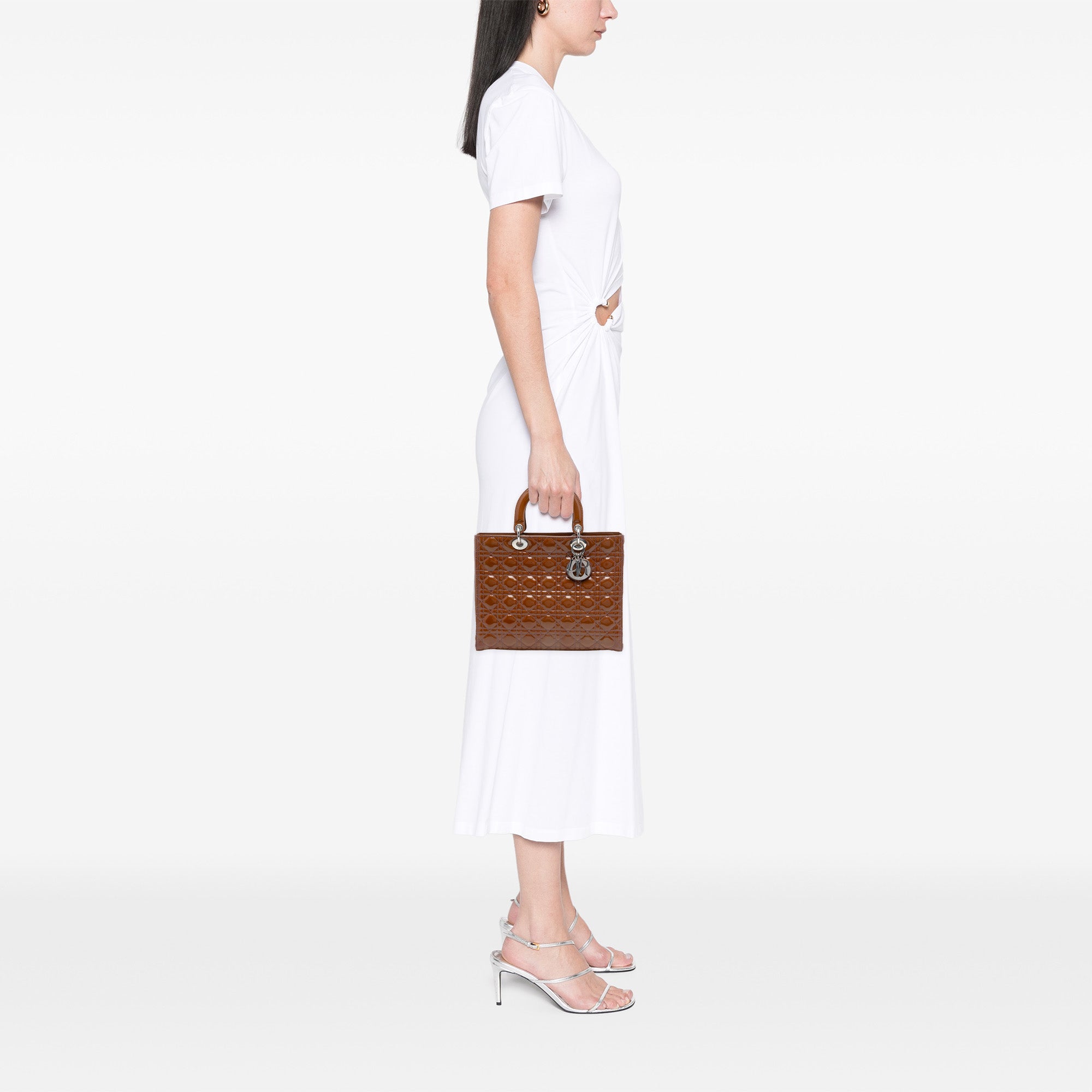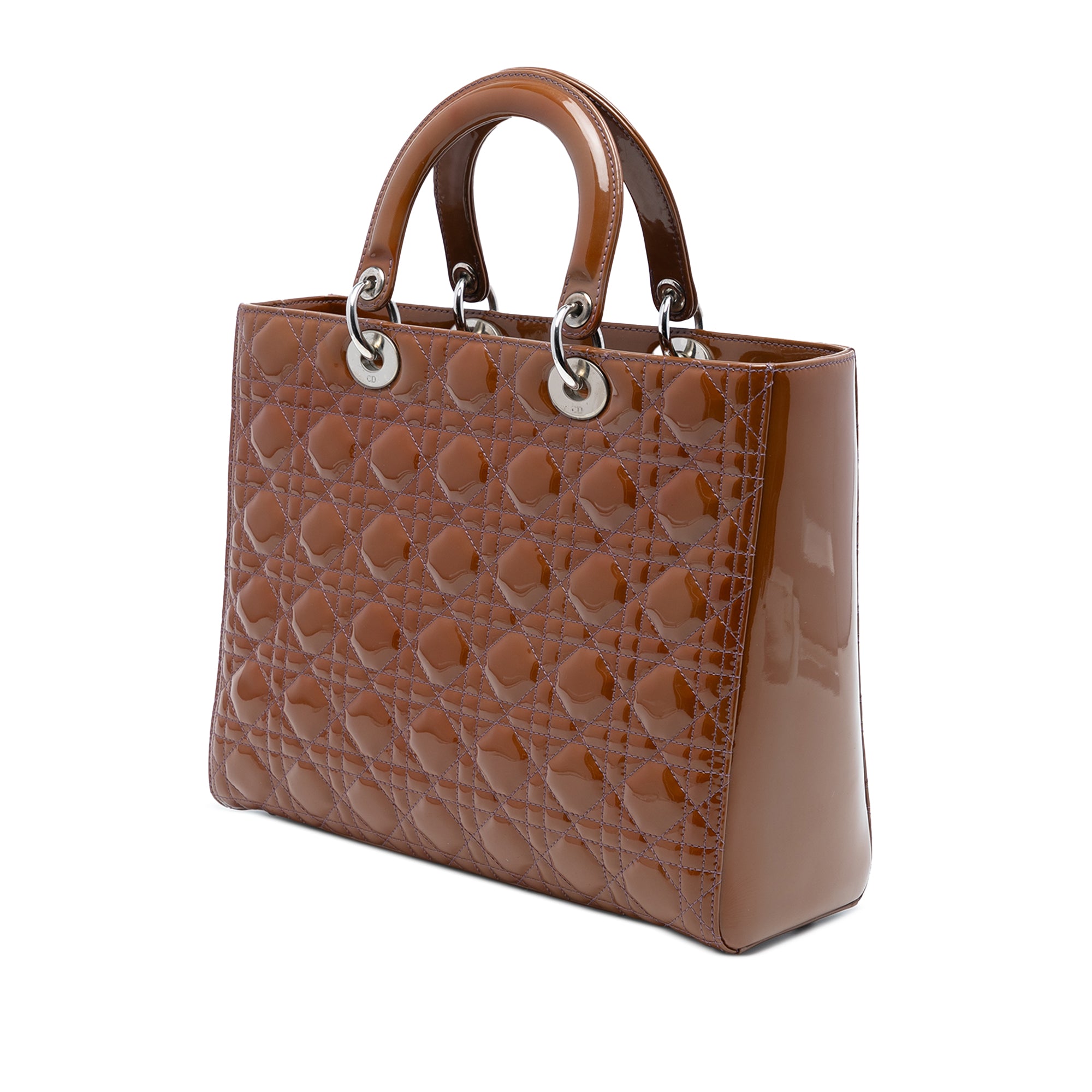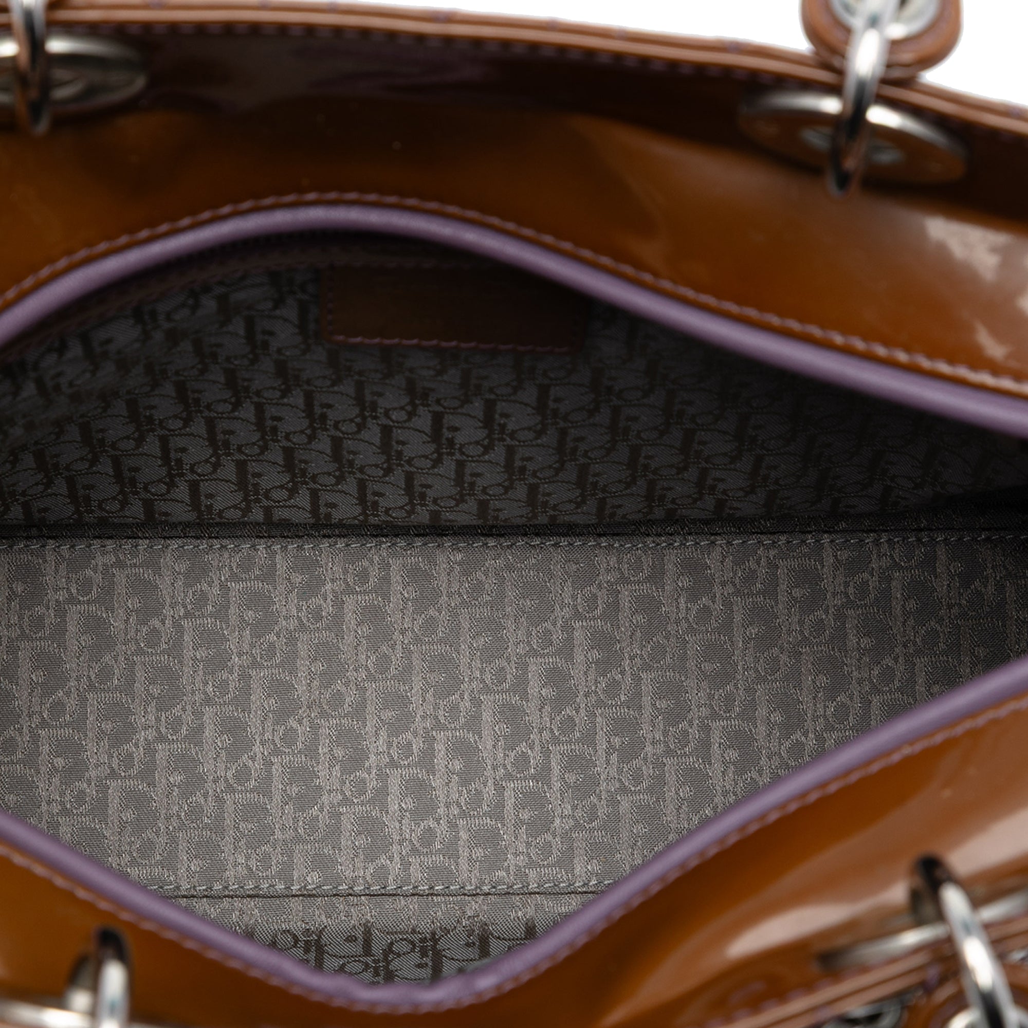 Това е автентичната чанта Dior Large Patent Cannage Lady Dior в изтънчен кафяв нюанс. Изключително изработена от премиум лакирана кожа, тази иконична чанта разполага с плоски кожени дръжки, сигурно затваряне с цип отгоре и практичен вътрешен джоб с цип, въплъщаващ изтънчената елегантност и безвремието, за което Dior е известен.