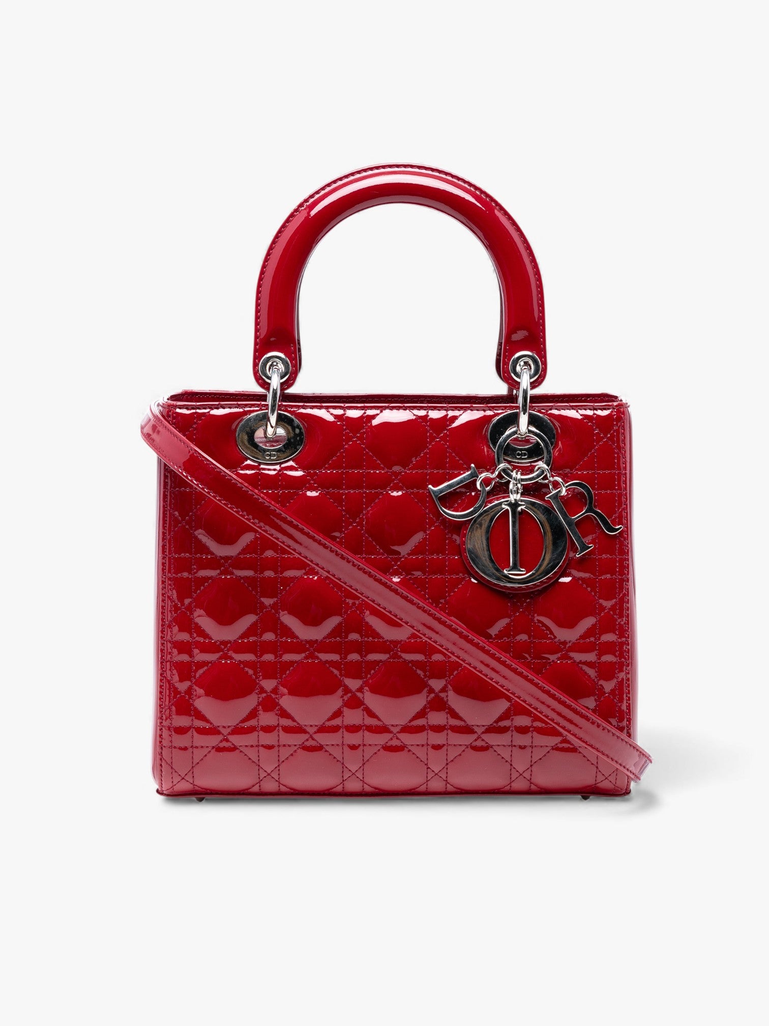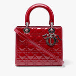 Средният патентен Cannage Lady Dior е възхитително воплощение на изисканото майсторство и вечната елегантност на Dior. Тази иконична чанта разполага с луксозно тяло от патентна кожа в удивителен червен цвят, допълнено от плоски кожени дръжки и отделяща се презрамка за разнообразно носене. Минливото внимание към детайлите се проявява в затварянето с цип отгоре и мислено проектираната вътрешна джобна с цип, което я прави перфектен спътник както за дневни, така и за нощни излети. Със своята шикова силует и изтънчен естетически вид, този модел не е просто чанта; това е изявление на стил и изисканост, което привлича модни ценители и колекционери.
