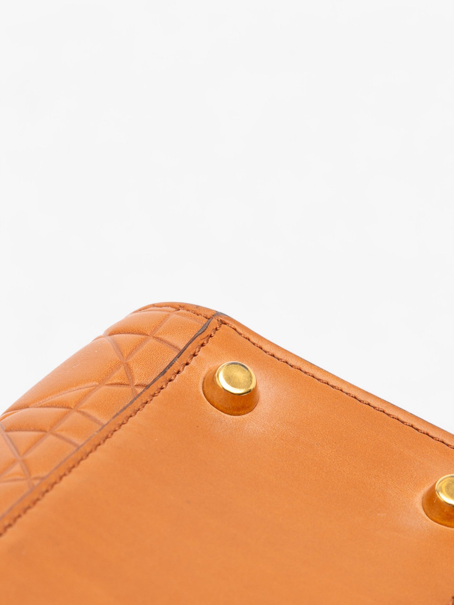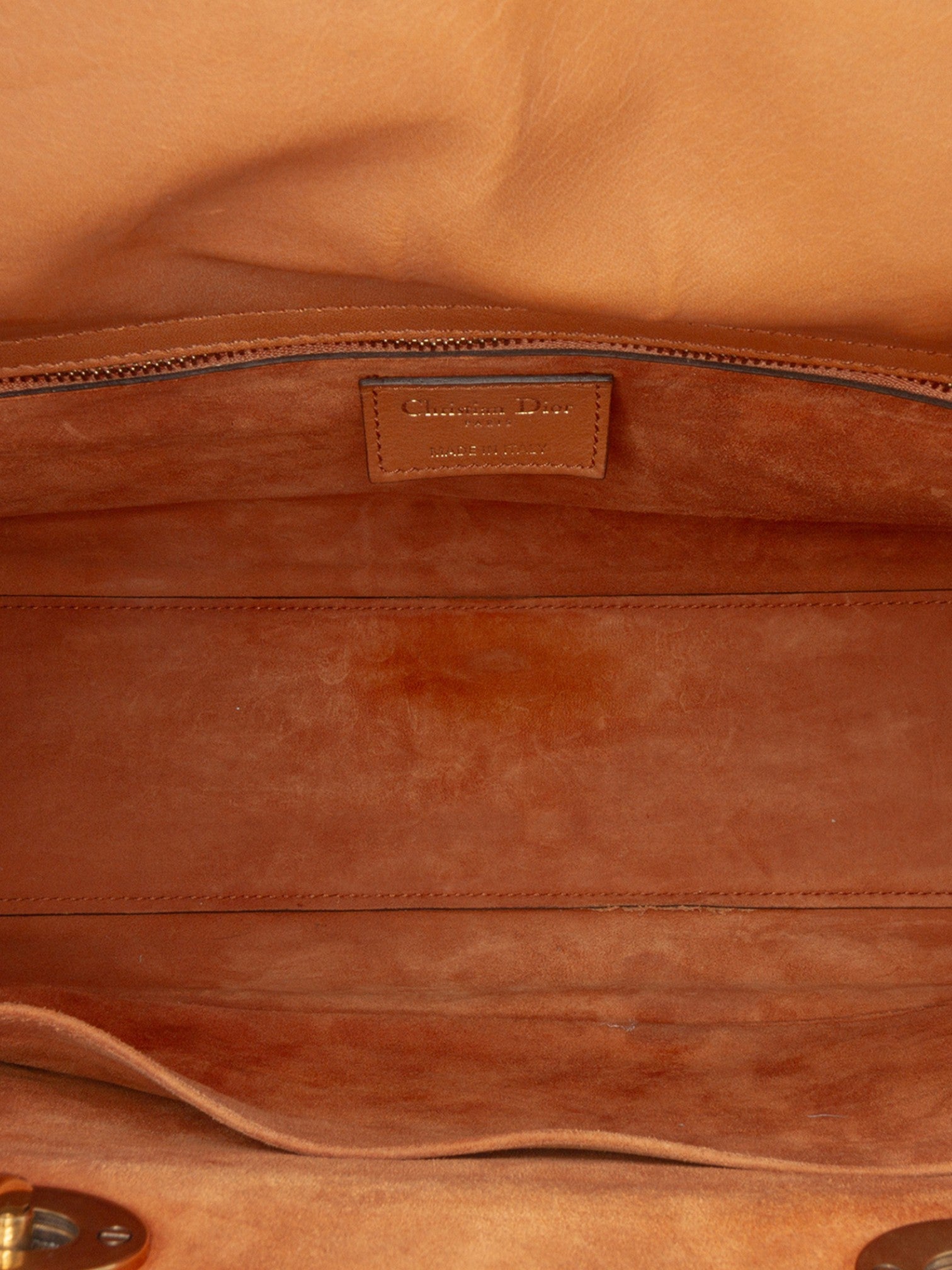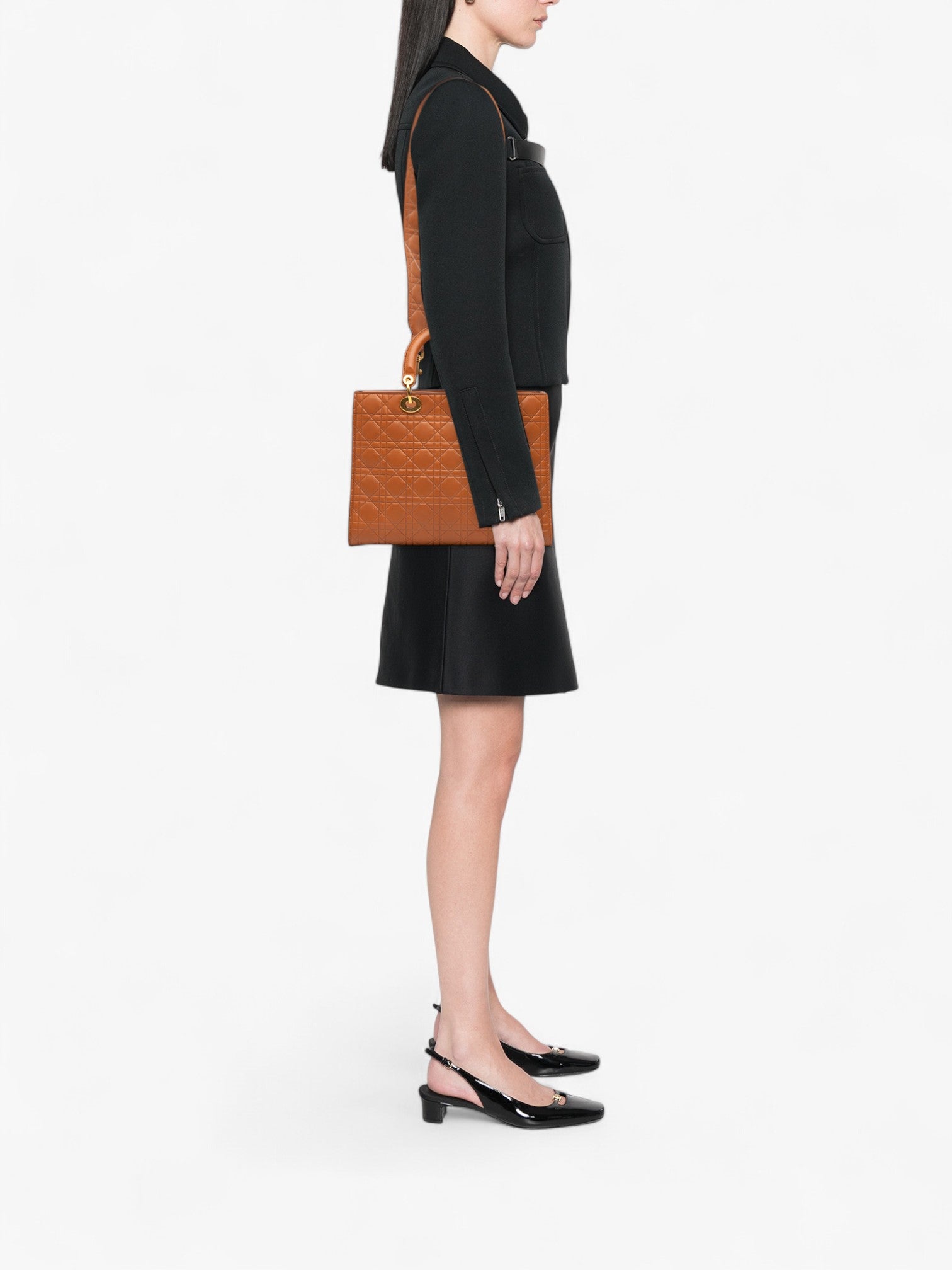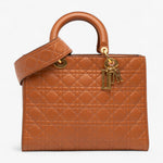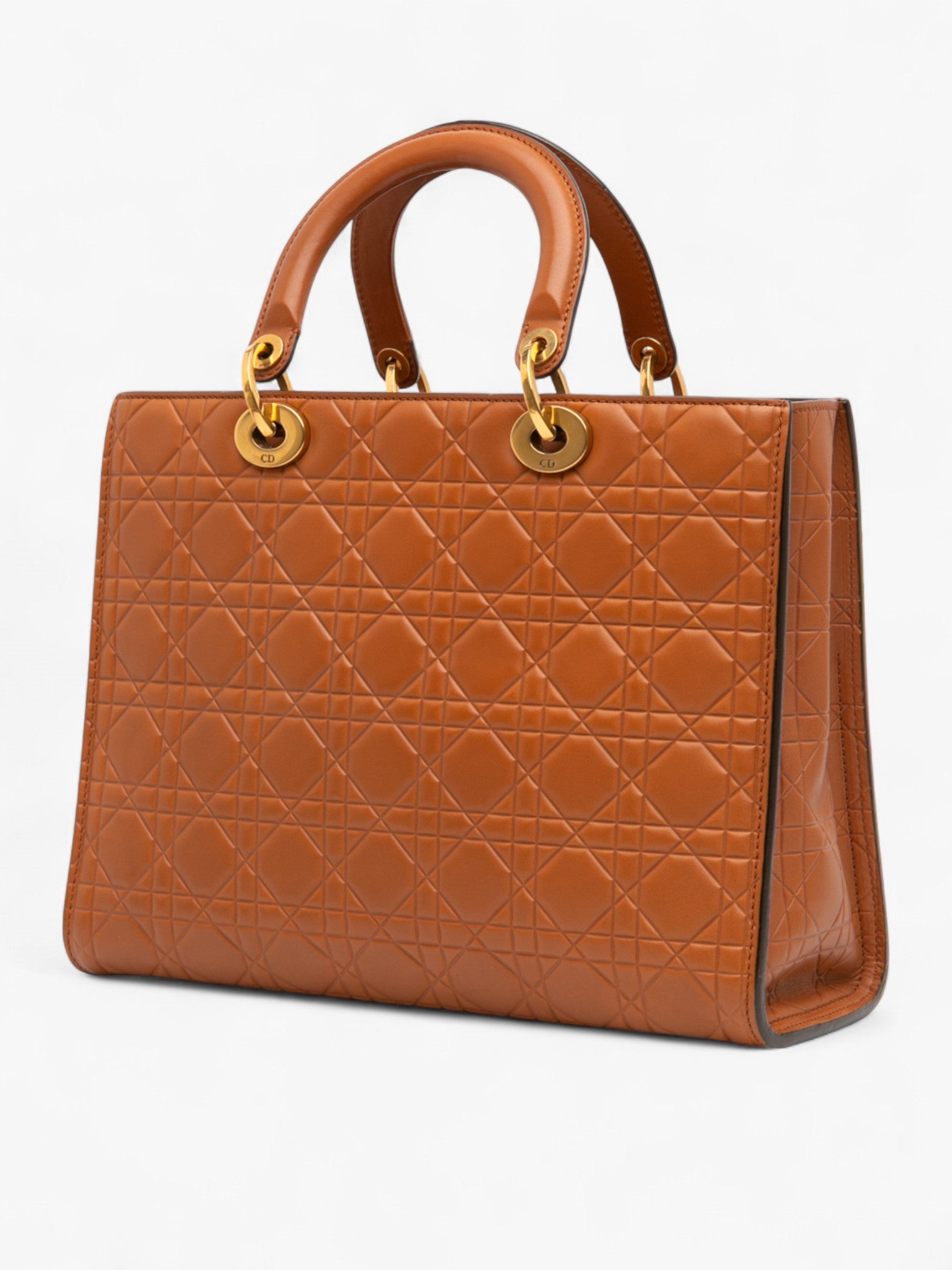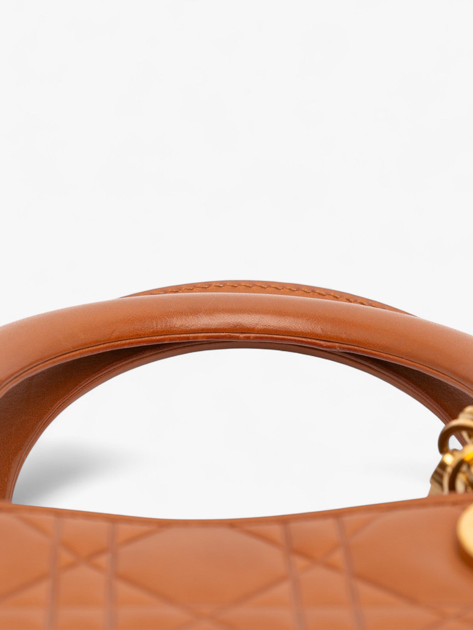 Чантата Dior Large Ultra Matte Calfskin Cannage Embossed Lady Dior е съвременна интерпретация на една от най-емблематичните творби на модна къща Dior. Изработена от релефна телешка кожа с характерния Cannage мотив в топъл кафяв нюанс, тя впечатлява с изчистена структура, матови метални елементи в същия тон и елегантна форма. Разполага с кожени дръжки, подвижна дълга каишка и горно капаче – съчетание на изтънченост, функционалност и неподвластен на времето парижки стил.