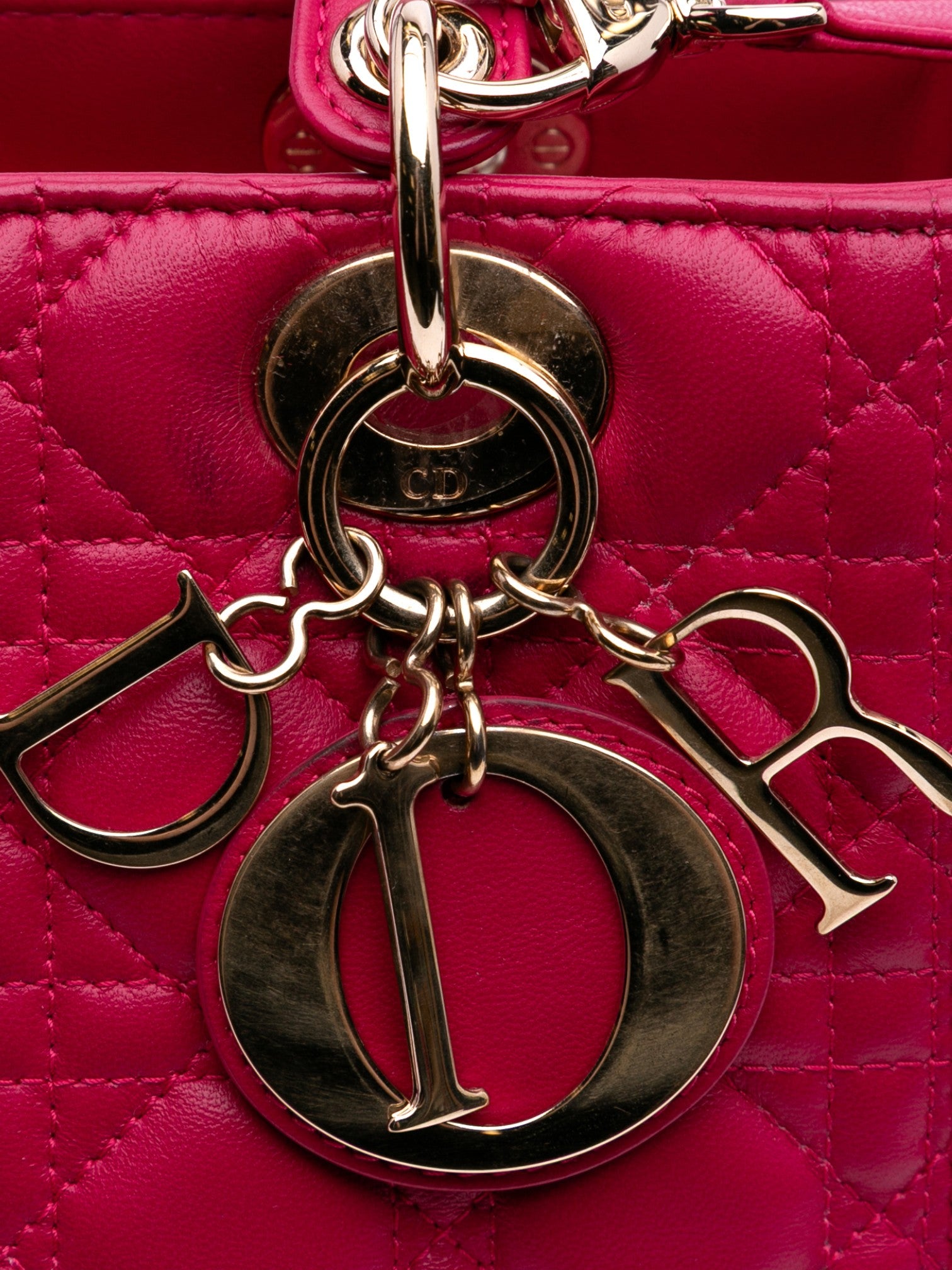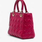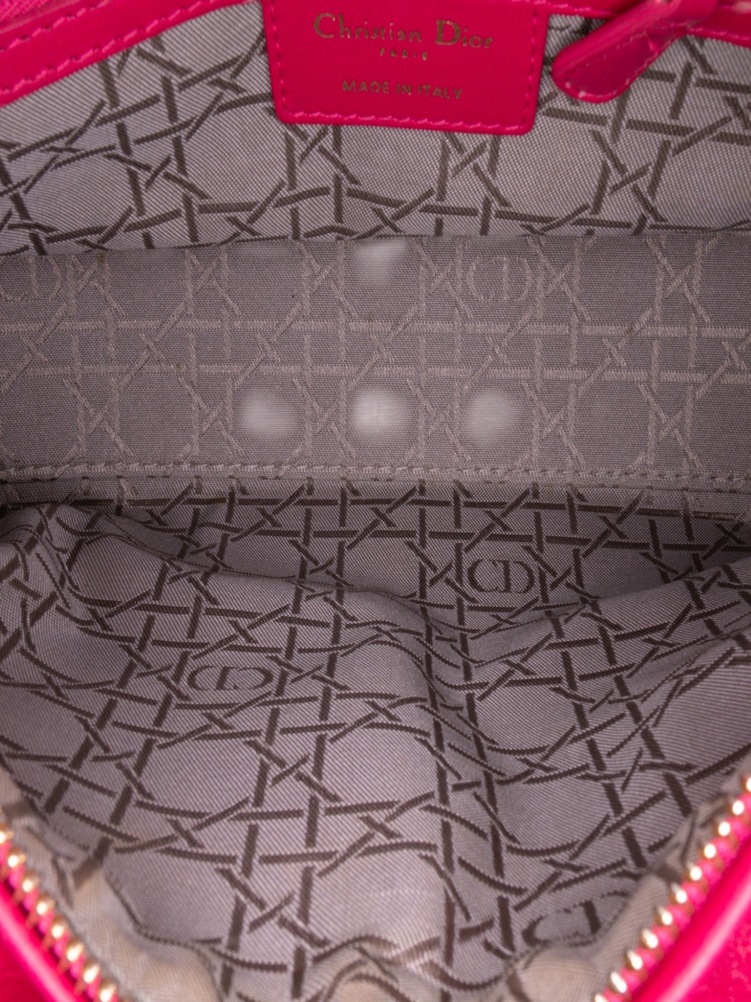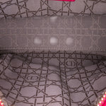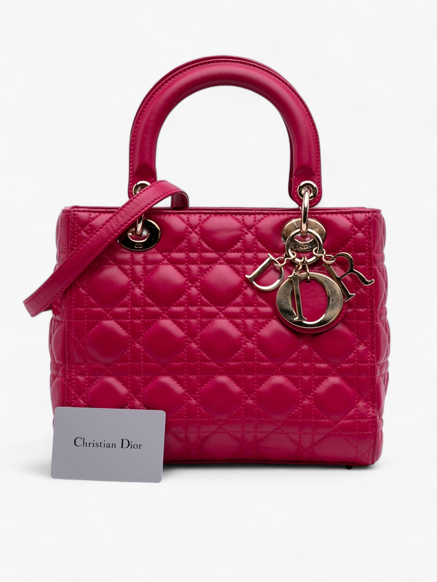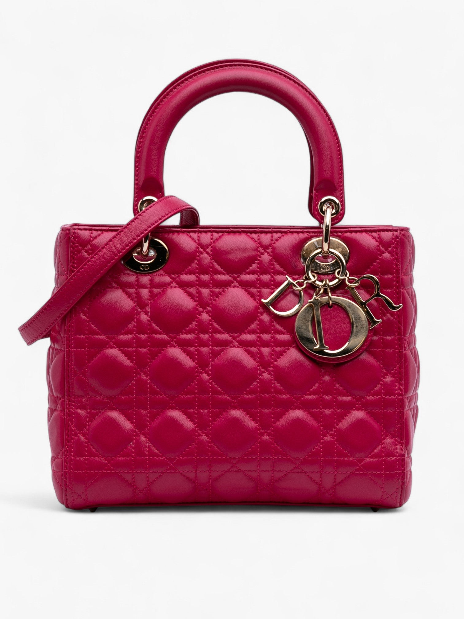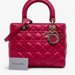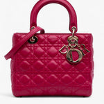 Чантата Dior Medium Lambskin Cannage Lady Dior в розов цвят е въплъщение на женственост, финес и изискан френски стил. Изработена от мека агнешка кожа с характерния капитониран мотив Cannage, тя впечатлява със своята елегантна структура, кожени дръжки, подвижна каишка и горно закопчаване с цип. Металните висулки с буквите Dior придават отличителен и луксозен завършек, който я прави подходяща както за ежедневието, така и за специални поводи.