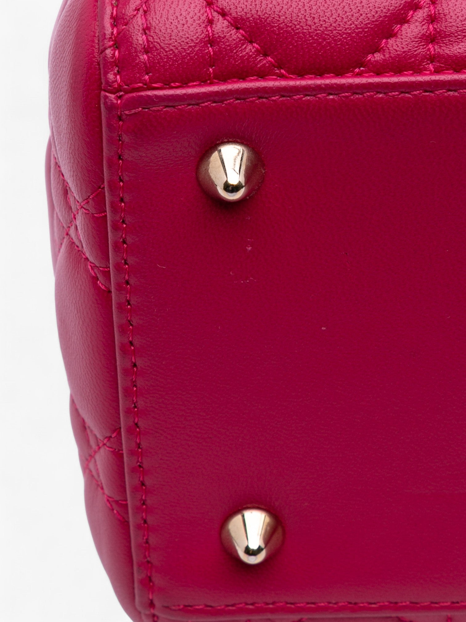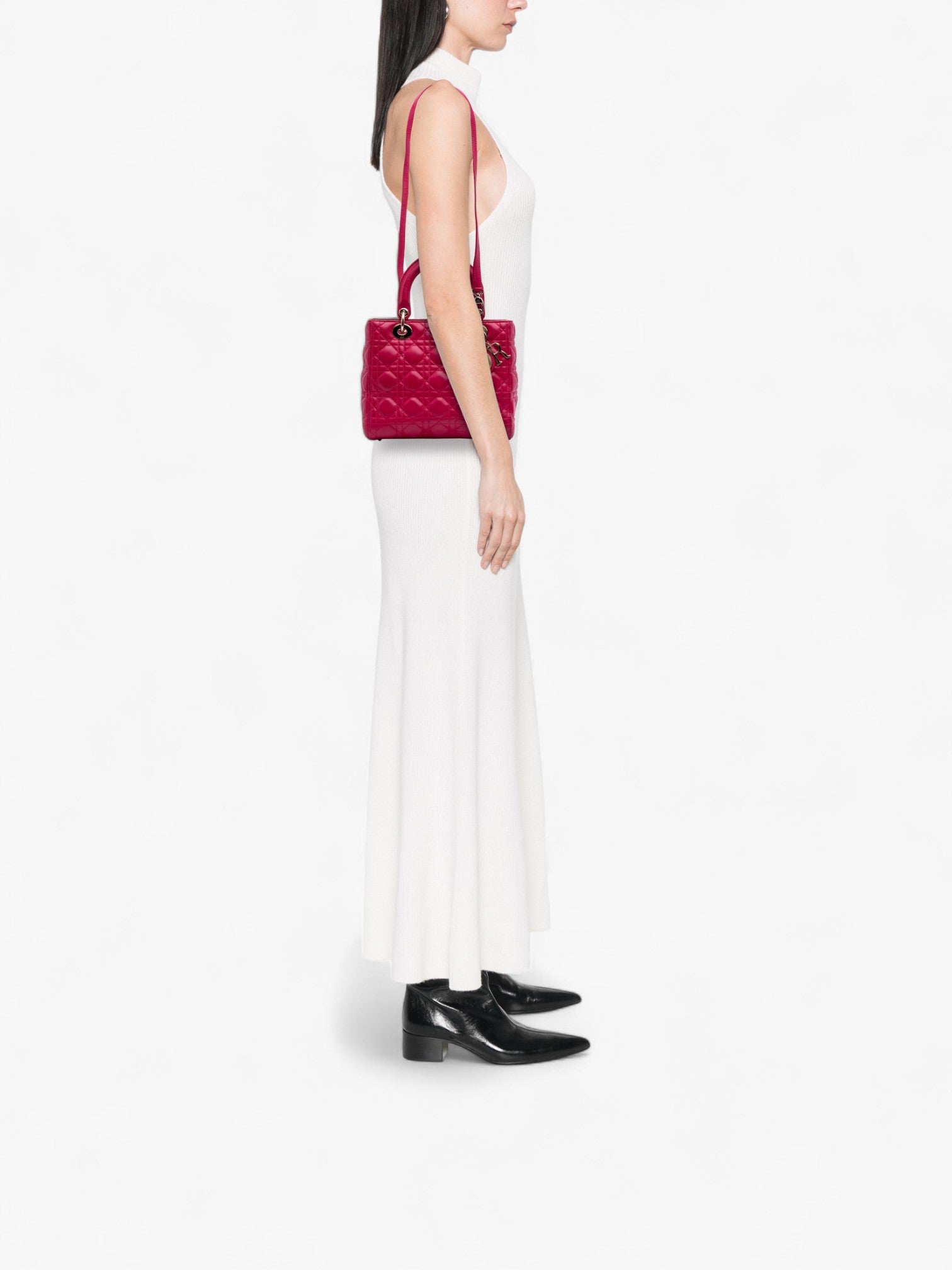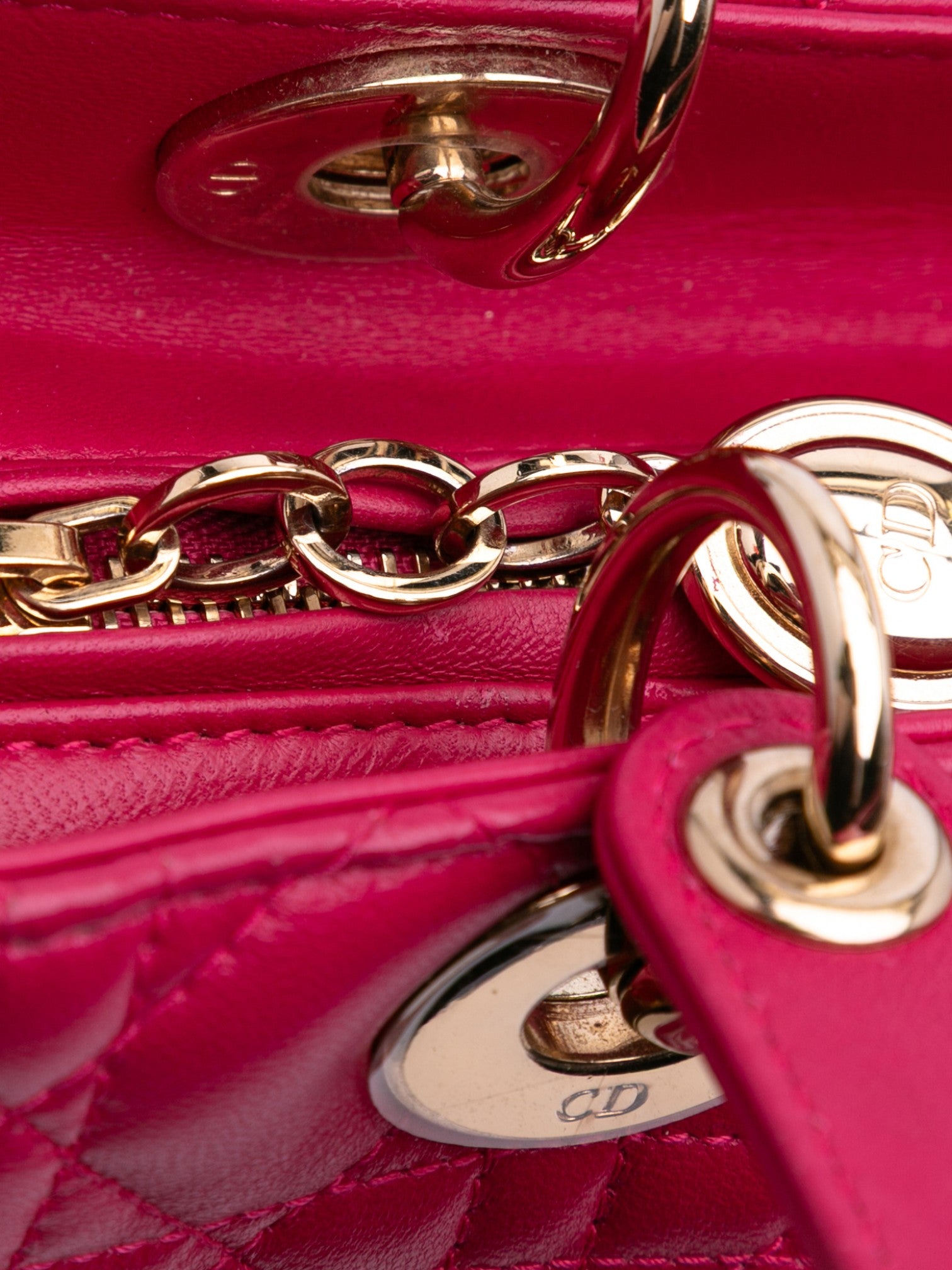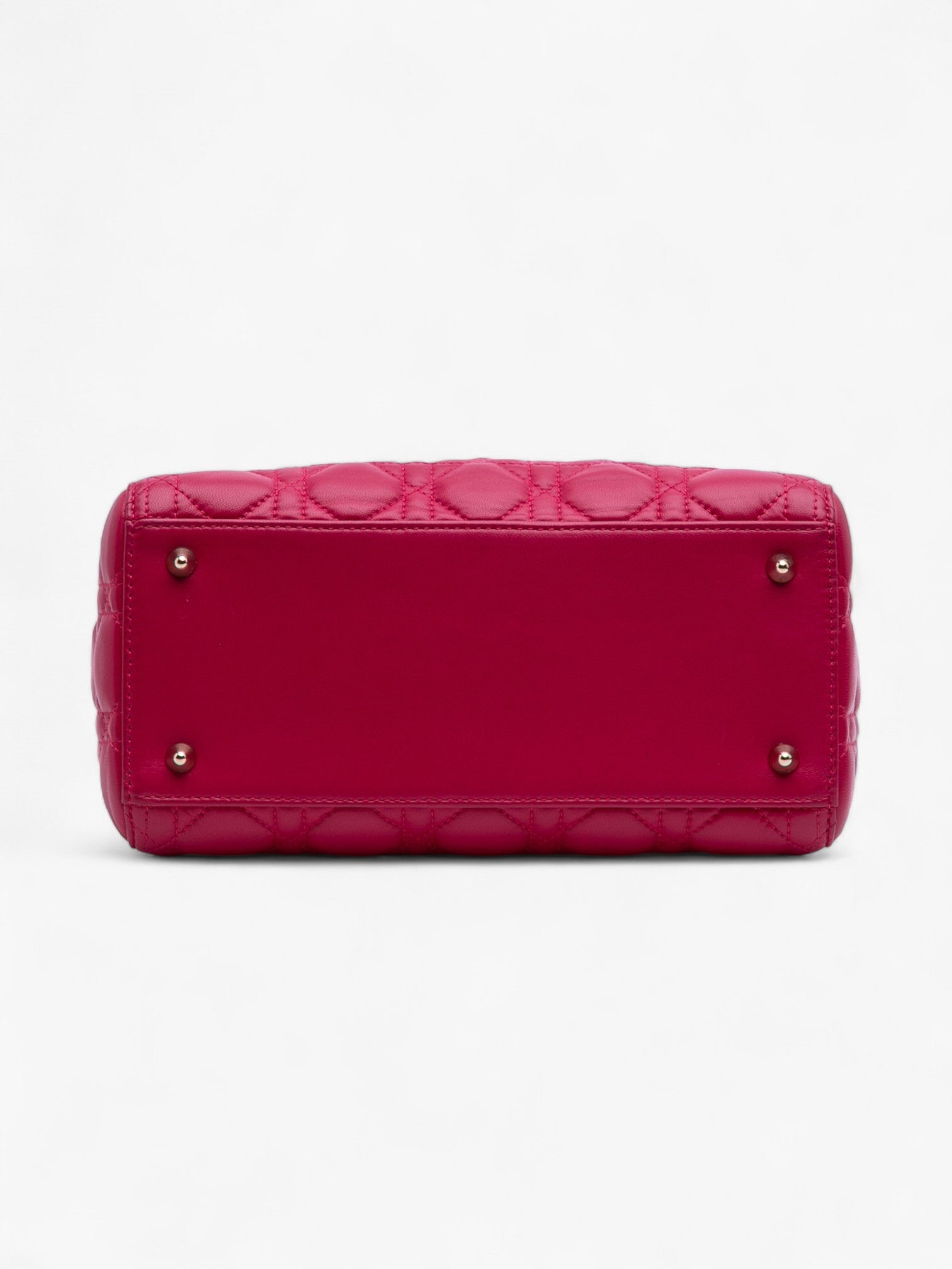 Чантата Dior Medium Lambskin Cannage Lady Dior в розов цвят е въплъщение на женственост, финес и изискан френски стил. Изработена от мека агнешка кожа с характерния капитониран мотив Cannage, тя впечатлява със своята елегантна структура, кожени дръжки, подвижна каишка и горно закопчаване с цип. Металните висулки с буквите Dior придават отличителен и луксозен завършек, който я прави подходяща както за ежедневието, така и за специални поводи.