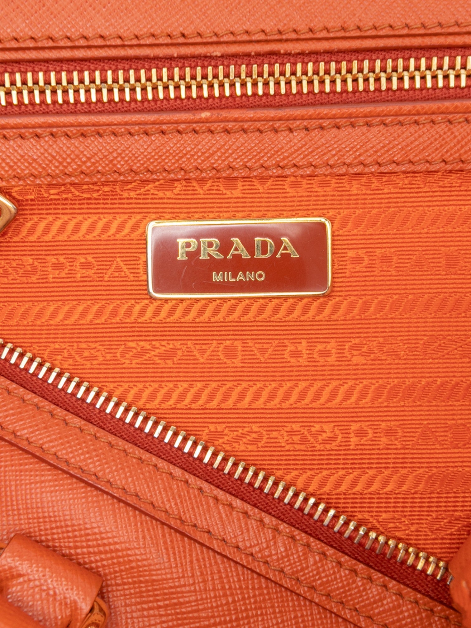 Чантата Prada Saffiano Lux Bauletto Satchel е елегантен и структуриран модел, който олицетворява италианския лукс и изтънченост. Изработена от устойчива кожа Saffiano в наситен оранжев нюанс, тя впечатлява с кожени дръжки, подвижна и регулируема каишка и горно закопчаване с цип. Просторният интериор с джобове осигурява удобство и организация, а златистите метални елементи придават класически и изискан завършек.