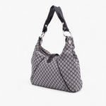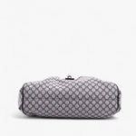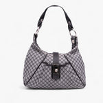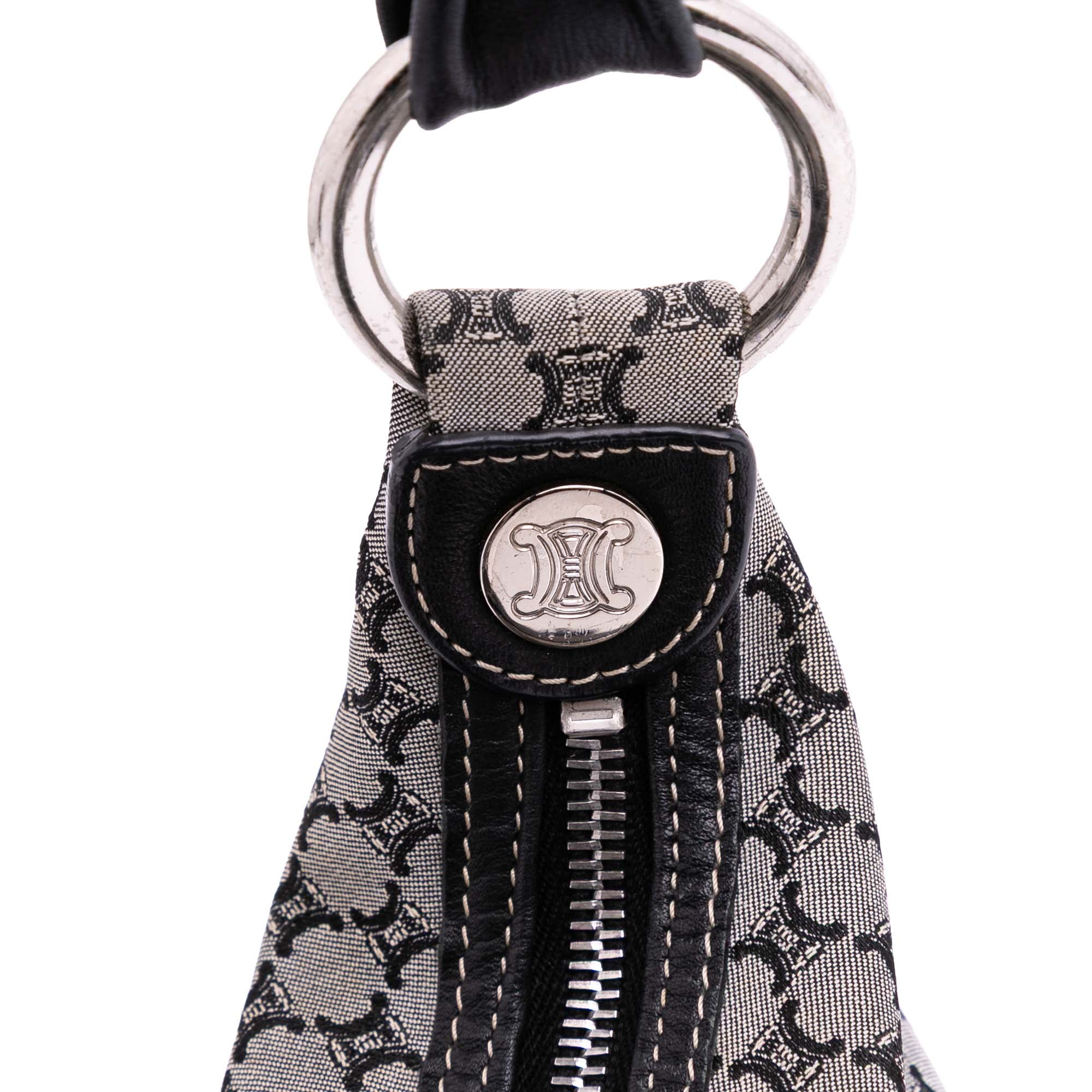 The Celine Macadam Canvas Shoulder Bag features a gray canvas body with leather trim, a flat leather shoulder strap, a top zip closure with strap and metal buckle detail, an exterior slip pocket, and an interior zip pocket. A vintage piece showcasing Celine’s classic Macadam motif.