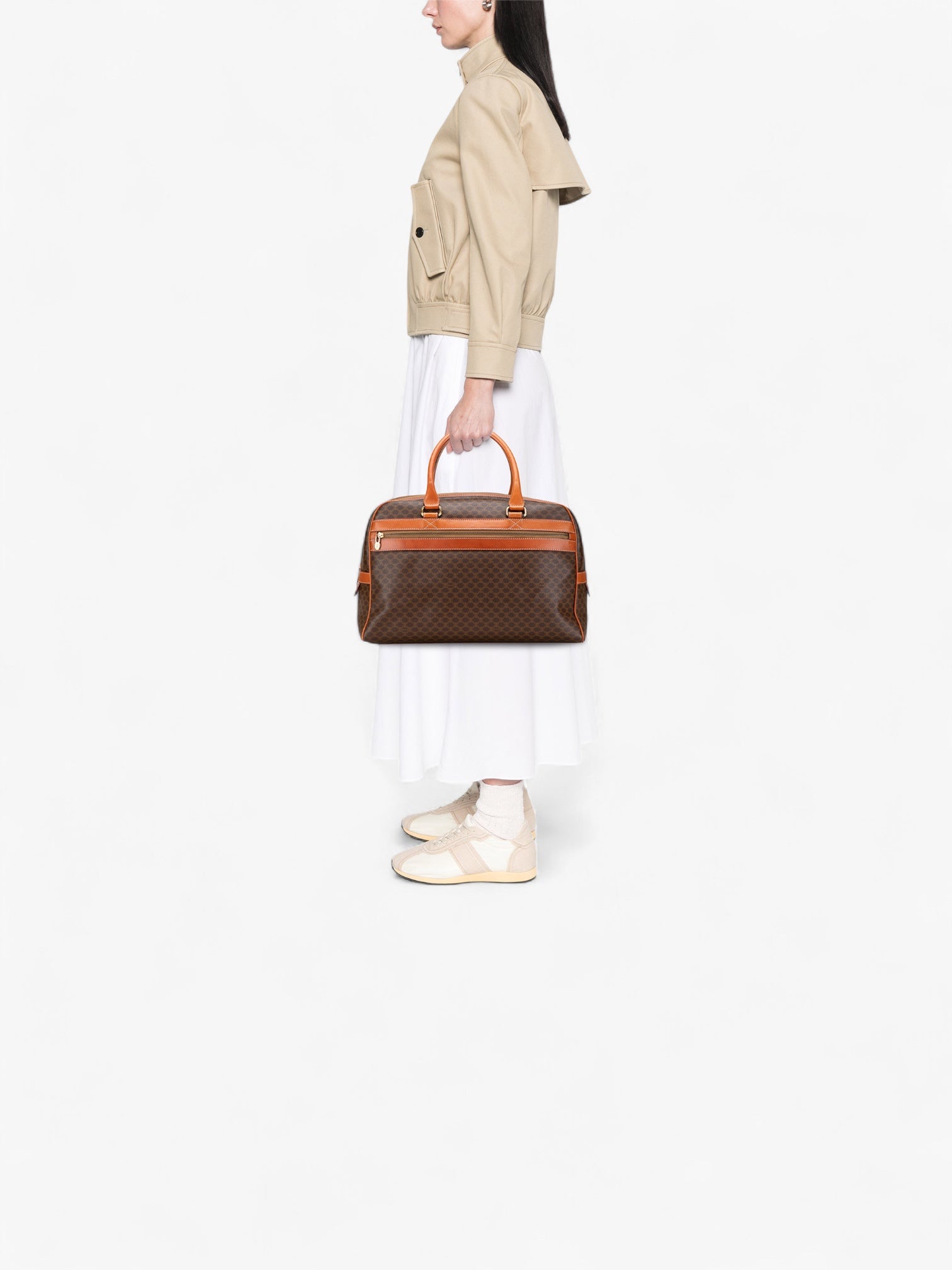 The Céline Macadam Coated Canvas Duffle Bag is a refined travel essential that blends durability with classic style. Crafted from coated canvas with leather trim, it features rolled leather handles, a secure top zip closure, and an exterior front zip compartment for easy access. Perfect for short trips or as an elegant carry-on.