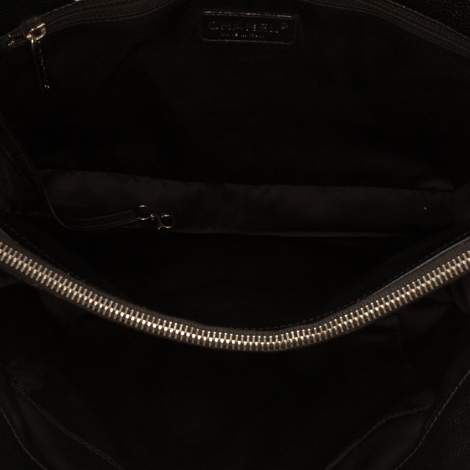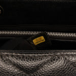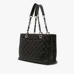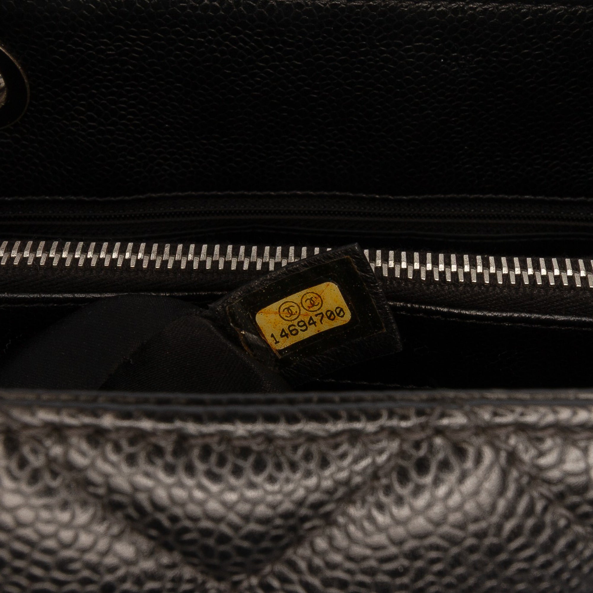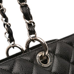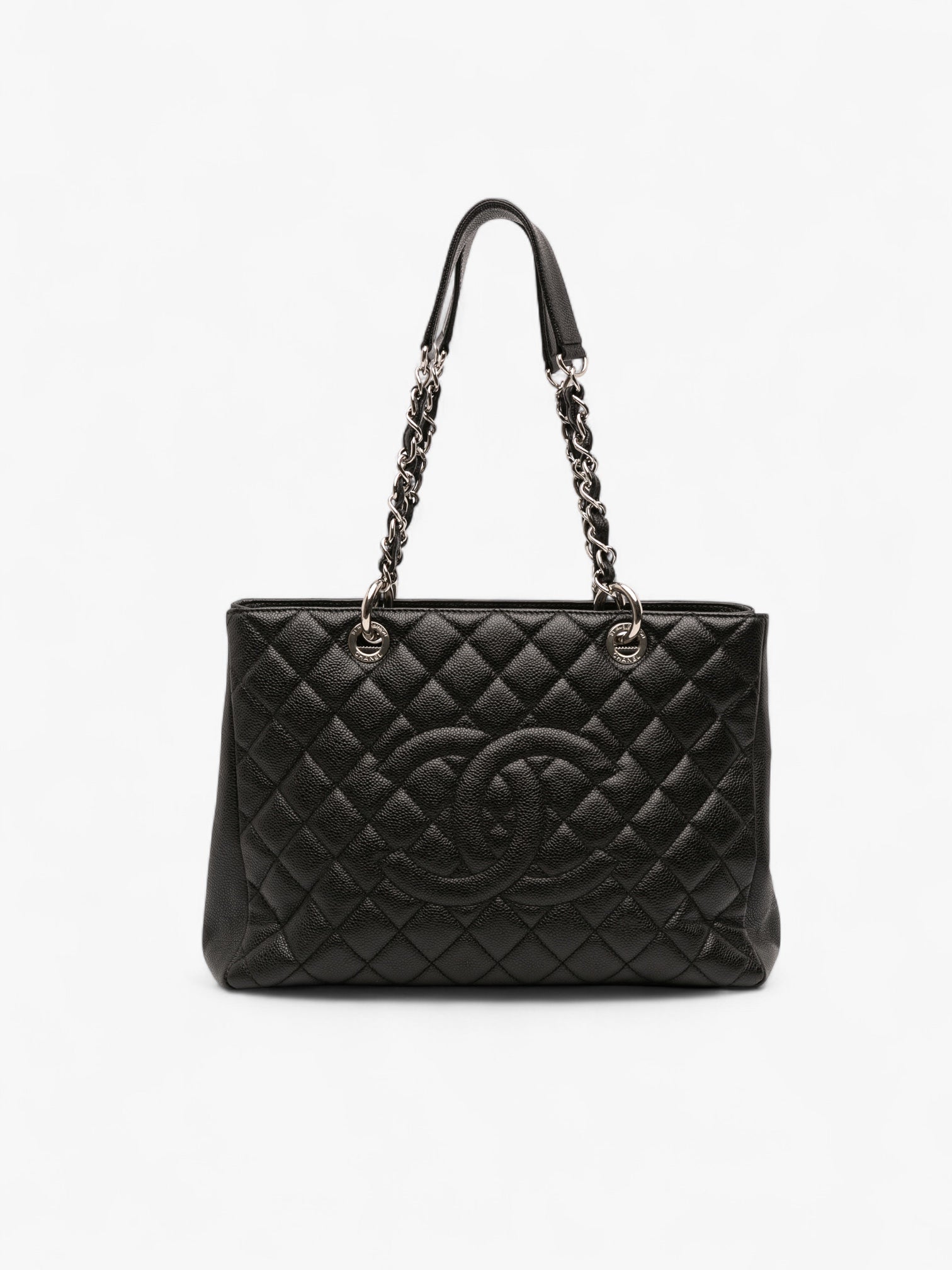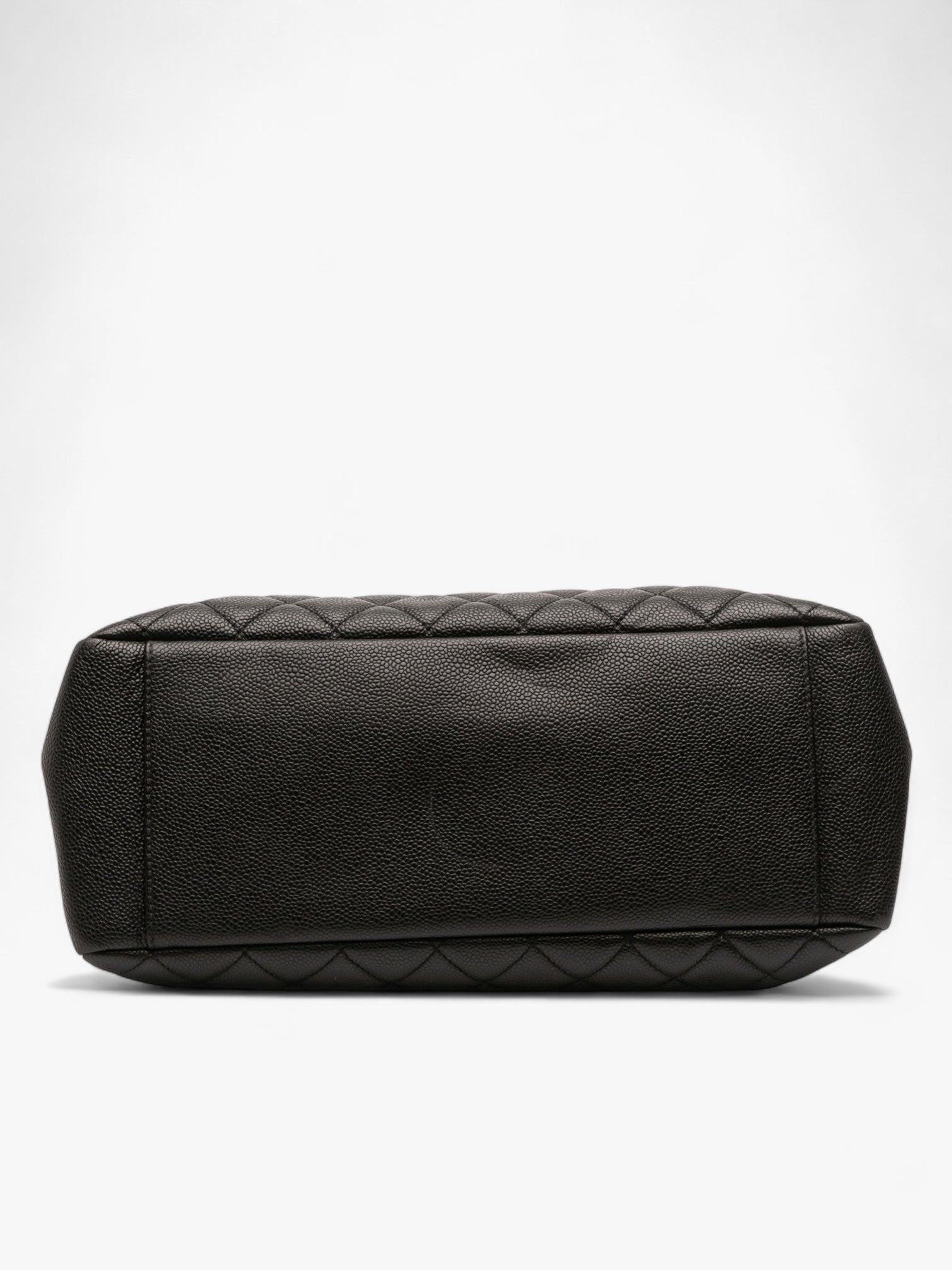The Chanel Grand Shopping Tote is a timeless and practical piece, crafted in luxurious black Caviar leather. It features quilted construction, leather-woven chain shoulder straps, an open top with interior zip compartment, and both exterior and interior slip pockets for added convenience. A highly sought-after classic for everyday elegance.