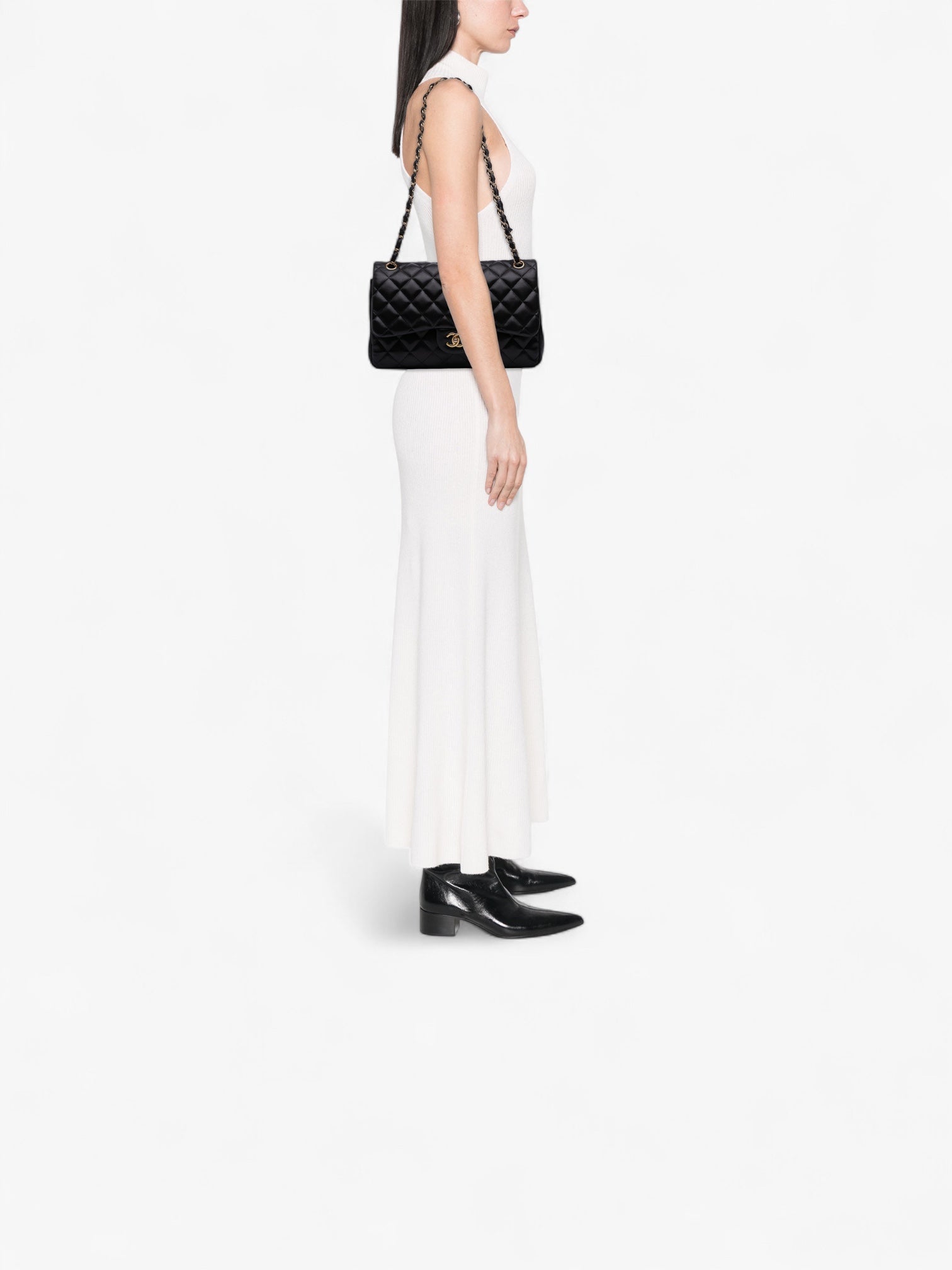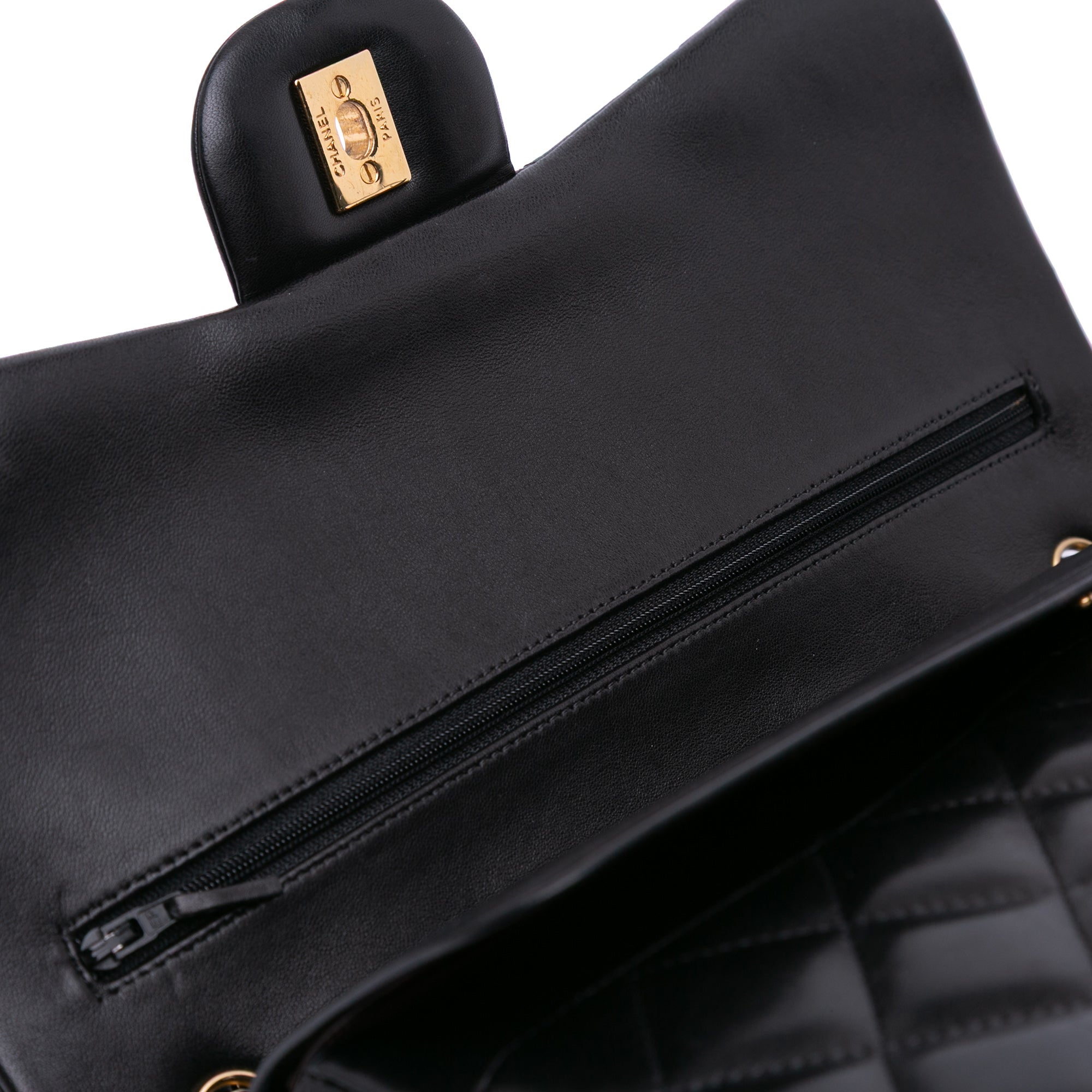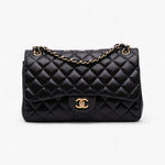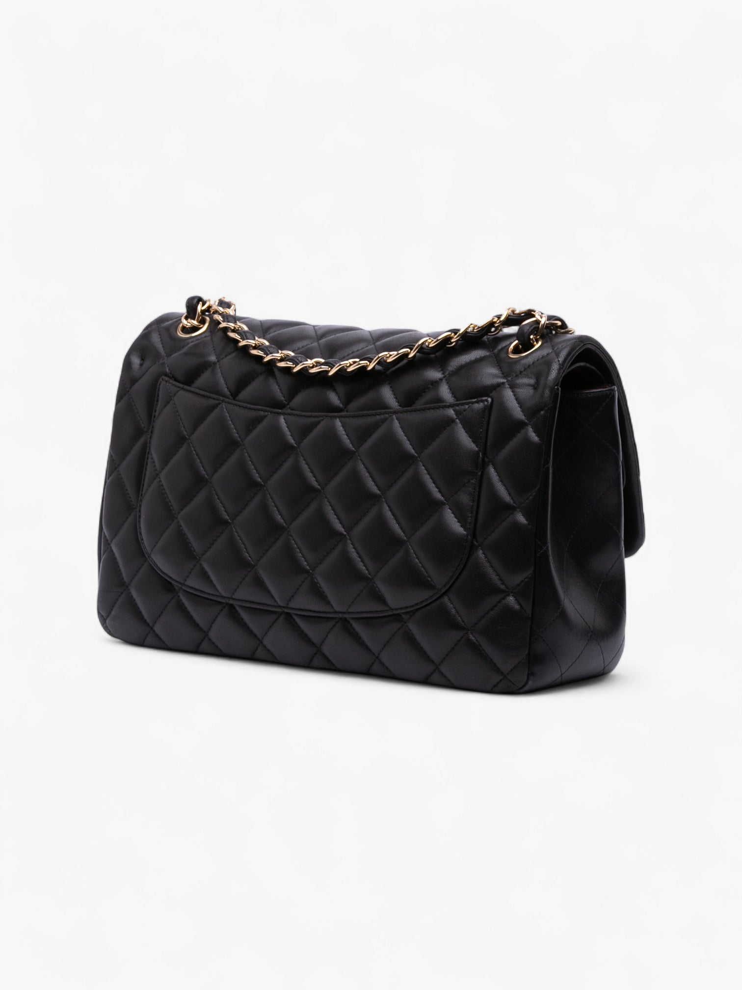 The Chanel Jumbo Classic Double Flap in luxurious black lambskin is a timeless statement of elegance. Featuring the signature diamond quilting, CC turn-lock closure, and versatile leather-woven chain straps, this iconic bag transitions effortlessly from day to night. The spacious double-flap design includes multiple pockets, offering both functionality and enduring sophistication.