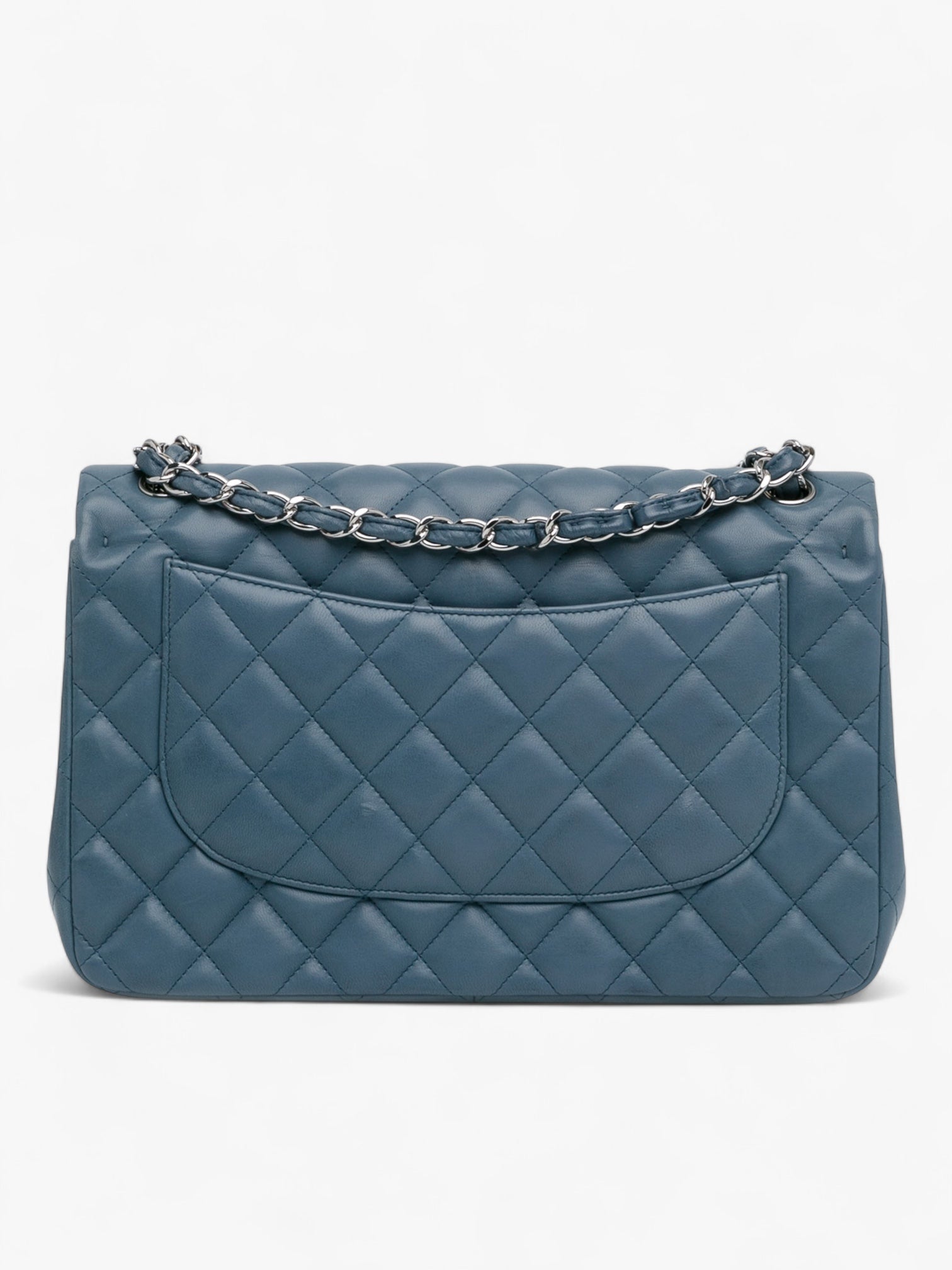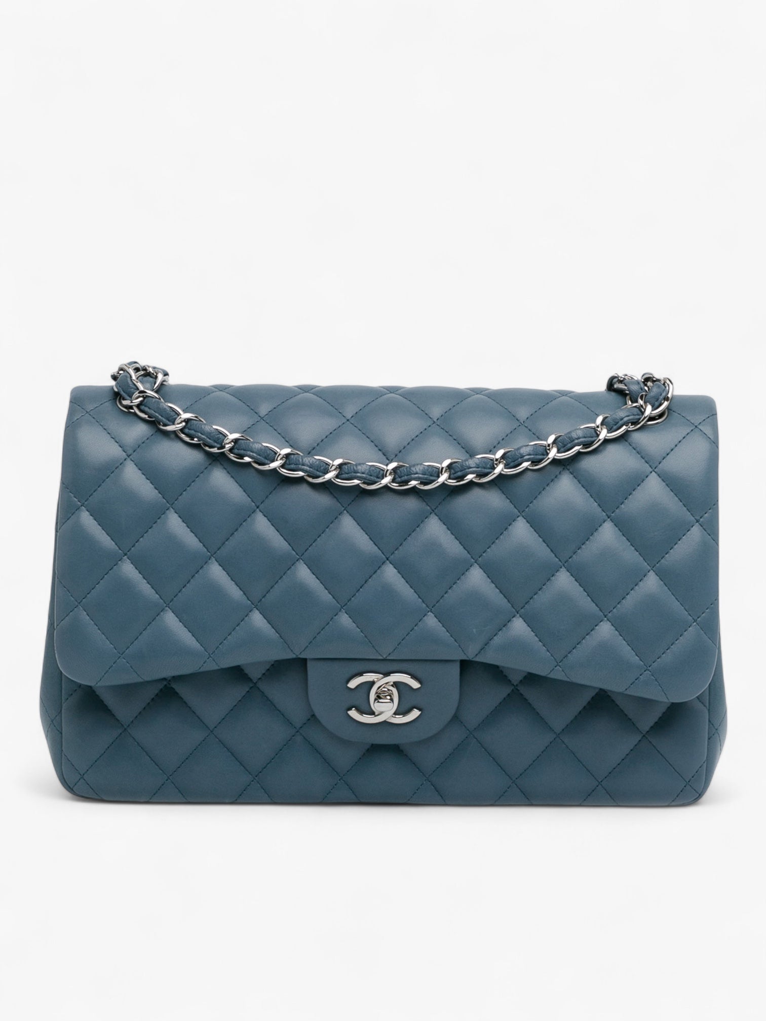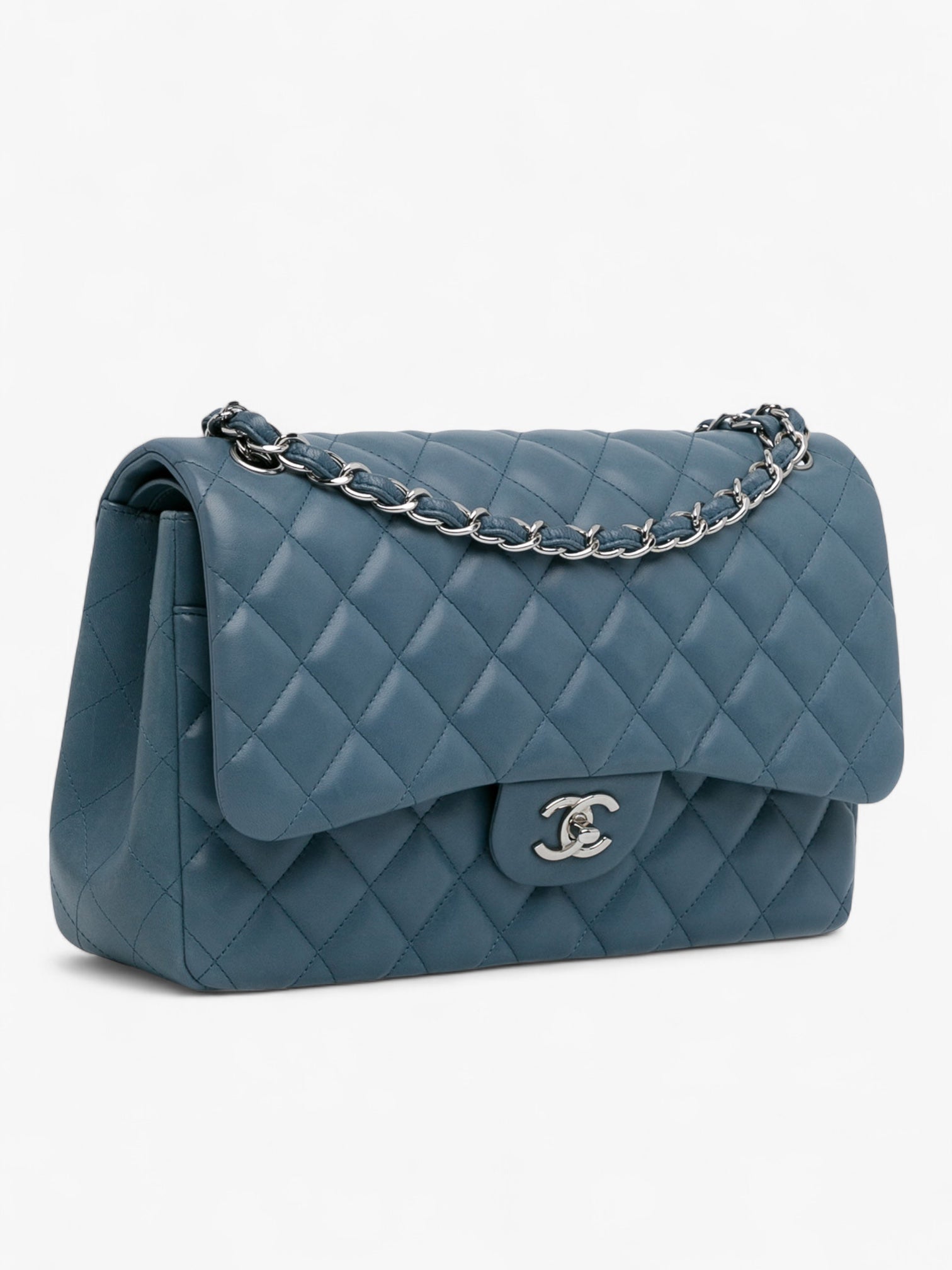 A timeless icon of the Chanel house, the Jumbo Classic Double Flap in lambskin leather embodies elegance and versatility. This structured blue version features the signature diamond quilting, double front flaps with CC turn-lock closure, an exterior slip pocket, and a leather-woven chain strap. Its spacious interior and refined craftsmanship make it a perfect choice for both day and evening wear.