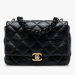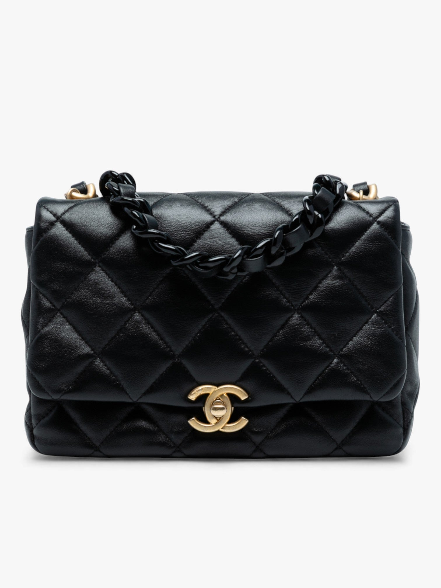 Introducing the exquisite Mini Quilted Lambskin Lacquered Chain Flap, a stunning creation from a renowned luxury brand that embodies sophistication and timeless style. This elegant flap features a beautifully quilted lambskin leather body, enhanced by a leather woven lacquered chain link strap that adds a touch of modernity. The front flap is secured with a twist lock closure, ensuring both security and ease of access, while the interior slip pocket offers practical functionality. With its sleek silhouette and versatile black color, this piece is the perfect companion for both day and evening occasions, making it a must-have for the discerning fashion enthusiast.