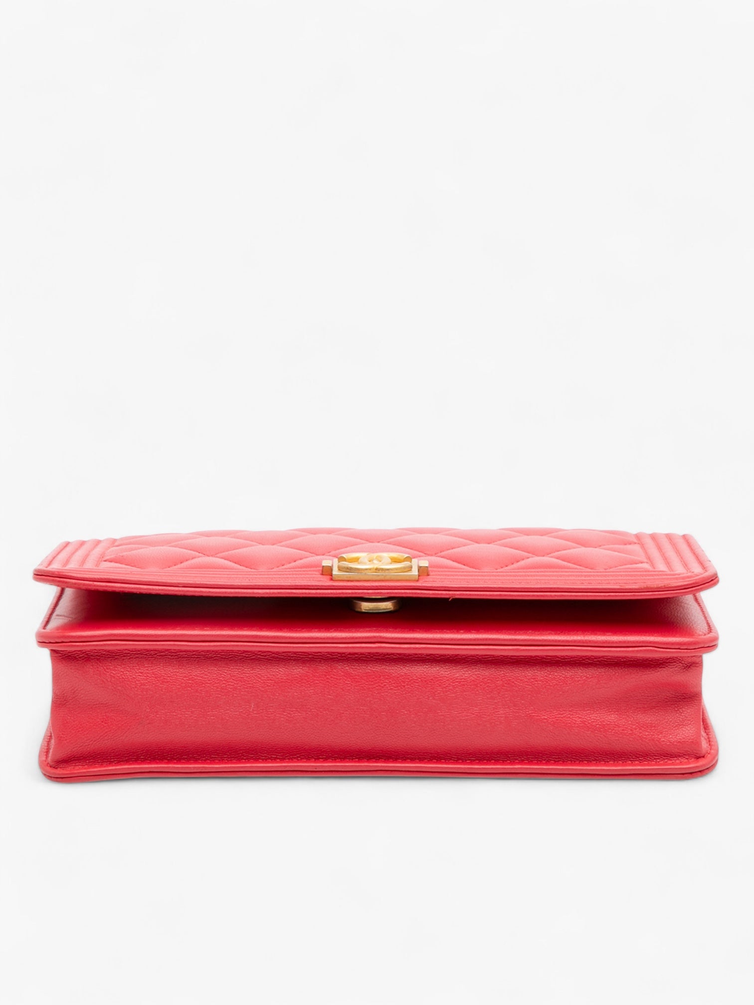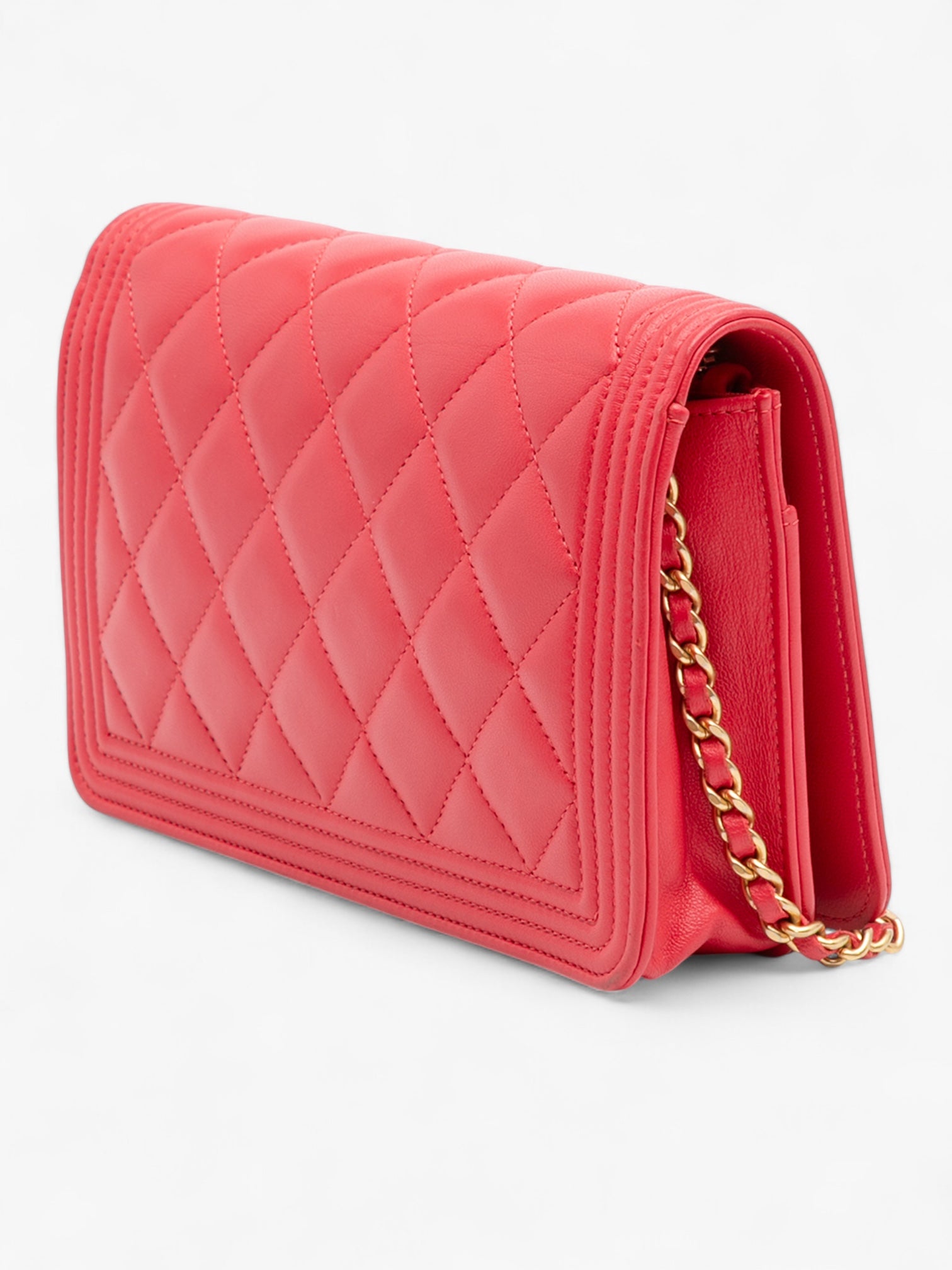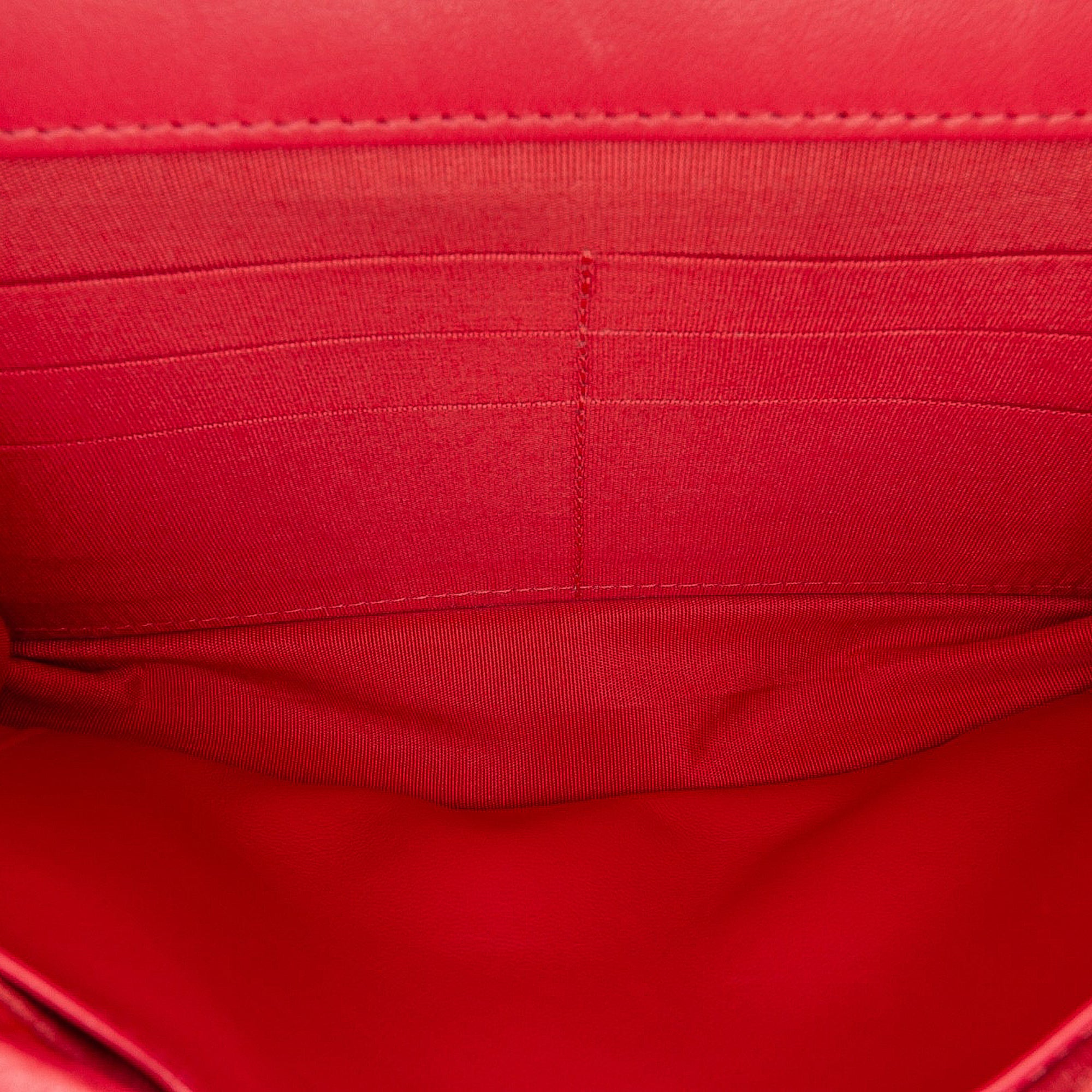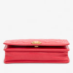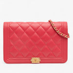 The Chanel Quilted Caviar Boy Wallet on Chain features a durable caviar leather body in red, a leather-woven chain strap, a front flap with signature Boy push-lock closure, and an interior with zip and slip pockets. A compact yet iconic WOC, perfect for both day and evening wear.