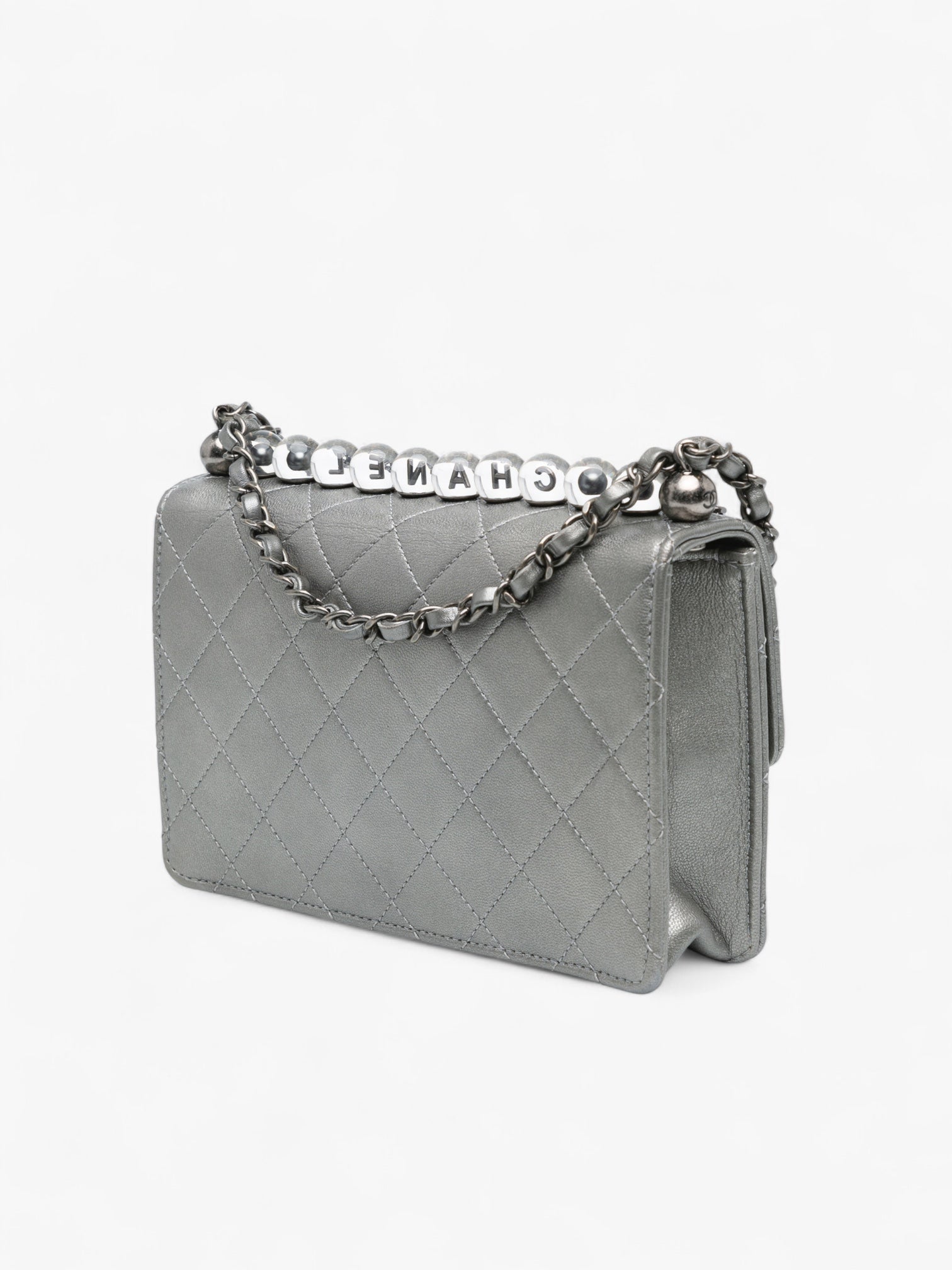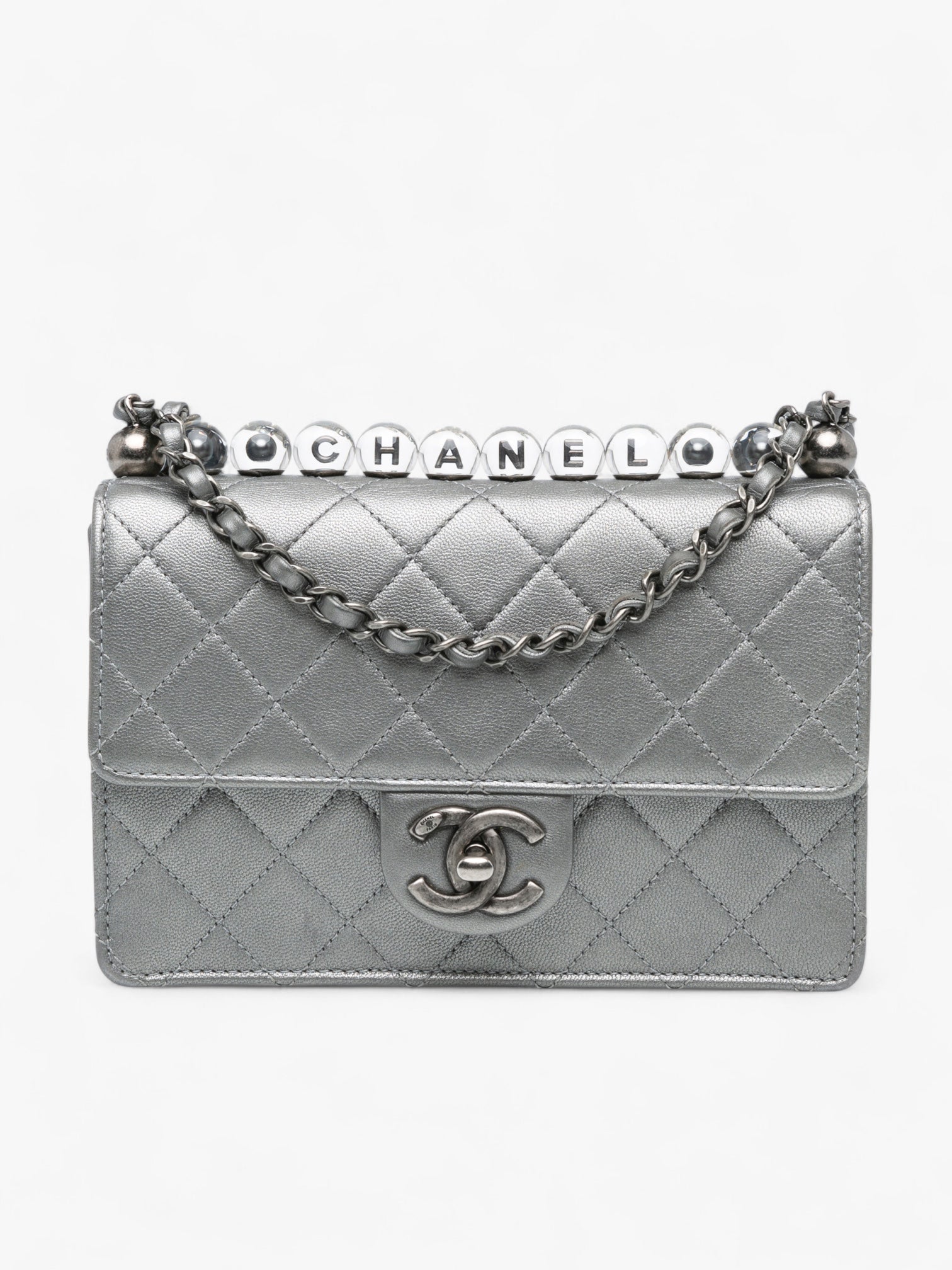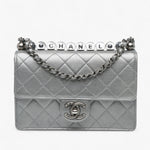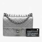 The Chanel Small Metallic Goatskin Chic Pearls Flap is a rare and elegant piece, crafted in quilted metallic goatskin leather with signature faux pearl details spelling out “CHANEL.” It features a leather-woven chain strap with a flat leather shoulder guard, a CC turn-lock closure on the front flap, and a practical interior with slip pockets. A sophisticated statement bag with a modern twist.