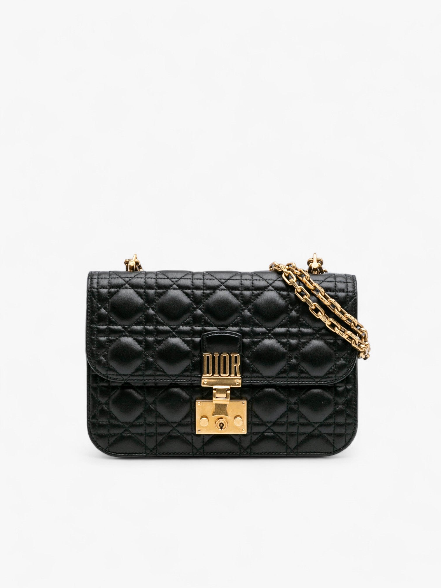 The DiorAddict flap bag is a modern reinterpretation of the house’s classic elegance, crafted in soft black lambskin with Dior’s signature cannage quilting. Finished with chain-link straps and a structured push-lock flap closure, this versatile piece can be styled both crossbody and on the shoulder. The medium size offers functionality without losing its chic appeal, making it a timeless addition to any collection.