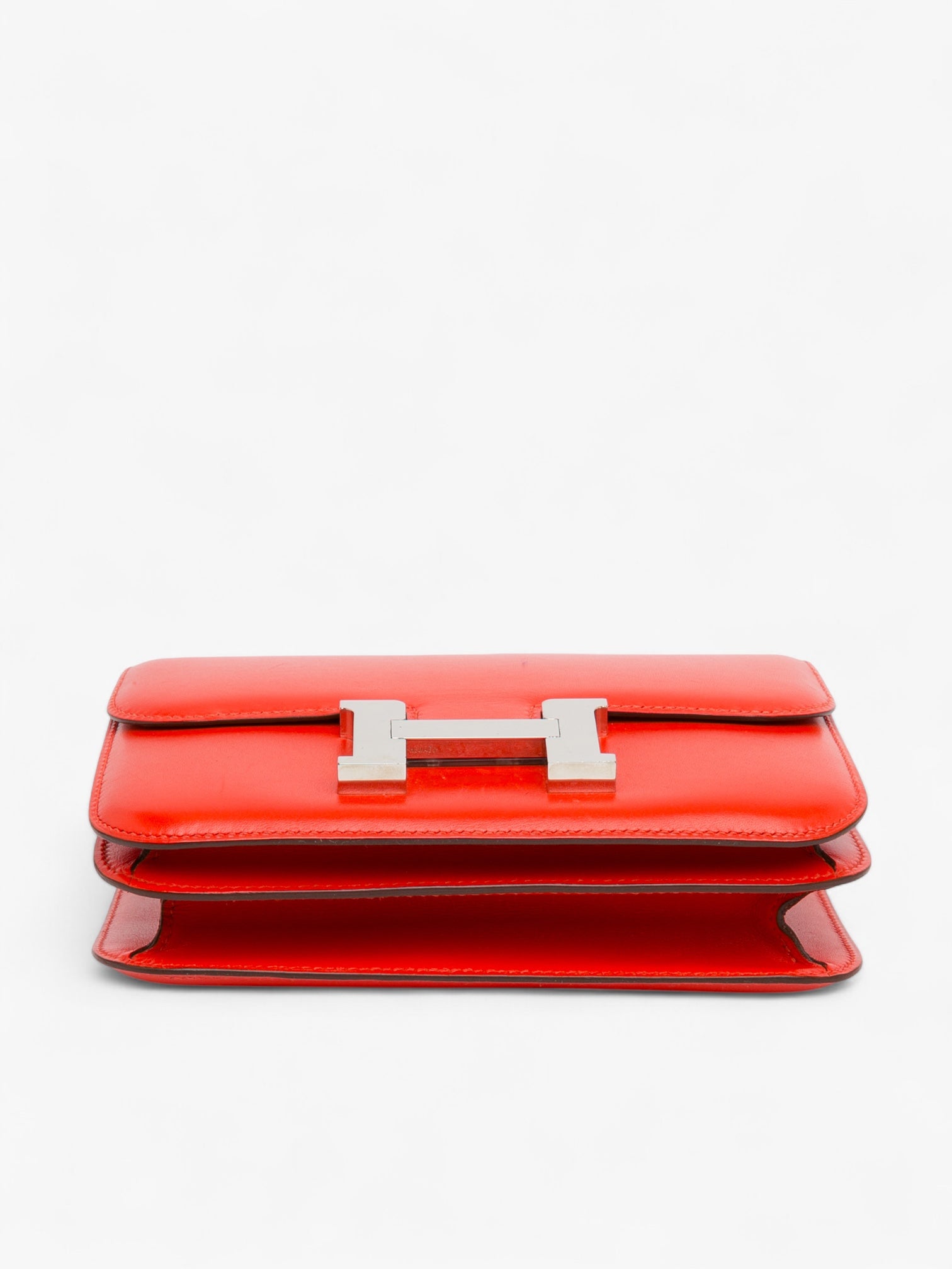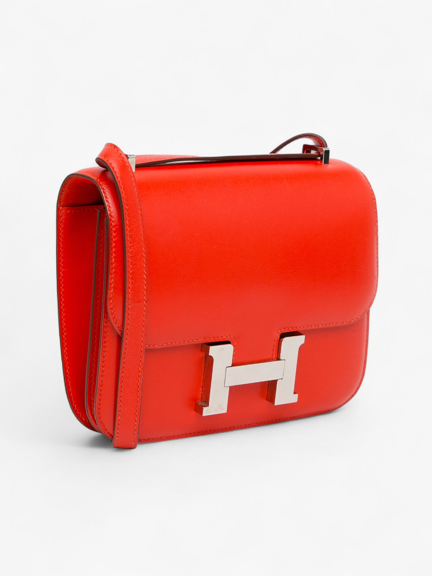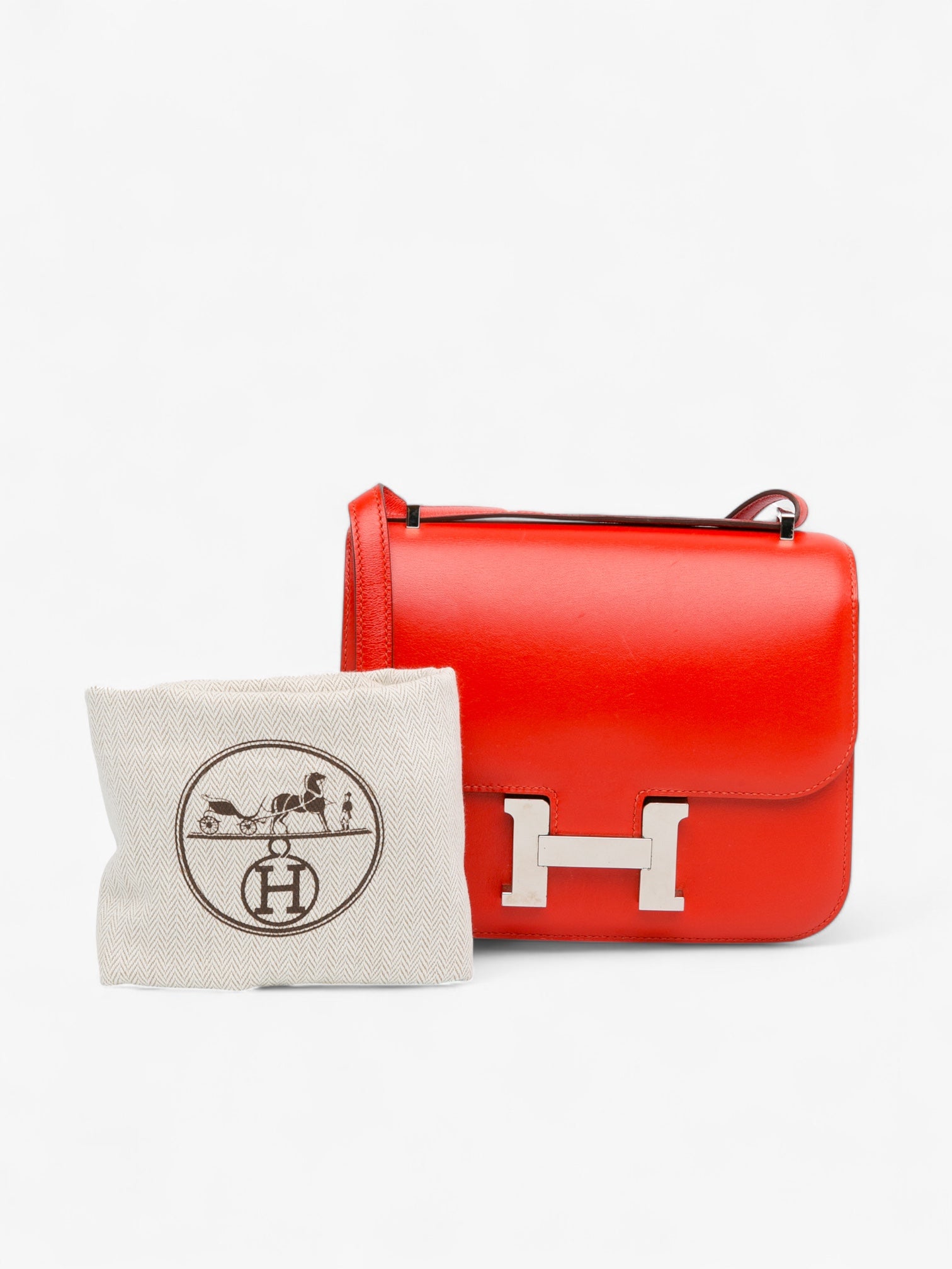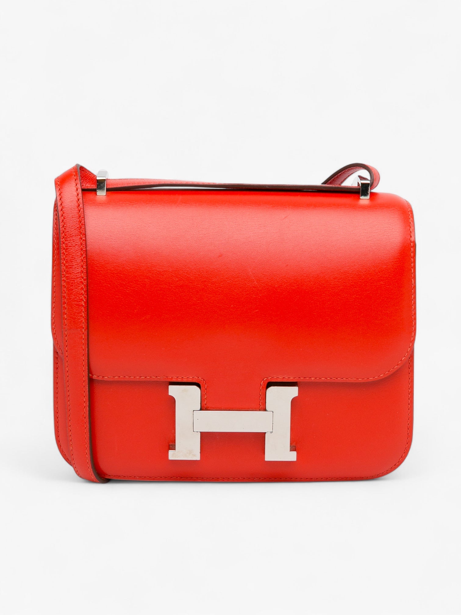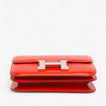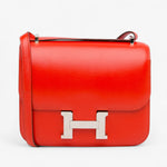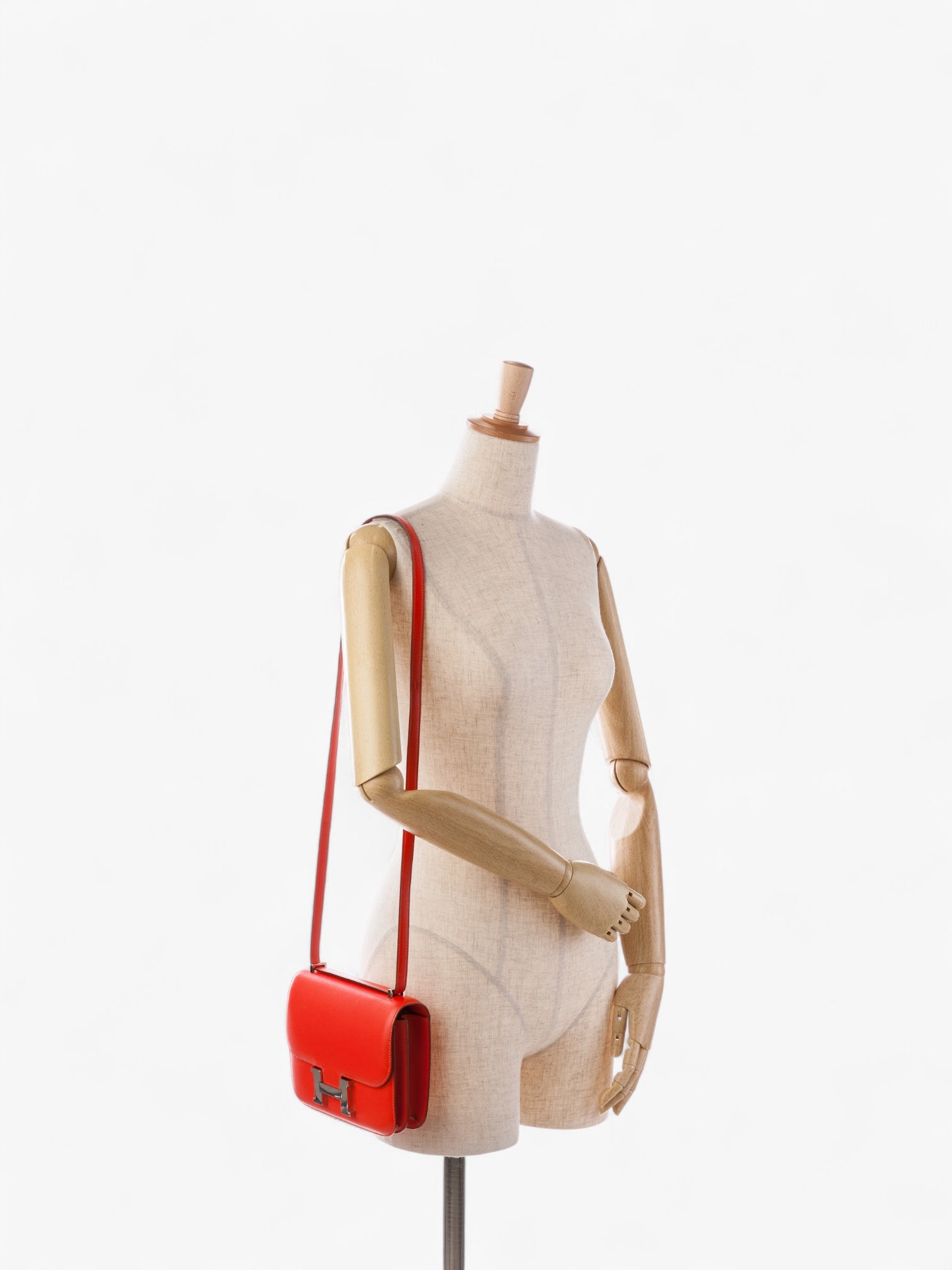 An icon of refined minimalism, the Hermès Mini Tadelakt Constance 18 features luminous Rouge Tomate Tadelakt calfskin and the signature H clasp. The adjustable strap allows shoulder or crossbody wear, while the sleek interior offers slip pockets for effortless organization. A collectible piece with timeless poise.