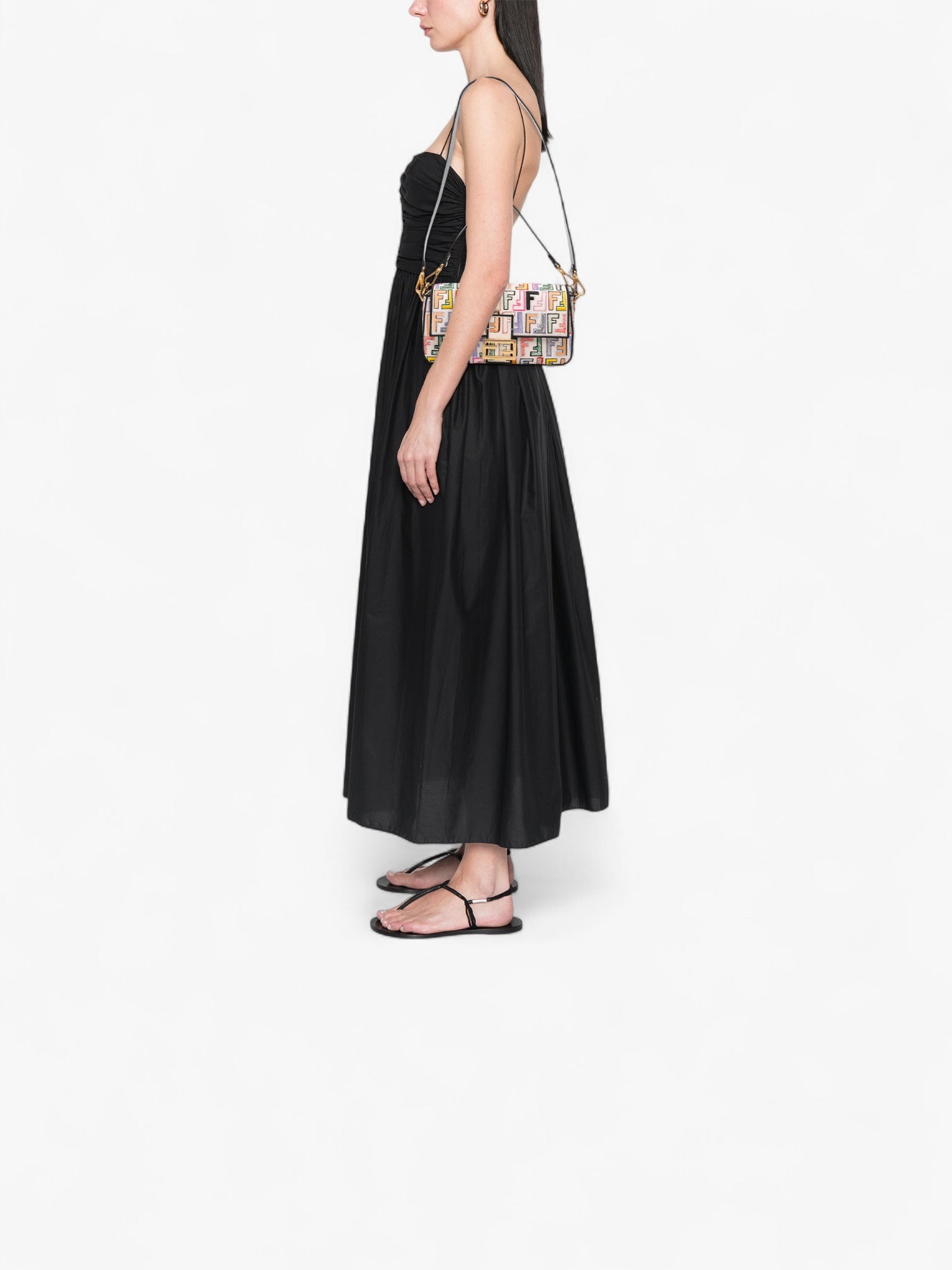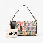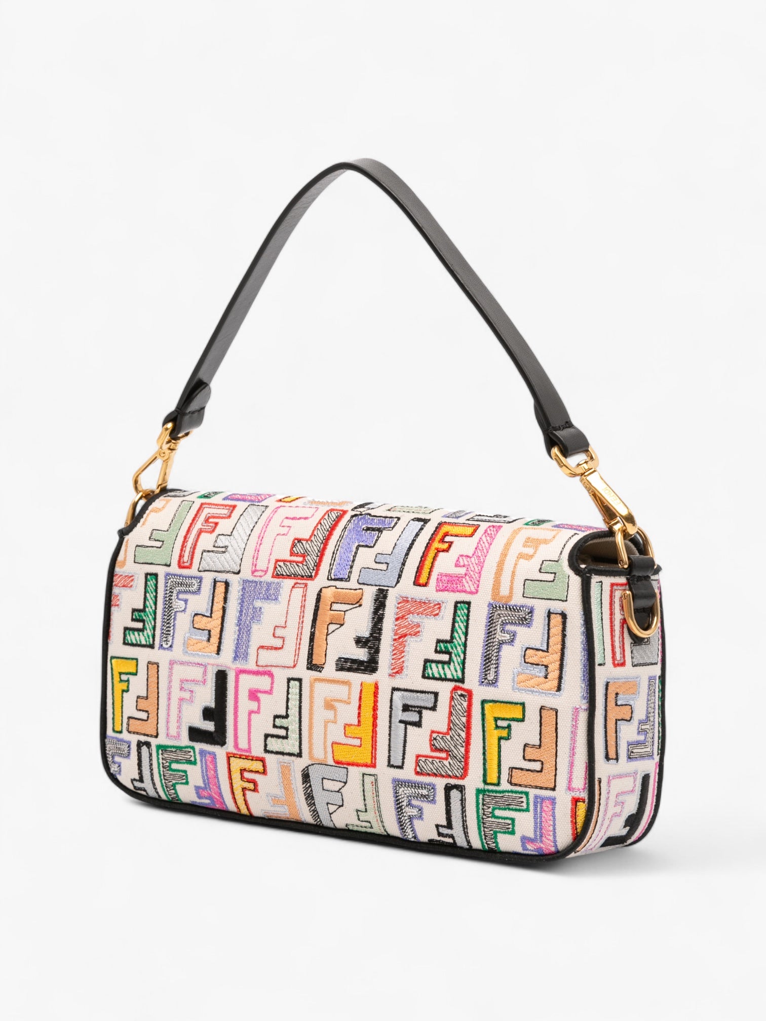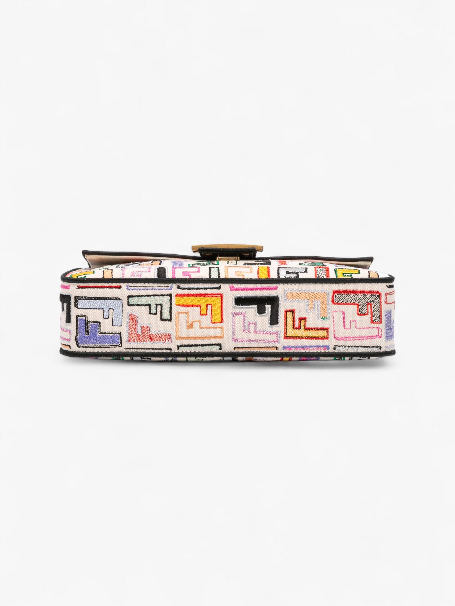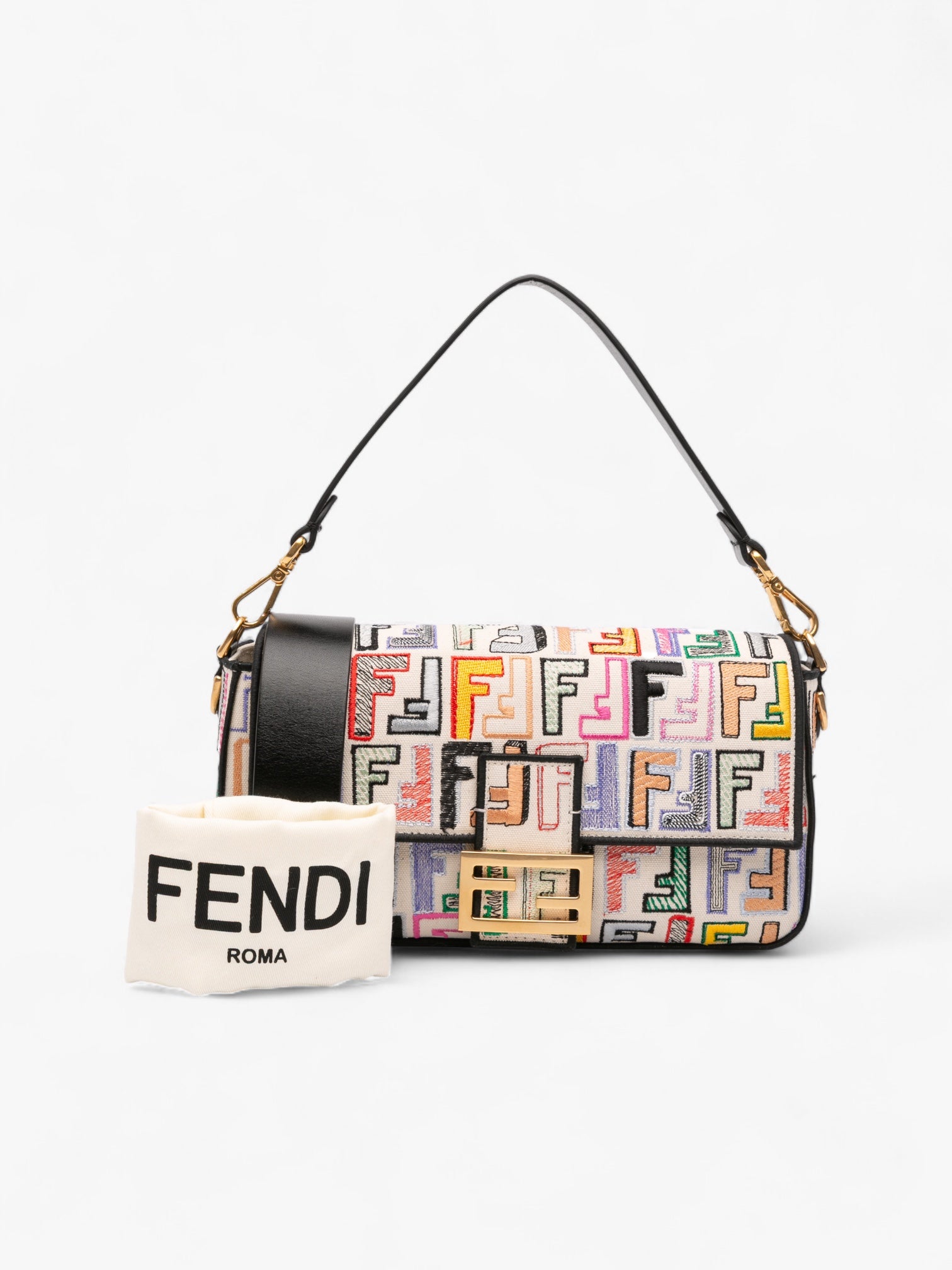 The Fendi Chinese Valentine’s Day Zucca Embroidered Canvas Baguette Satchel is a vibrant special edition that celebrates love with playful multicolor Zucca embroidery. Featuring a detachable leather top handle, a detachable shoulder strap, and a front flap with magnetic snap closure, it offers versatility and charm. Compact yet functional, it includes an interior zip pocket for everyday essentials.