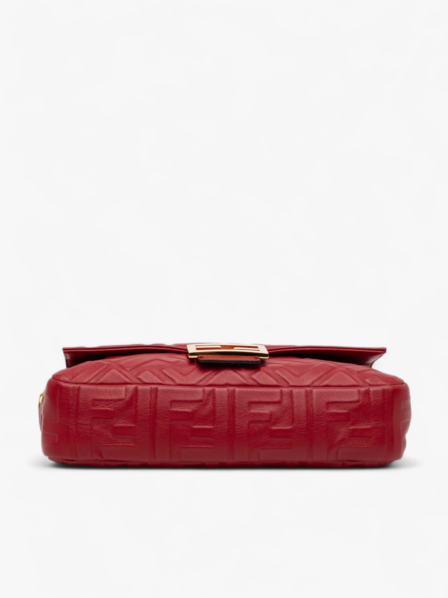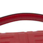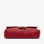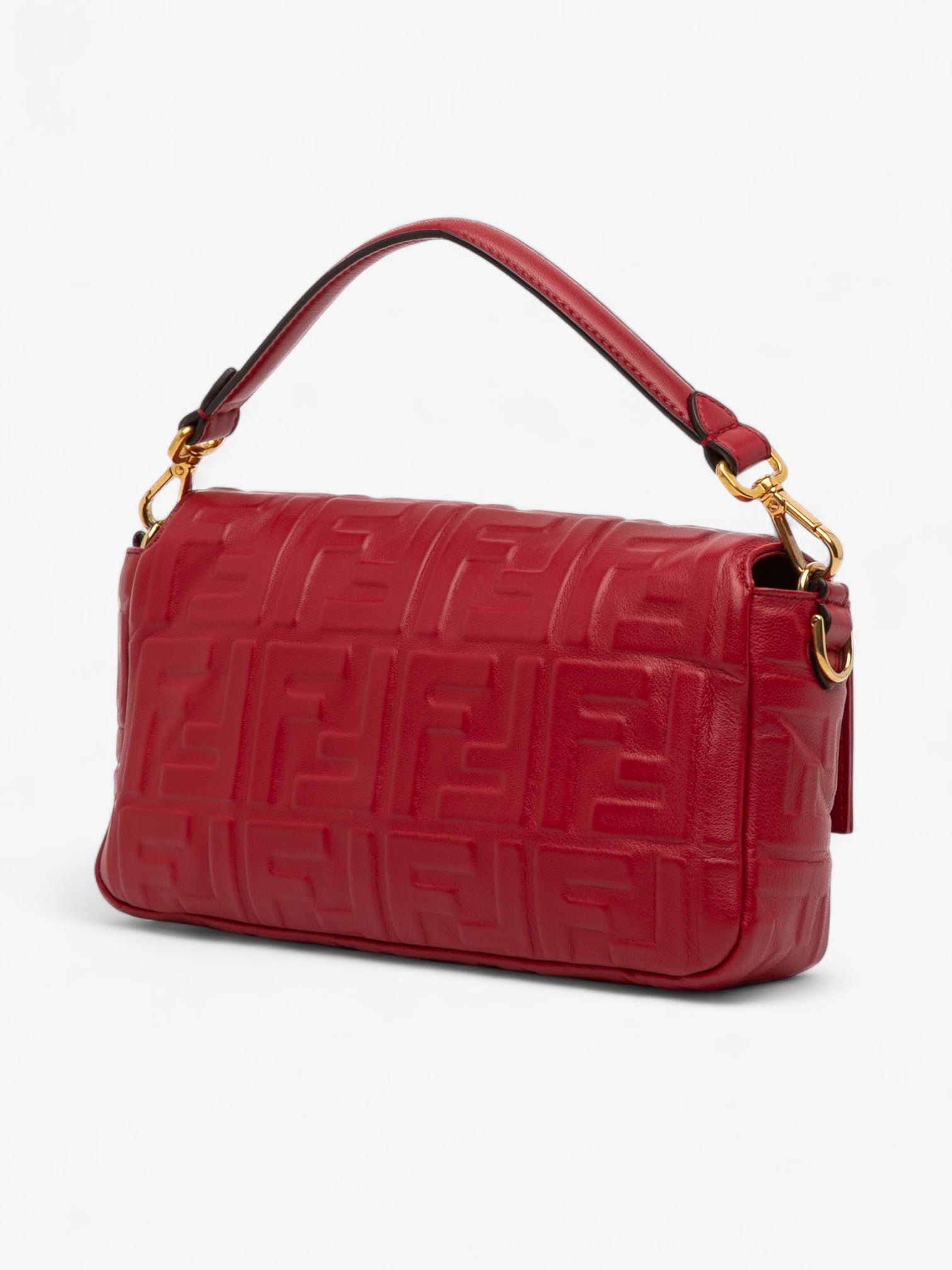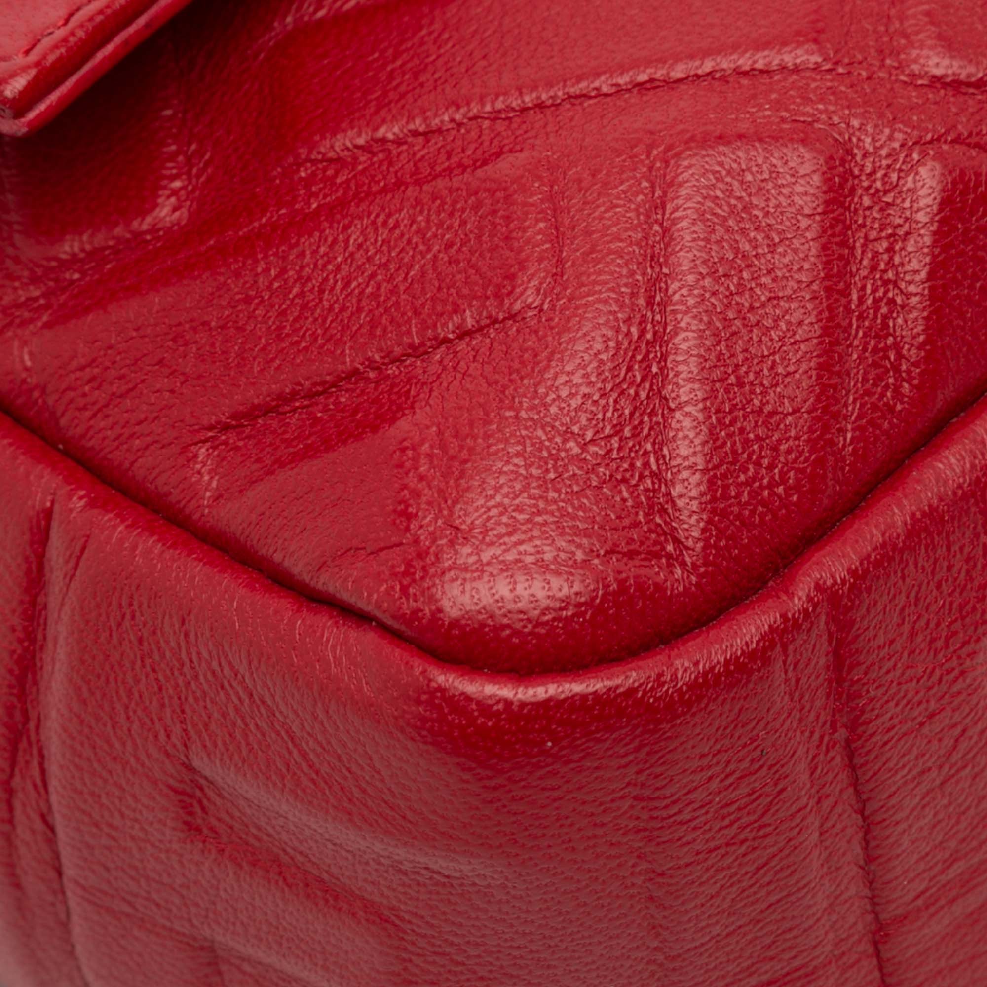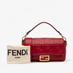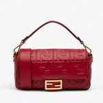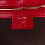 The Fendi Zucca Embossed Leather Baguette Satchel is a sophisticated and iconic piece, crafted in red embossed leather with the signature Zucca motif. It features a flat leather handle, a detachable leather strap for versatile wear, a front flap with magnetic snap closure, and an interior pocket. A timeless design that perfectly balances elegance and practicality.