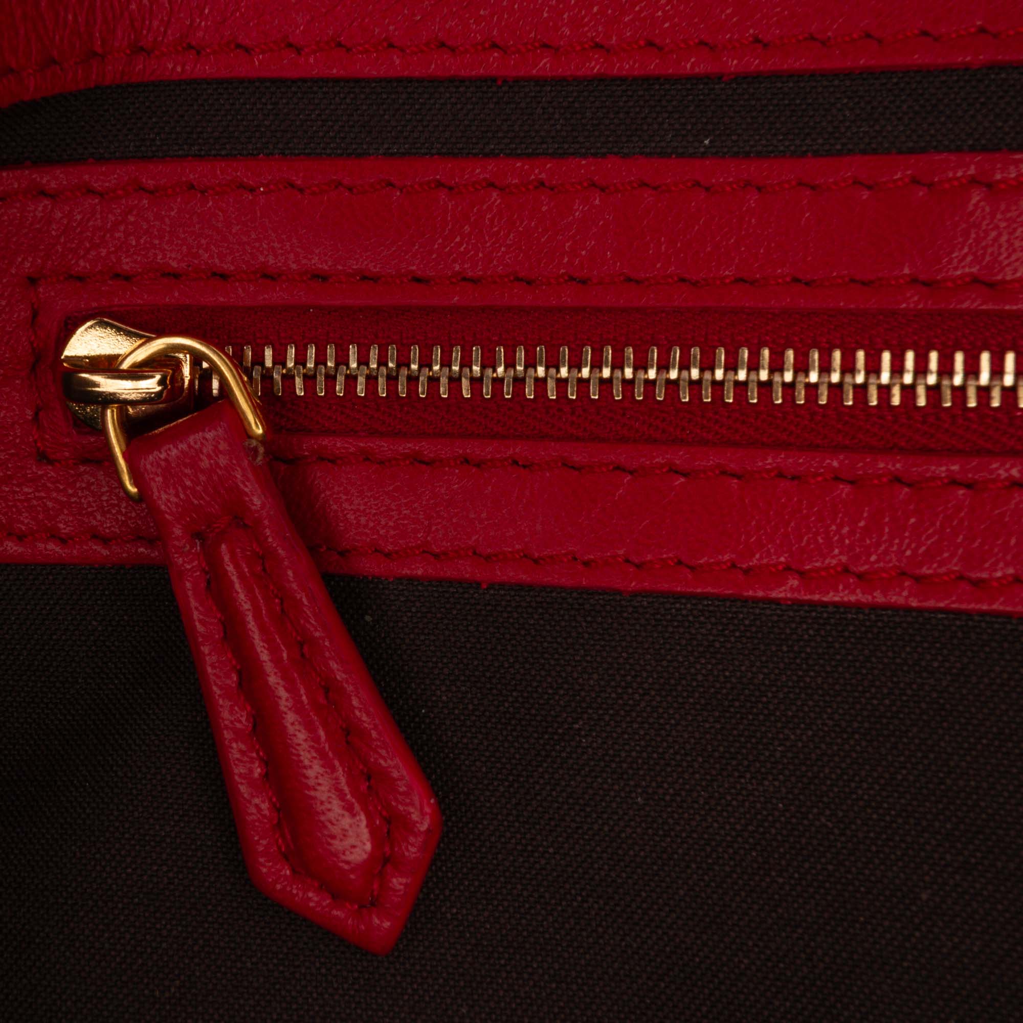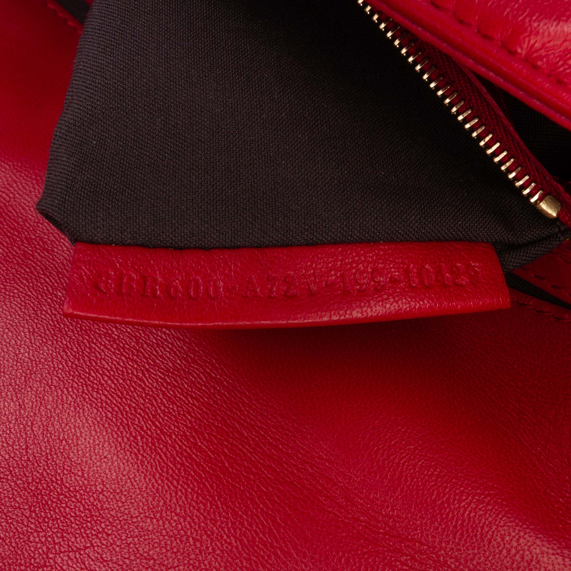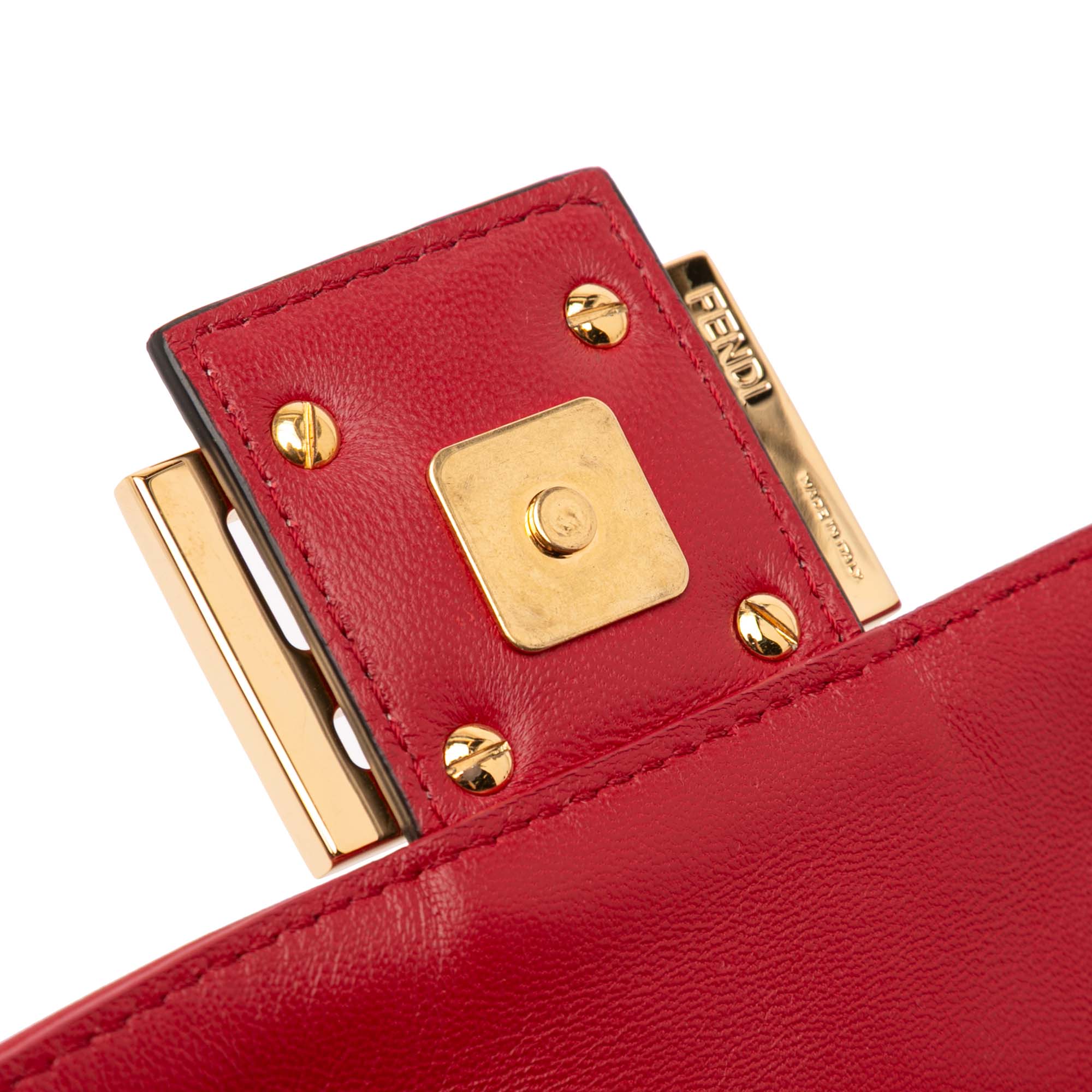 The Fendi Zucca Embossed Leather Baguette Satchel is a sophisticated and iconic piece, crafted in red embossed leather with the signature Zucca motif. It features a flat leather handle, a detachable leather strap for versatile wear, a front flap with magnetic snap closure, and an interior pocket. A timeless design that perfectly balances elegance and practicality.