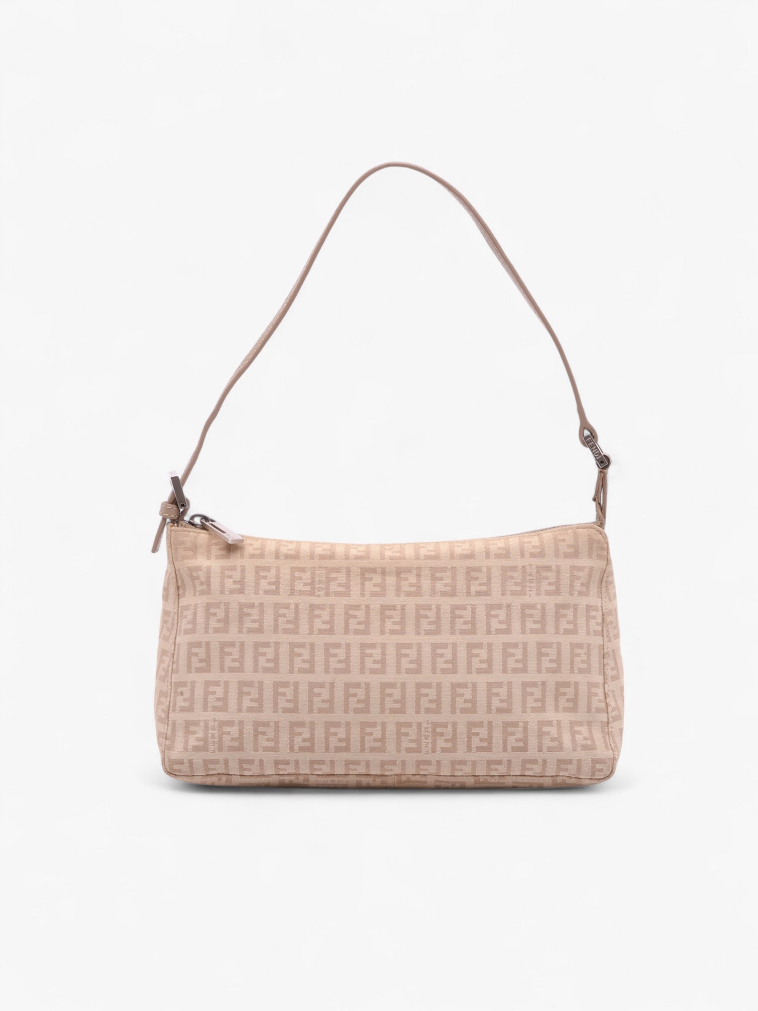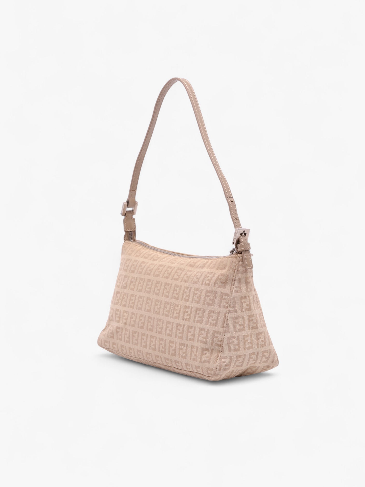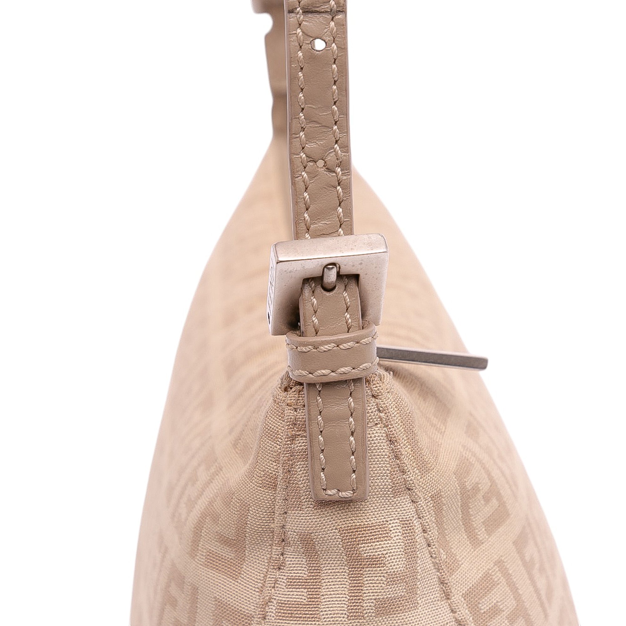 The Fendi Zucchino Canvas Pochette is a compact and chic baguette-style bag that highlights Fendi’s signature Zucchino motif. Crafted from durable canvas with leather trim, it features a flat leather strap, a secure top zip closure, and an interior slip pocket for essentials. The strap has been repainted, adding to the bag’s character as a pre-loved piece.