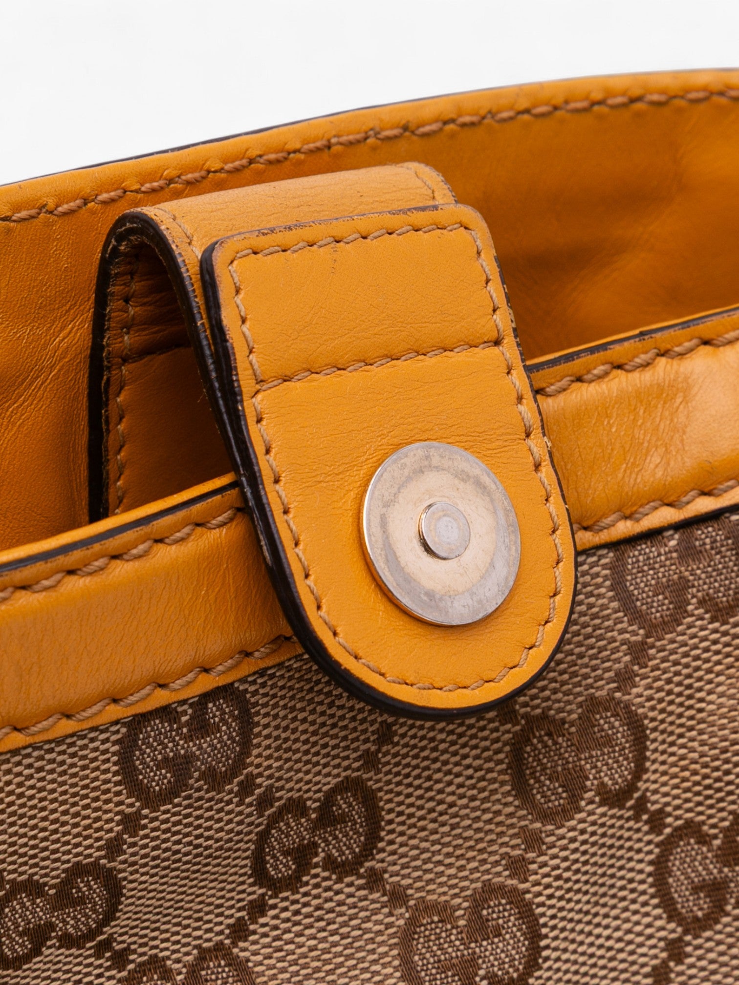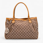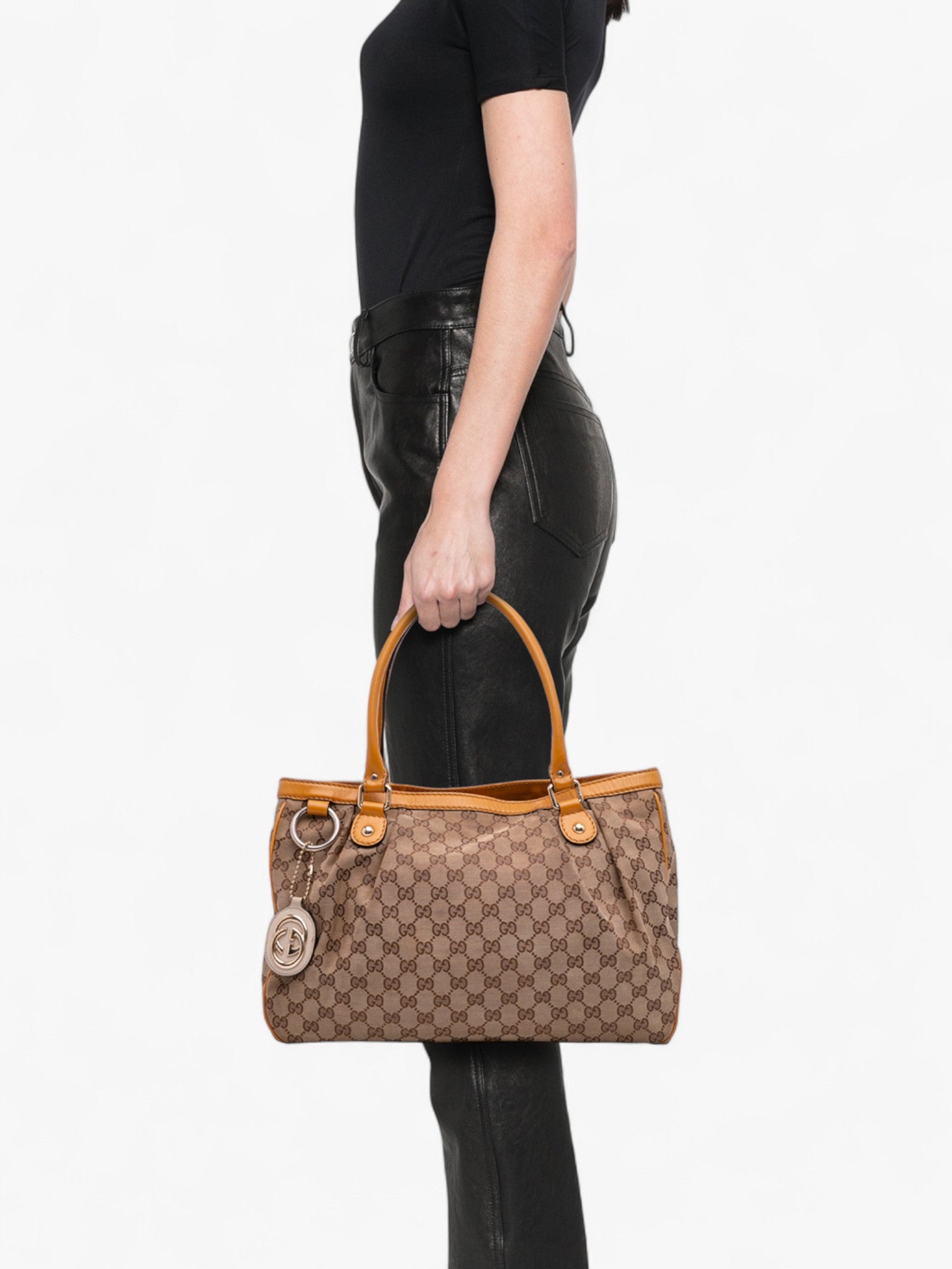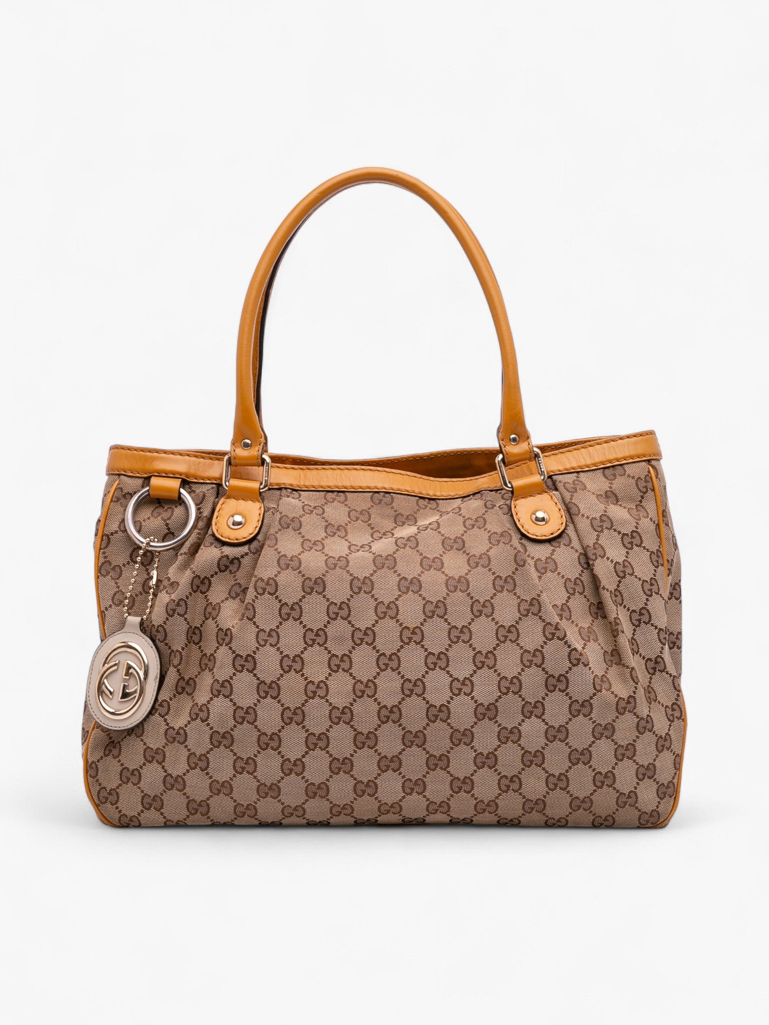 The Gucci GG Canvas Sukey Tote is a timeless expression of classic Italian craftsmanship and effortless sophistication. Crafted from GG monogram canvas with supple leather trim, this spacious tote features rolled leather handles, a magnetic snap closure, and a practical interior with multiple pockets for easy organization. Finished with a detachable GG charm, the Sukey Tote embodies Gucci’s refined yet relaxed elegance — perfect for both everyday wear and travel.