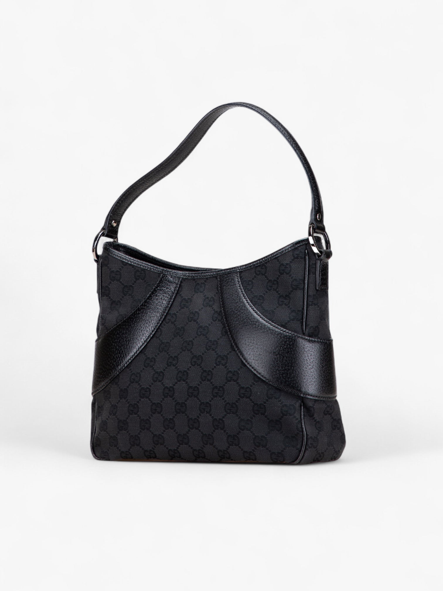 The Gucci GG Canvas Shoulder Bag is a versatile everyday piece, crafted from signature GG canvas with smooth leather trim. It features a flat leather strap, an open top with magnetic closure, and an interior zip pocket. A practical design with understated elegance, ideal for daily wear.