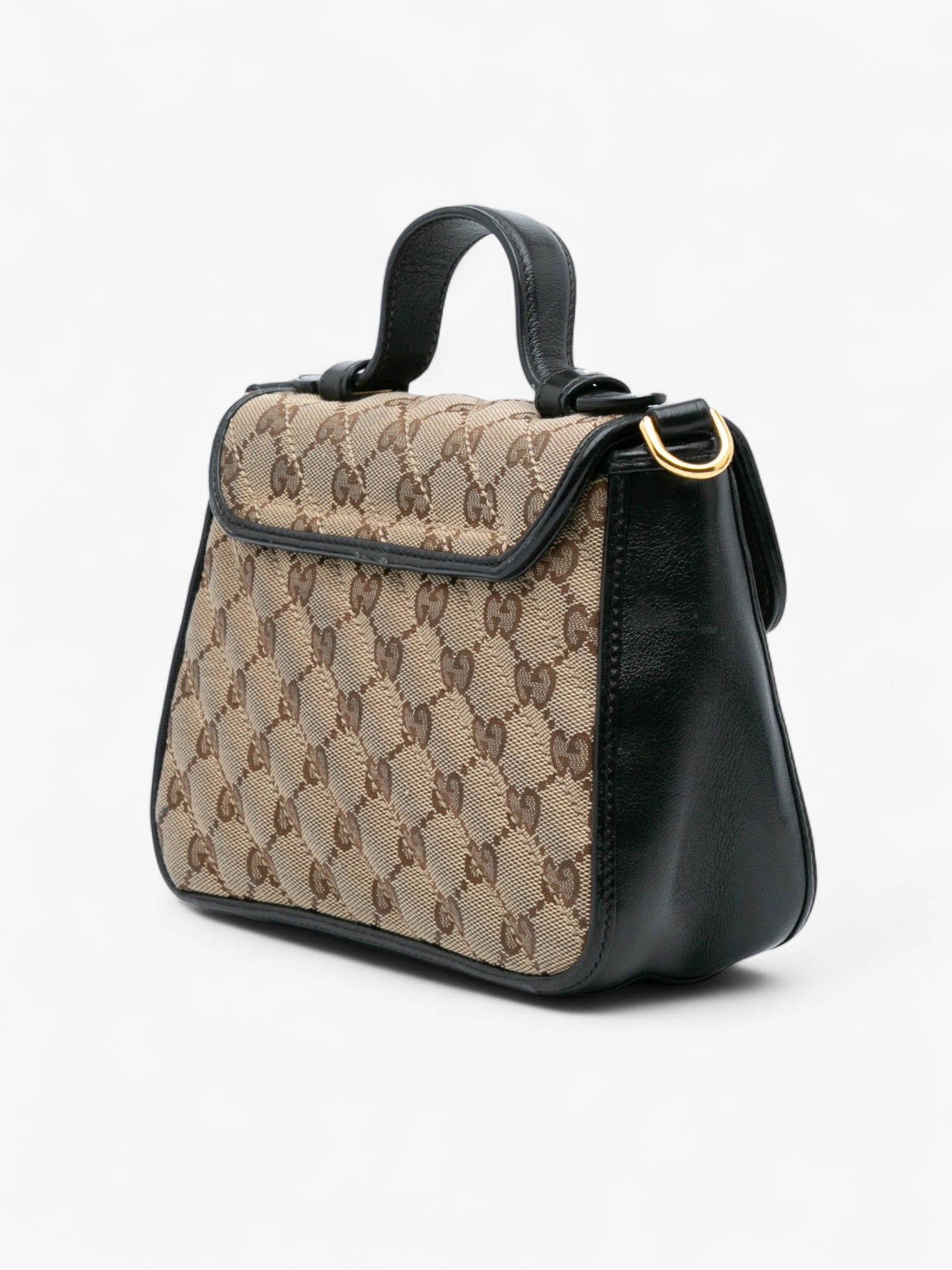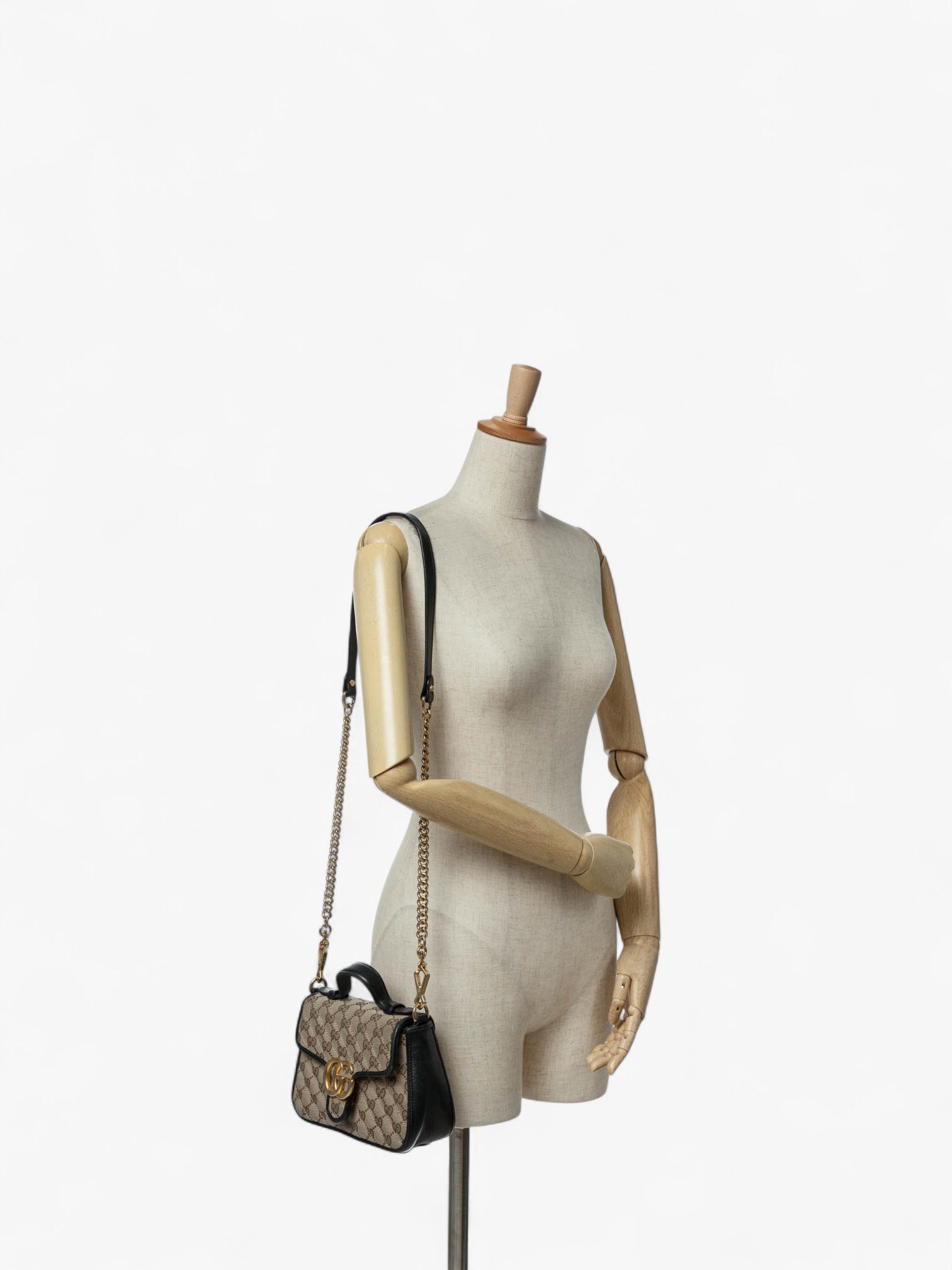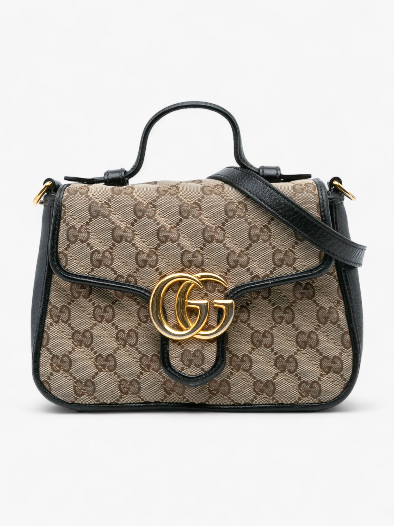 Chic and compact, the Gucci GG Marmont Matelassé Canvas Top Handle Bag blends signature GG canvas with leather trim and bold Double G hardware. The top handle and detachable strap offer versatile styling, while the flap with magnetic snap keeps essentials secure. A polished everyday companion.