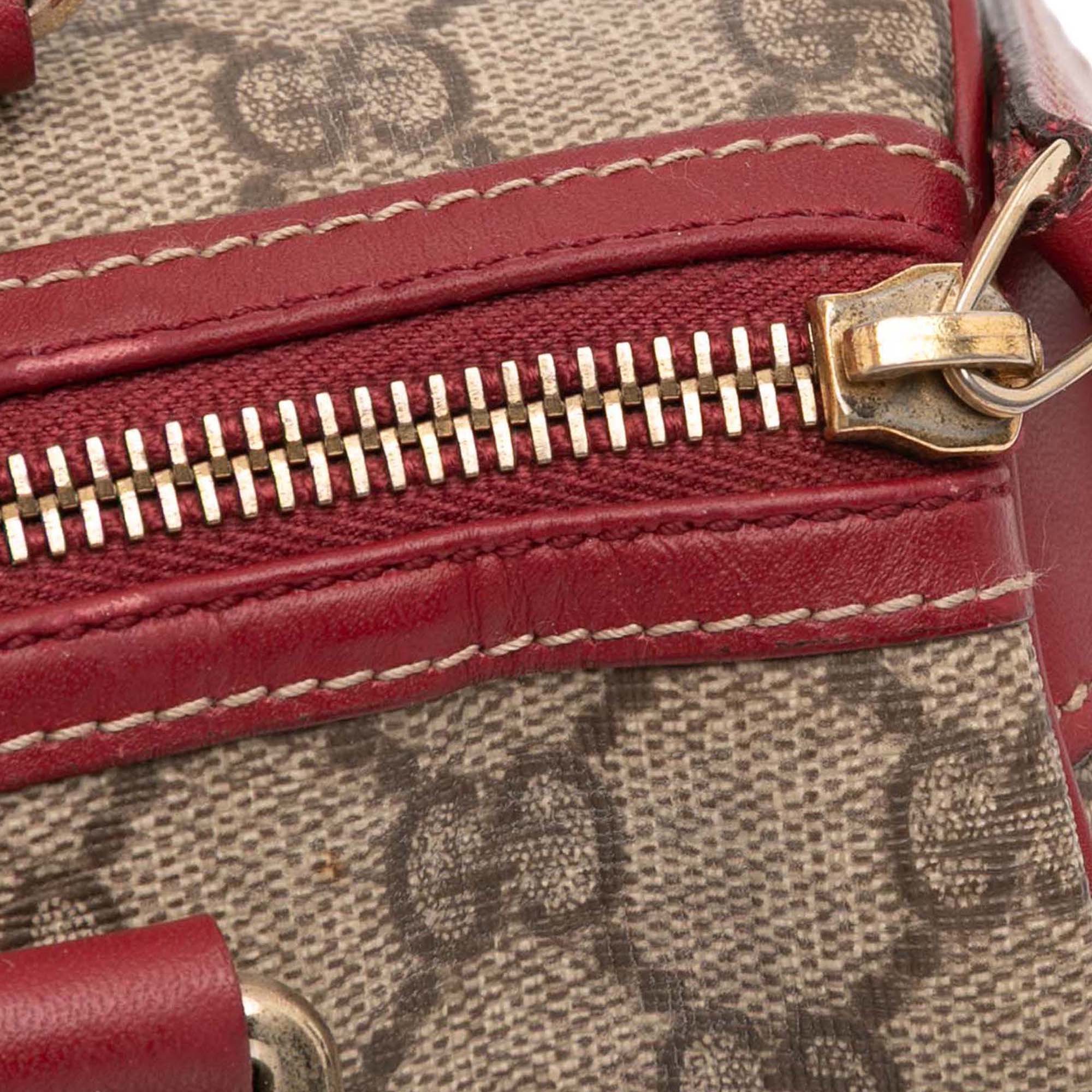 The Gucci Joy Boston Bag in this limited edition design is a chic and practical everyday piece. Crafted from GG Supreme coated canvas with leather trim, it features rolled leather handles, a top zip closure, and an interior slip pocket. The bold red web stripe detail adds a touch of personality and distinction to this classic silhouette.