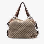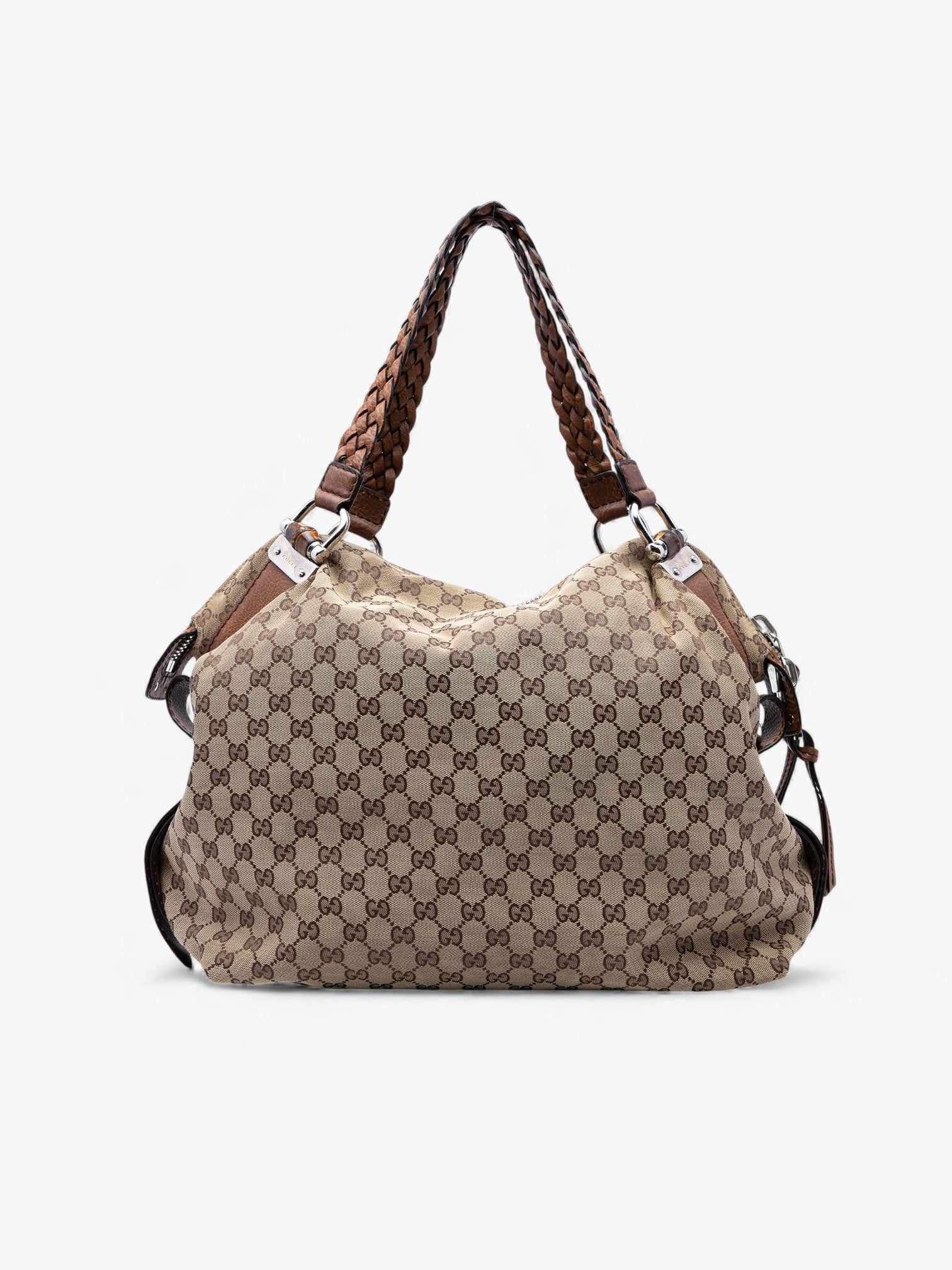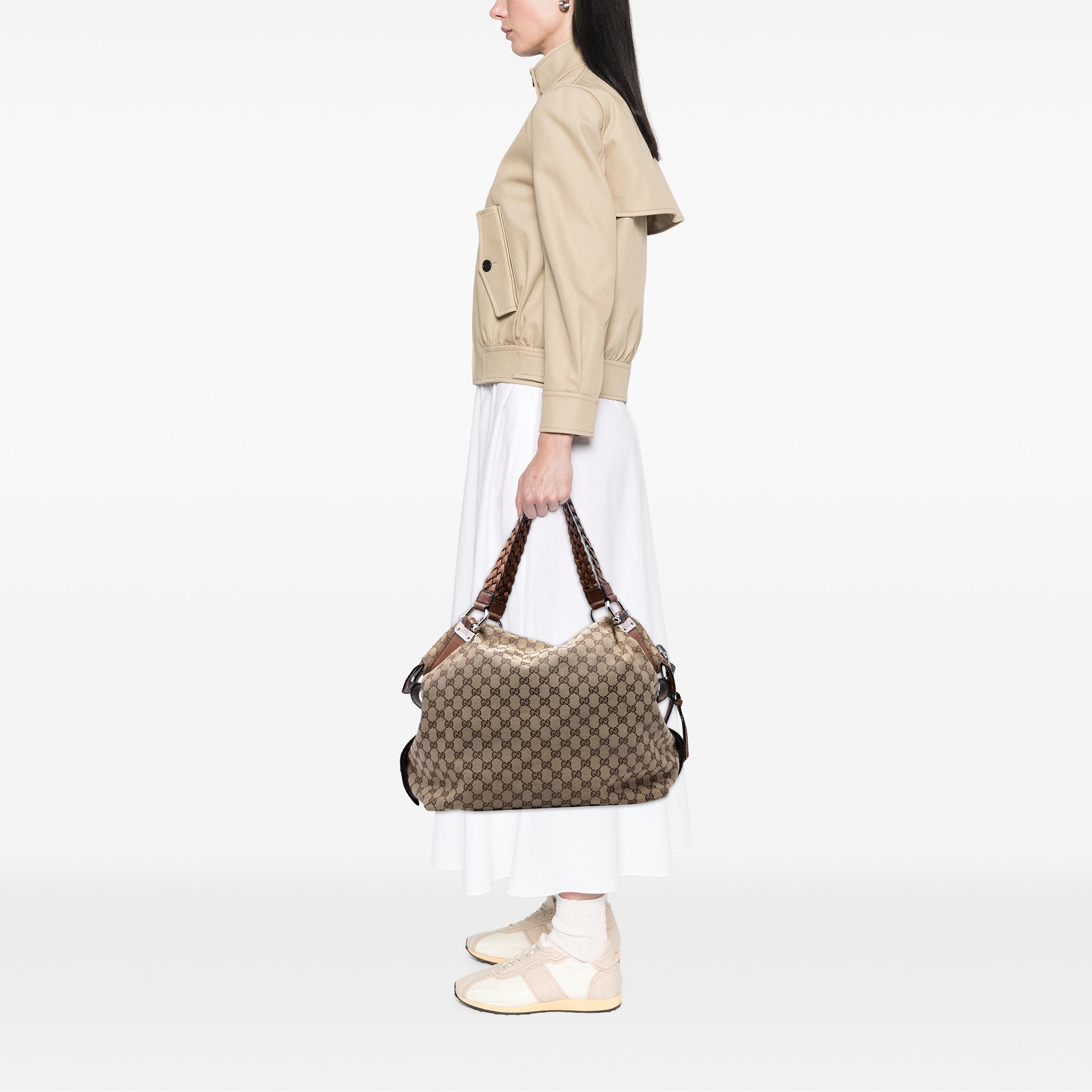 Introducing the Large GG Canvas Bamboo Bar Tote, a stunning creation from the esteemed House of Gucci. This exquisite tote showcases a luxurious canvas body adorned with elegant leather trim, exuding sophistication and timeless style. The braided leather shoulder straps provide both comfort and a chic aesthetic, while the top zip closure ensures your essentials are secure. With thoughtful interior zip and slip pockets, this tote is not only a statement piece but also a practical companion for everyday adventures, embodying the perfect blend of fashion and functionality.