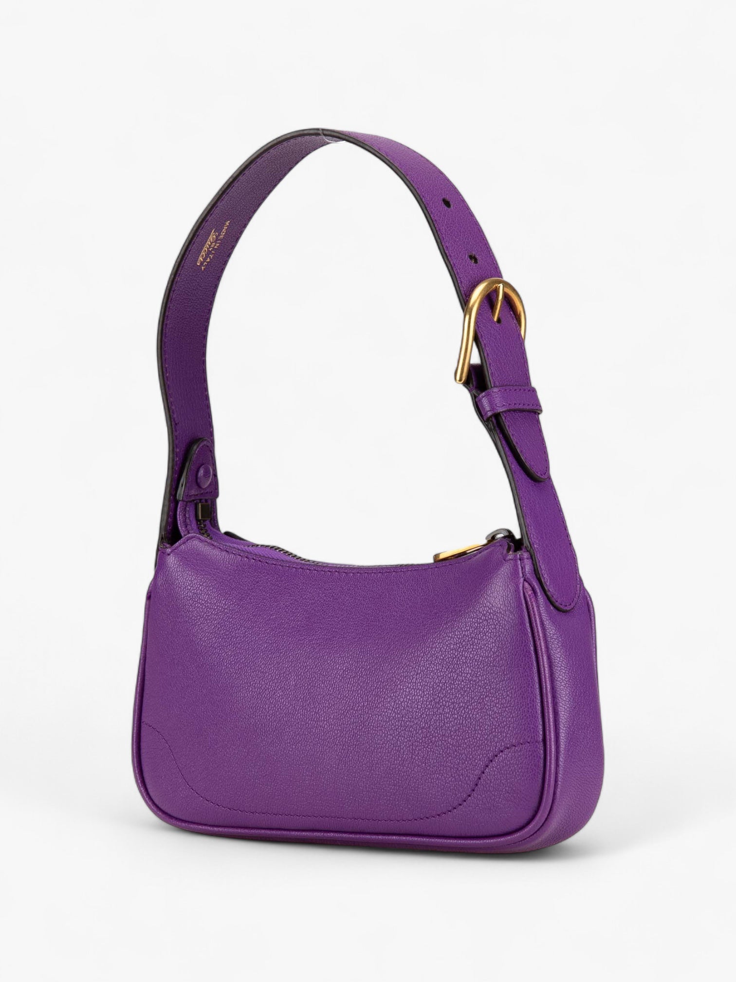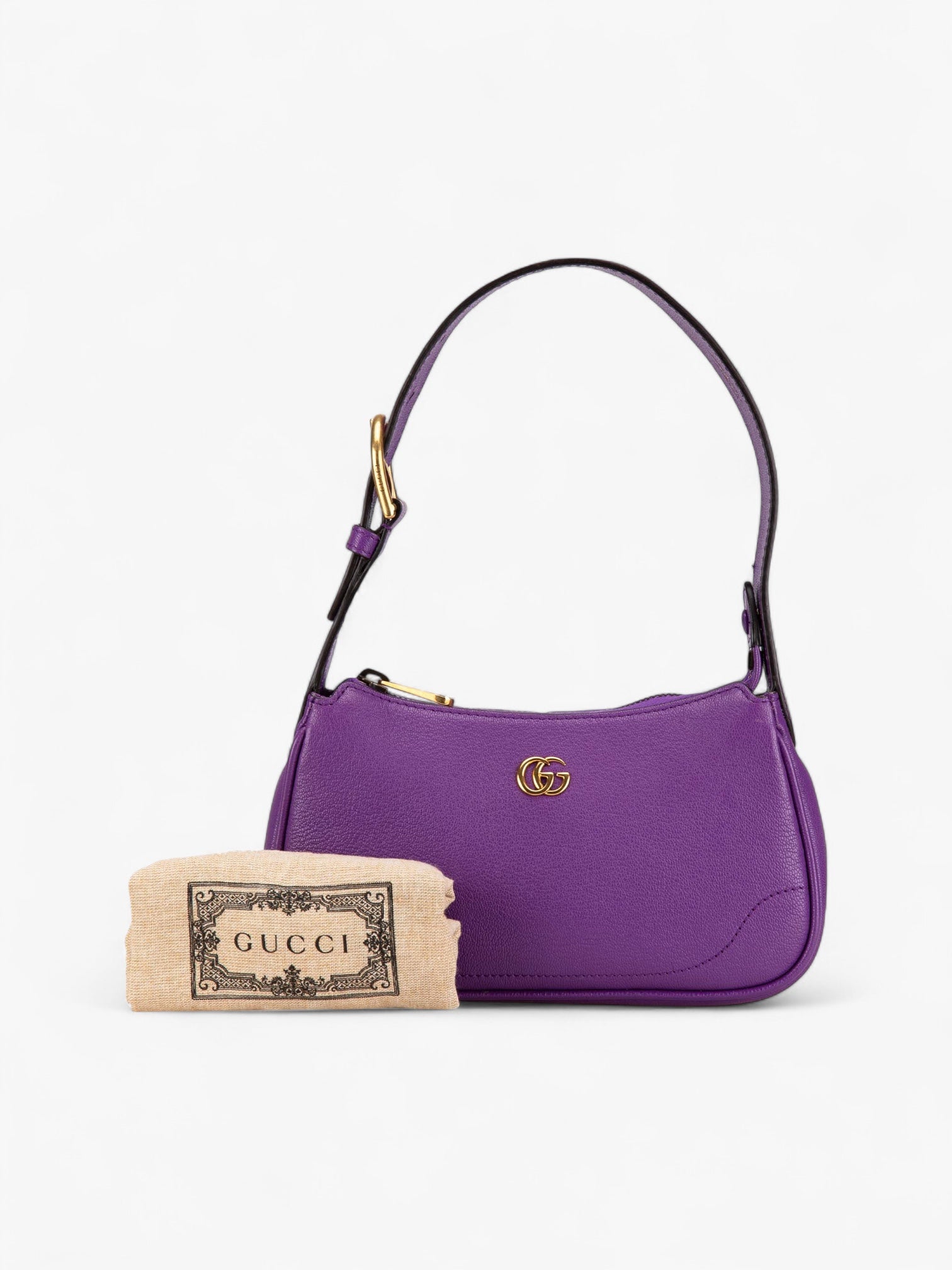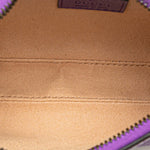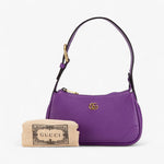 The Gucci Mini Leather Aphrodite Shoulder Bag is a chic and modern design in vibrant purple calfskin leather. Featuring a flat leather strap and a secure top zip closure, this compact yet eye-catching piece is perfect for both day and evening wear.