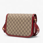 The Gucci Small GG Supreme Horsebit 1955 Crossbody blends heritage and modern design. Crafted from coated GG canvas with red leather trim, it features the iconic Horsebit detail, a flap front with pull-through closure, and an adjustable leather shoulder strap. Compact yet functional, it’s perfect for everyday elegance.