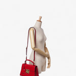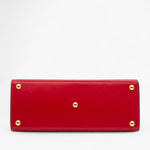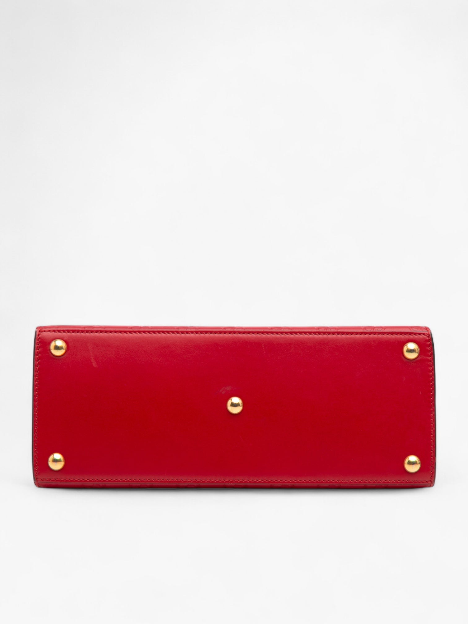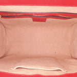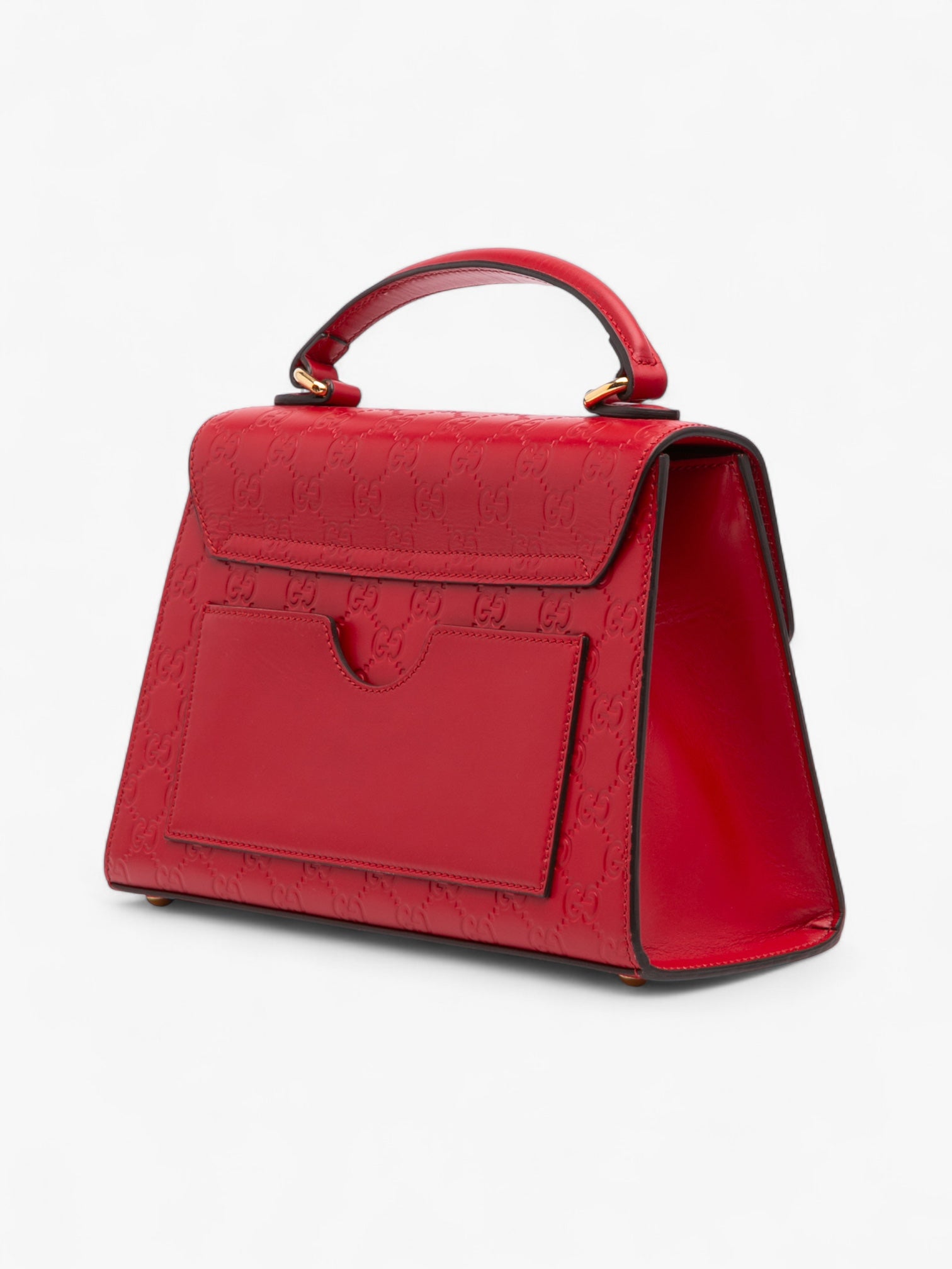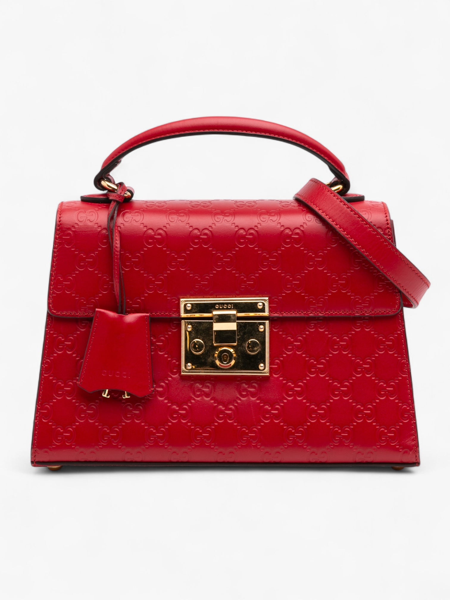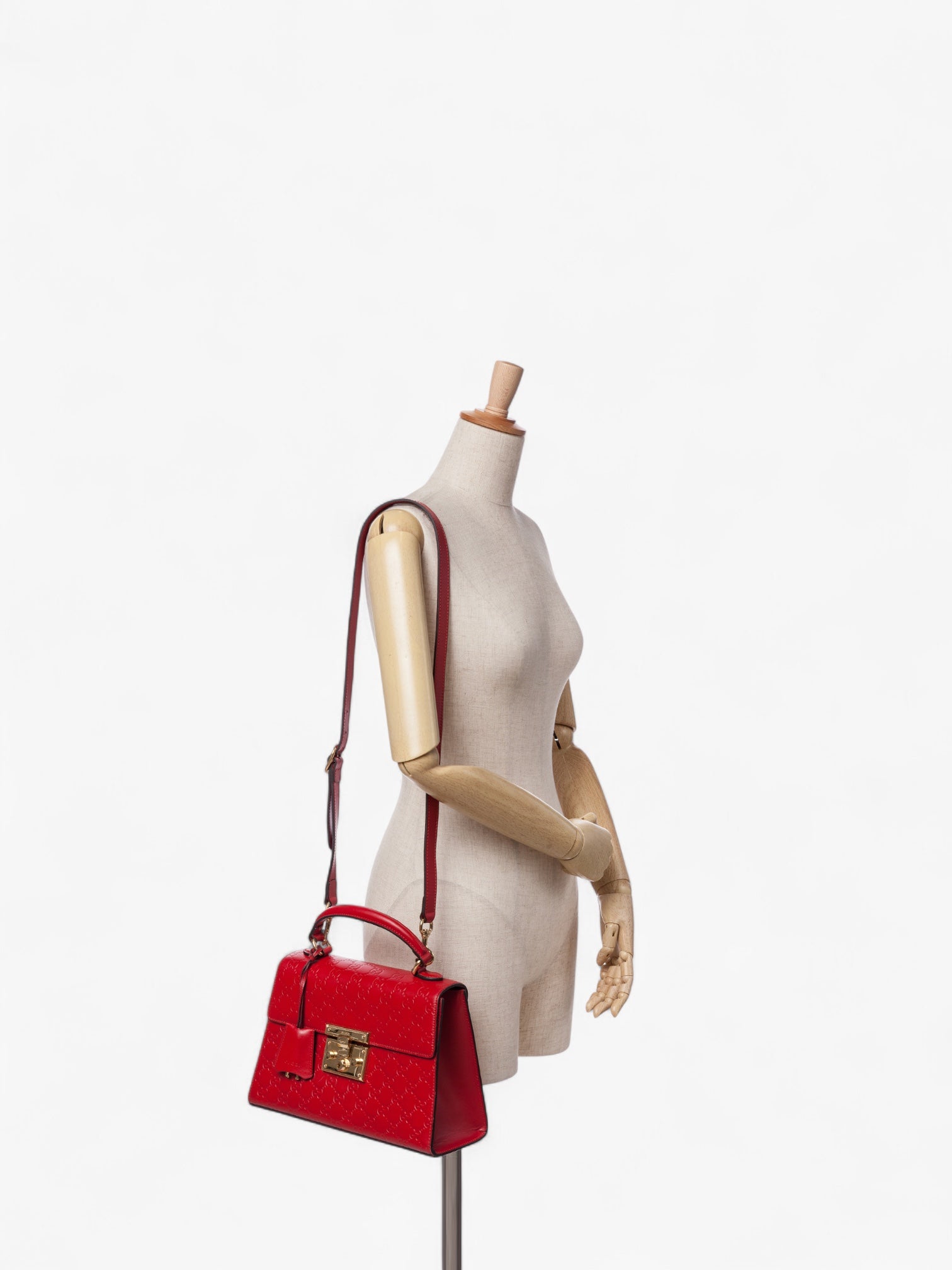 The Gucci Small Guccissima Padlock Satchel is a refined piece that combines elegance with functionality. Crafted from embossed red calf leather, it features a flat leather top handle, a front flap with push lock closure, an exterior back slip pocket, and interior zip and slip compartments. Its structured silhouette and versatile design make it perfect for both day and evening use.