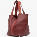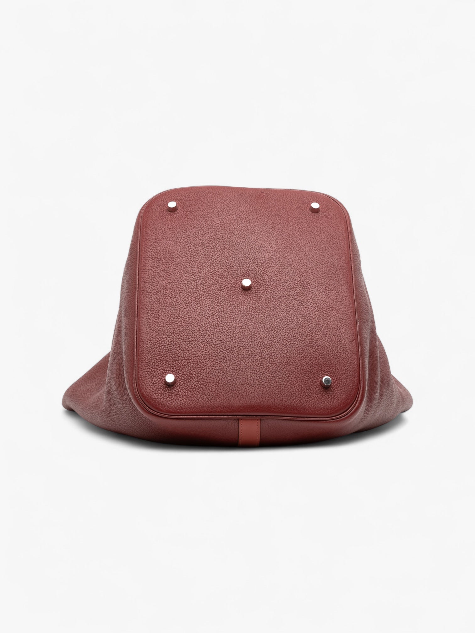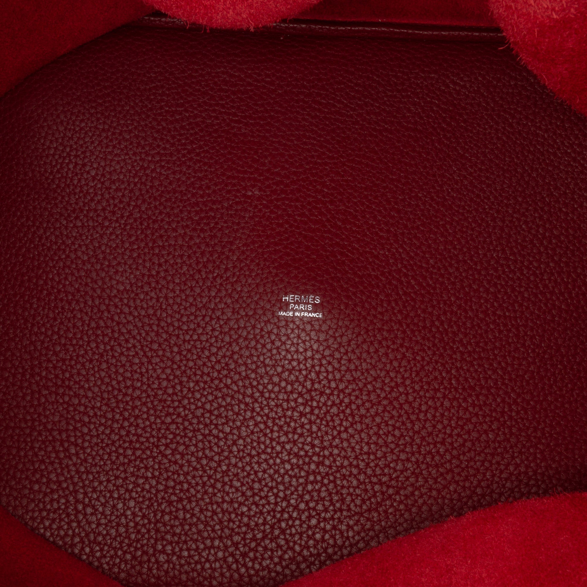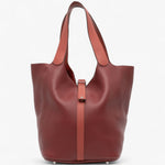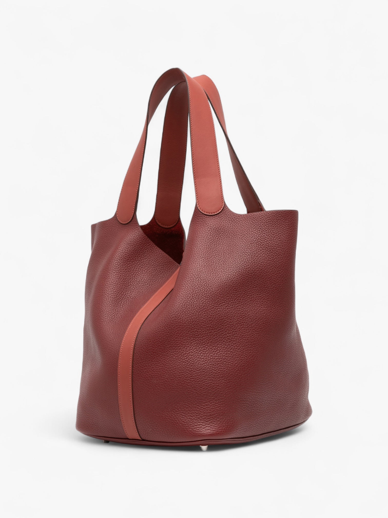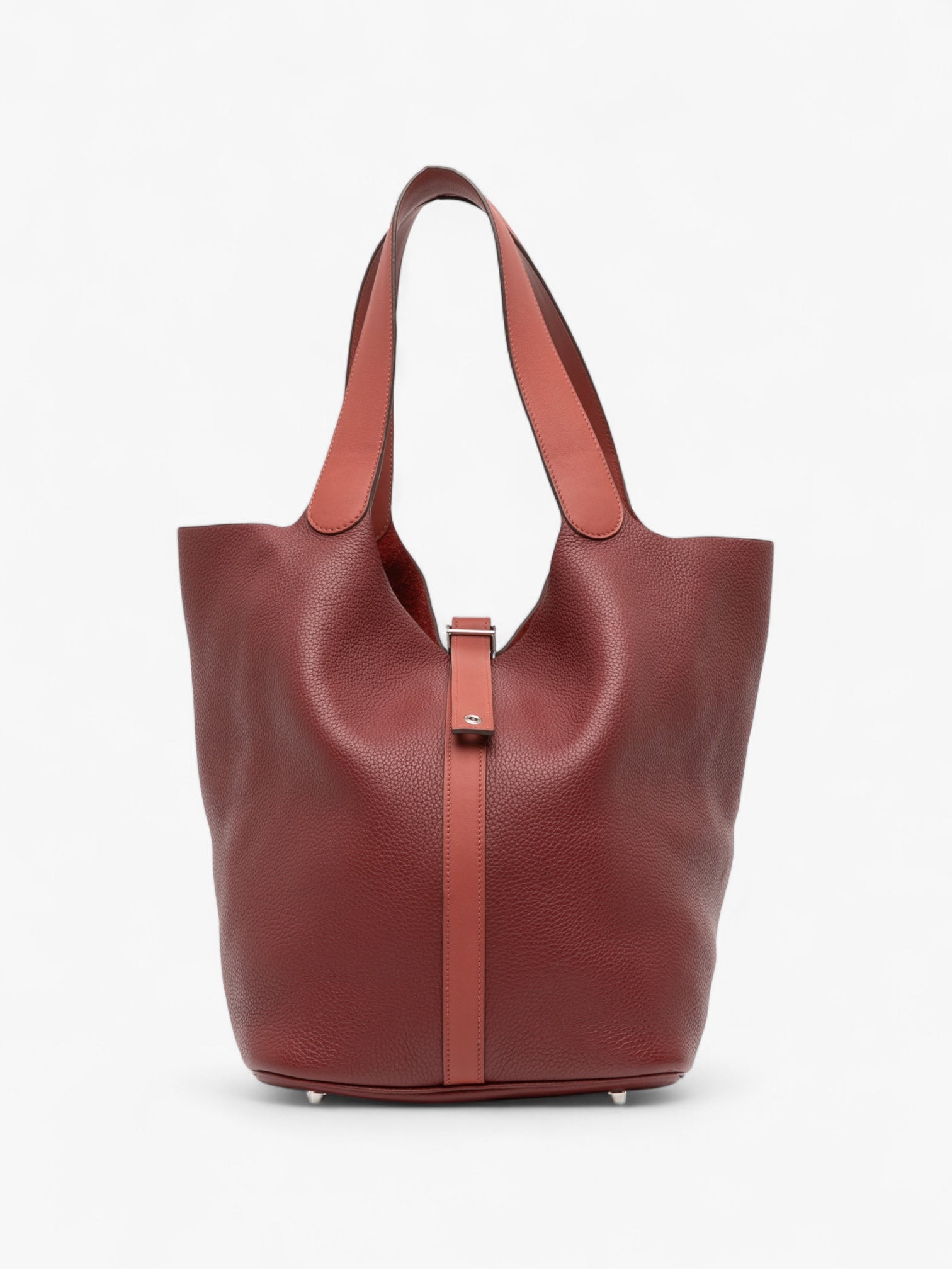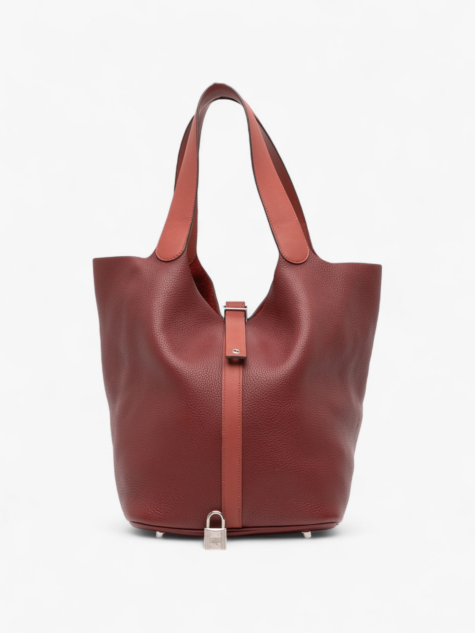 The Hermès Bicolor Picotin Lock 31 is a refined design that combines casual elegance with timeless craftsmanship. Crafted in Clemence leather in Rouge H with contrasting Brique Swift leather details, it features flat handles, an open top, and a functional padlock closure. Spacious yet understated, this bag embodies the effortless chic of Hermès.