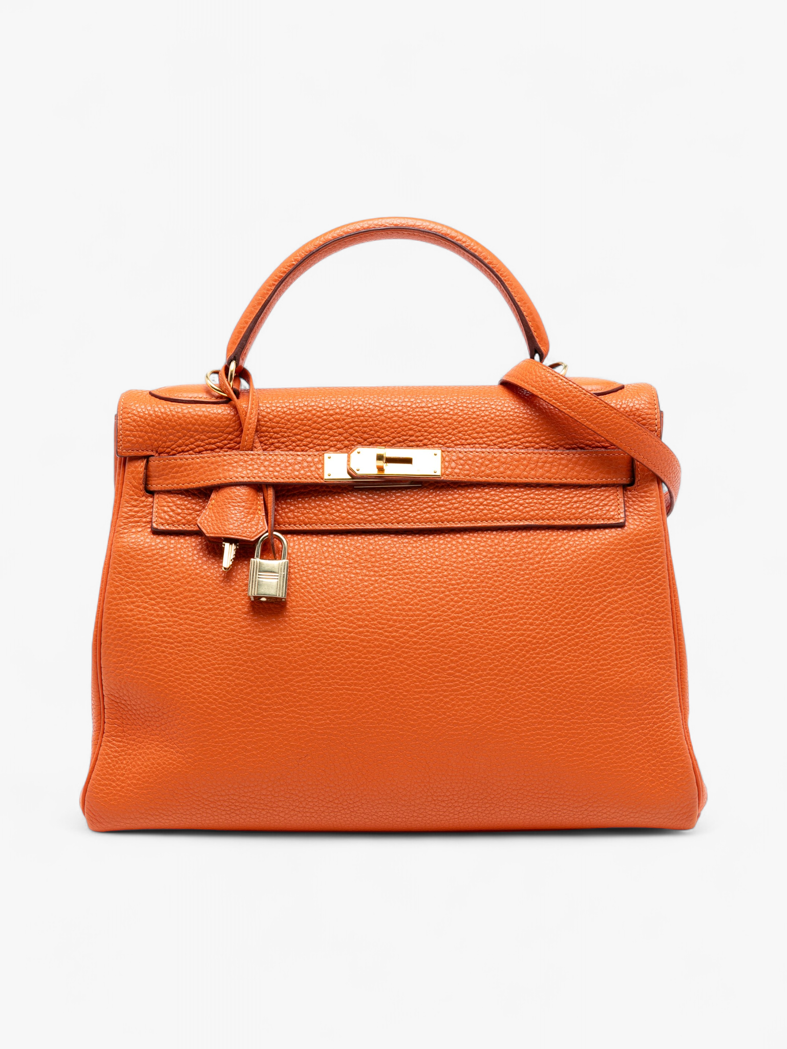 Introducing the exquisite Clemence Kelly II Retourne 32, a timeless piece that embodies the essence of luxury and sophistication. This stunning handbag, crafted from premium Clemence leather in a vibrant Orange hue, showcases a refined silhouette that is both versatile and elegant. With its rolled leather top handle and detachable flat leather strap, this piece effortlessly transitions from day to night, making it a perfect companion for any occasion. The front flap features a secure metal lock closure, while the thoughtfully designed interior boasts zip and slip pockets for added functionality, ensuring that style meets practicality in this remarkable accessory.