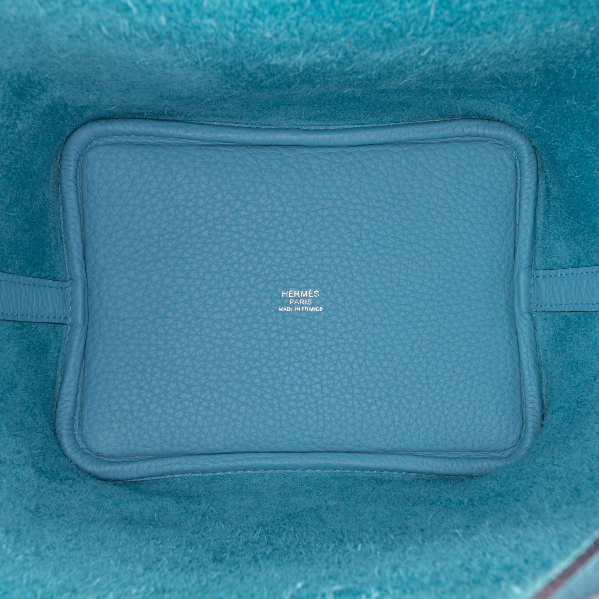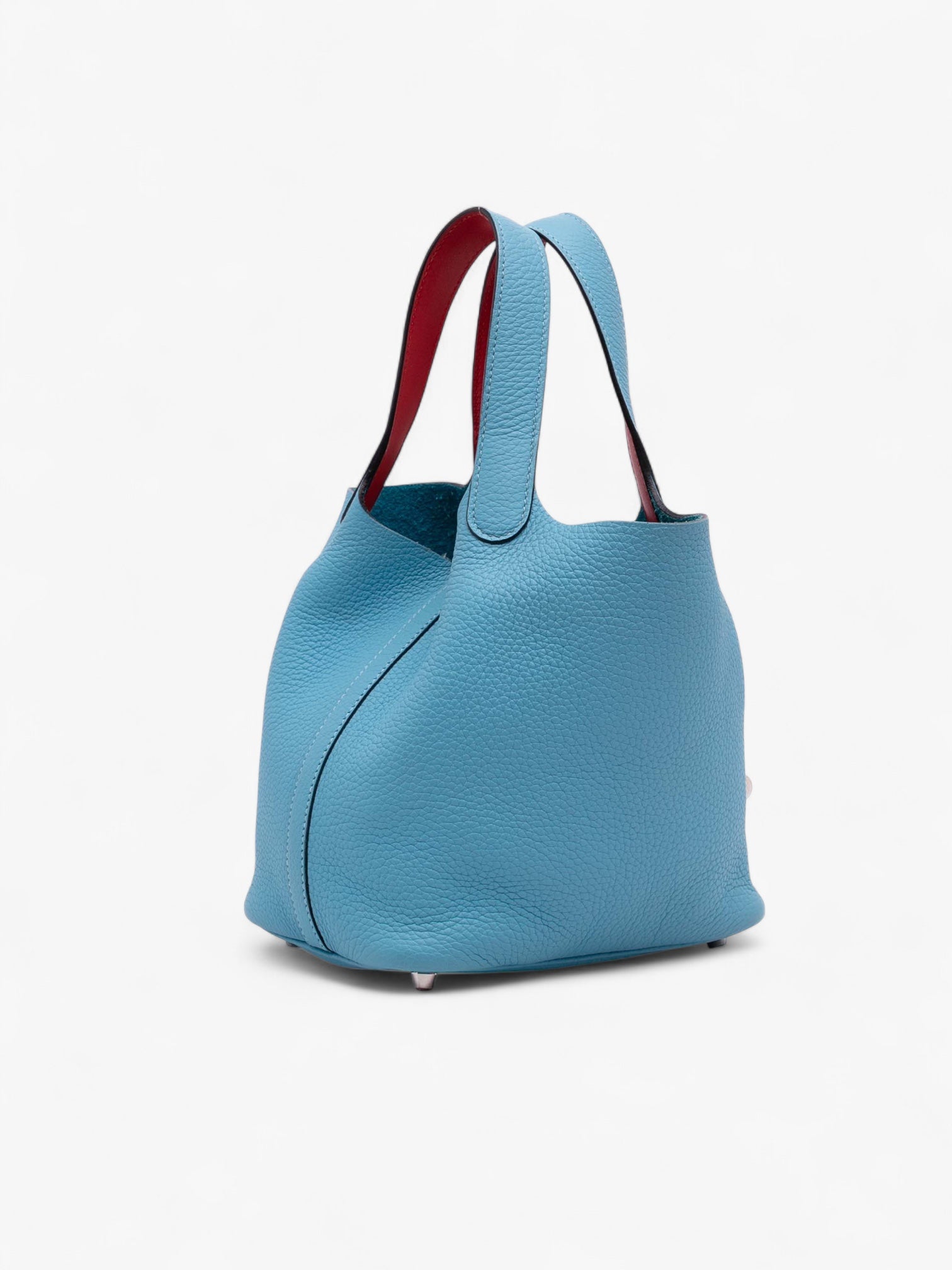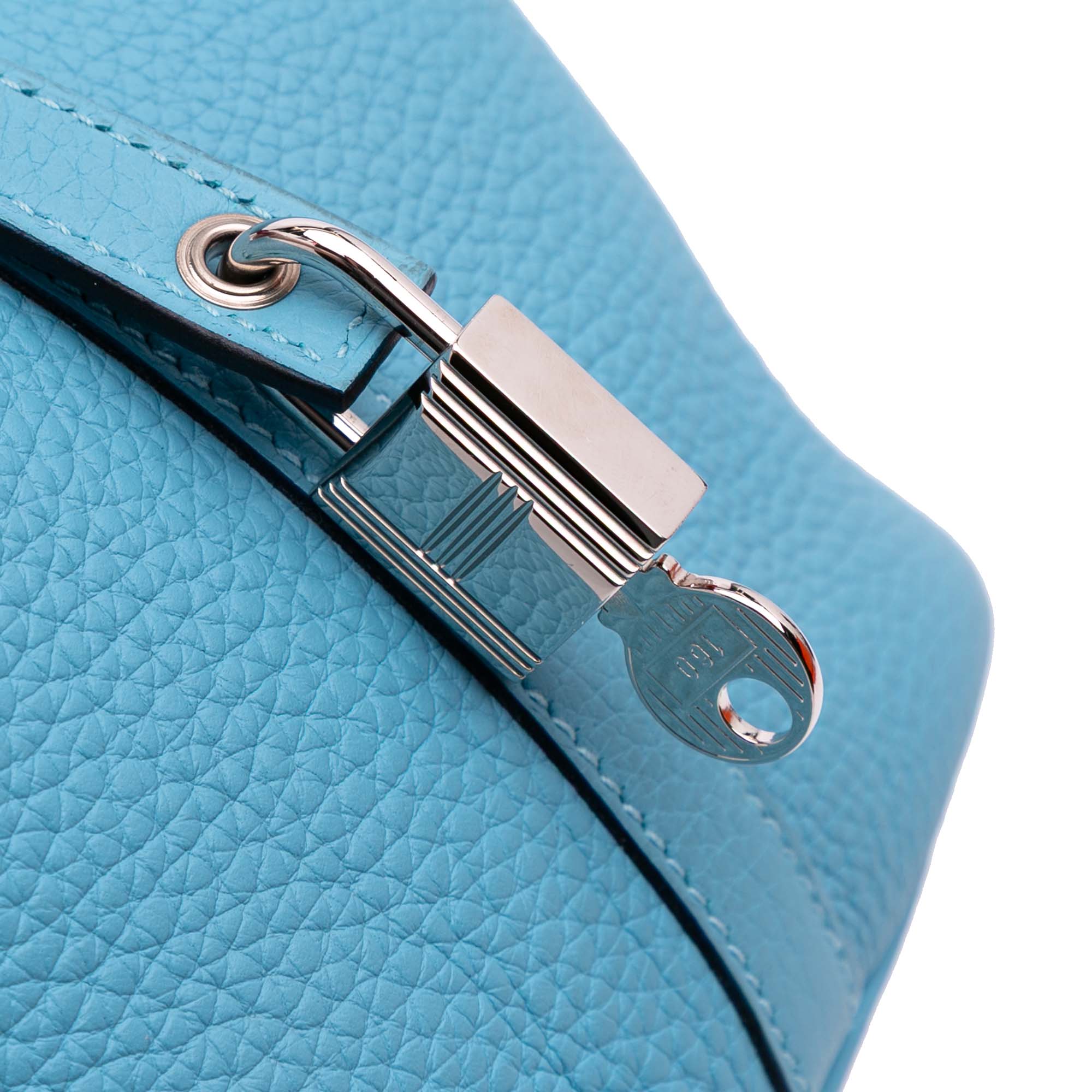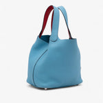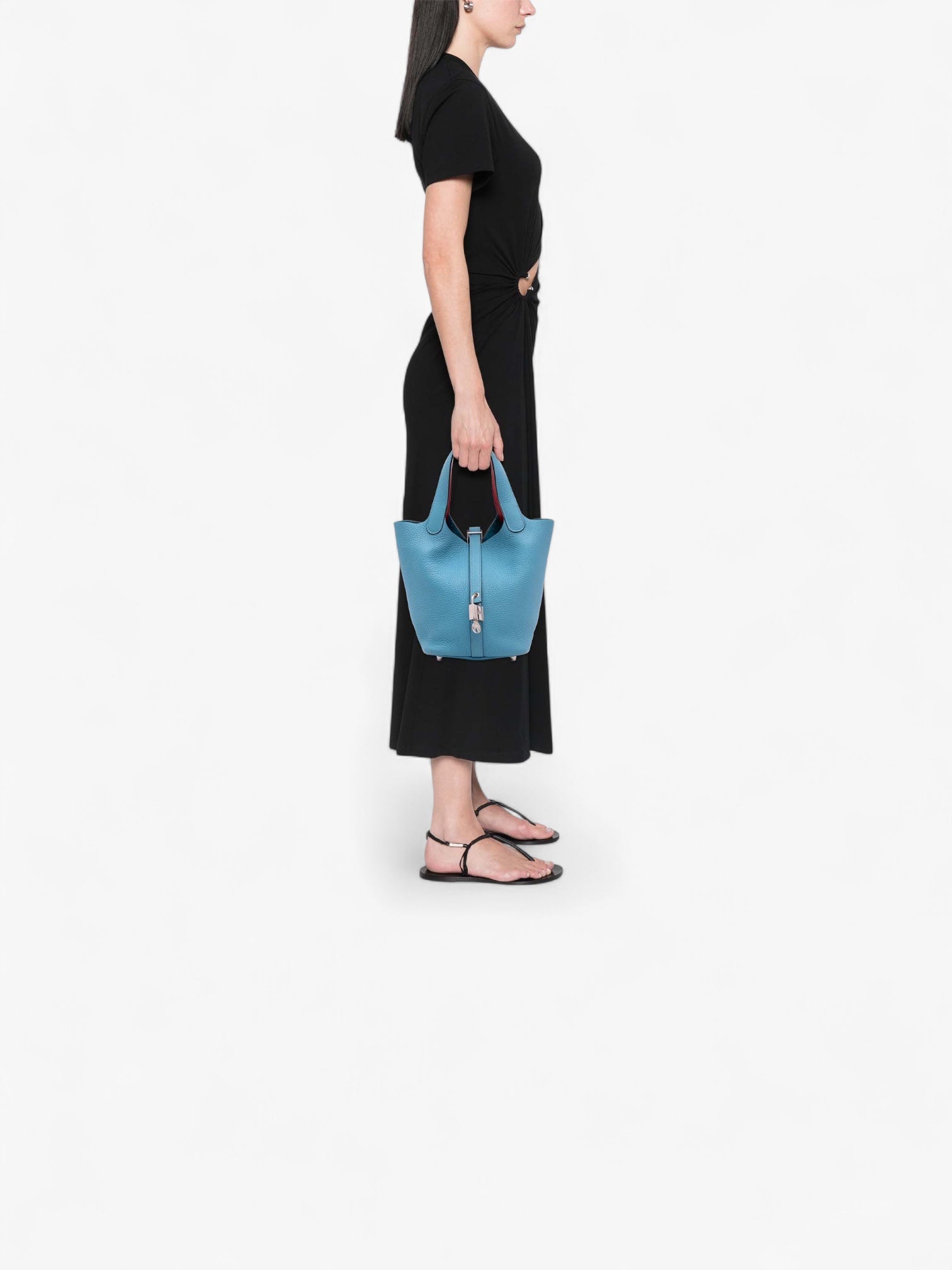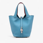 The Hermès Picotin Lock 18 Éclat combines refined craftsmanship with modern flair. Made from Clemence leather in Bleu du Nord with Swift leather trim in Rouge de Coeur, it features flat handles and an open top with a pull-through strap and lock closure. A sophisticated and versatile mini tote, perfect for elevating daily style.