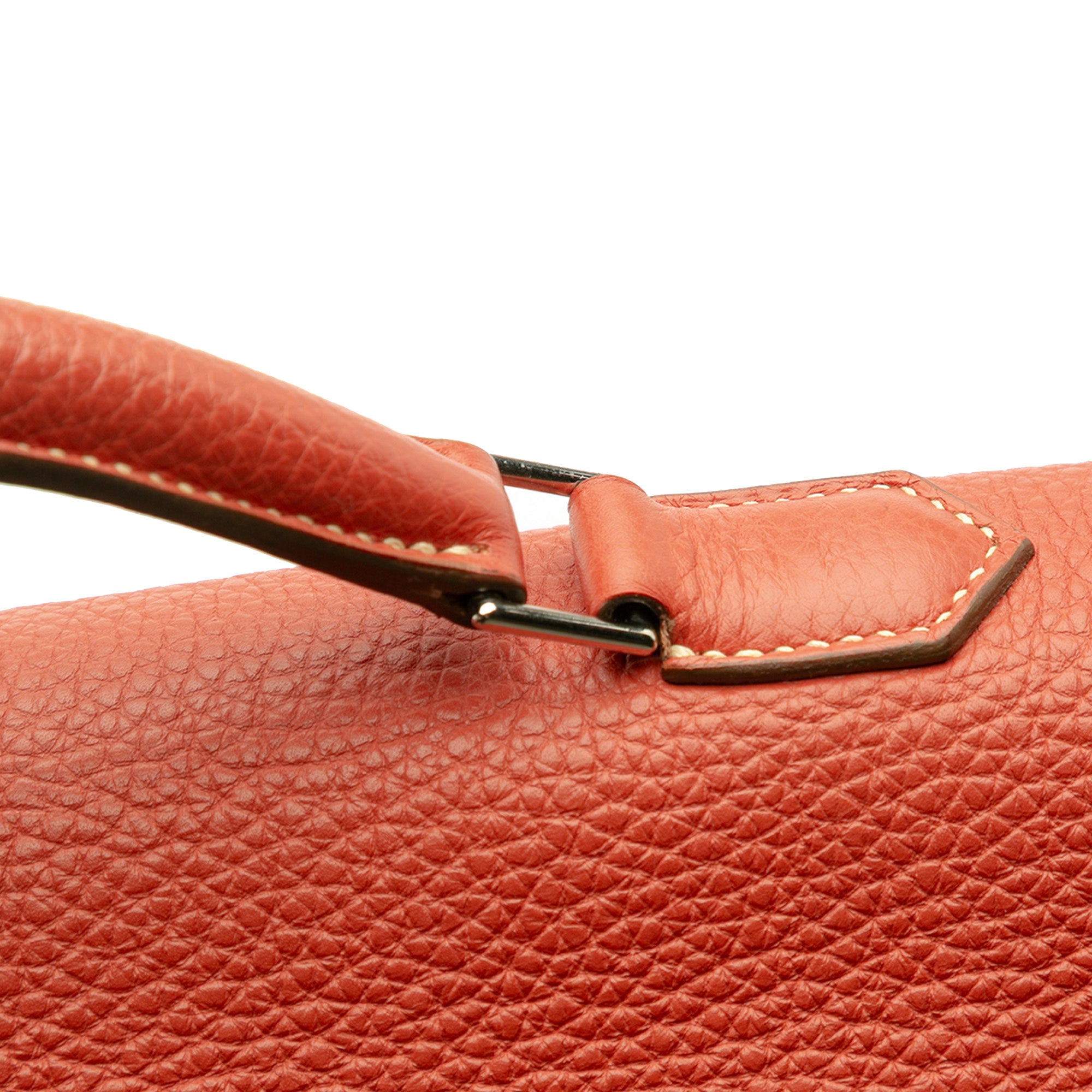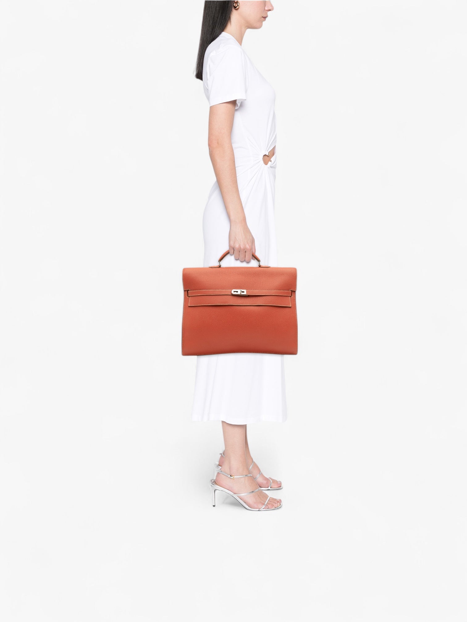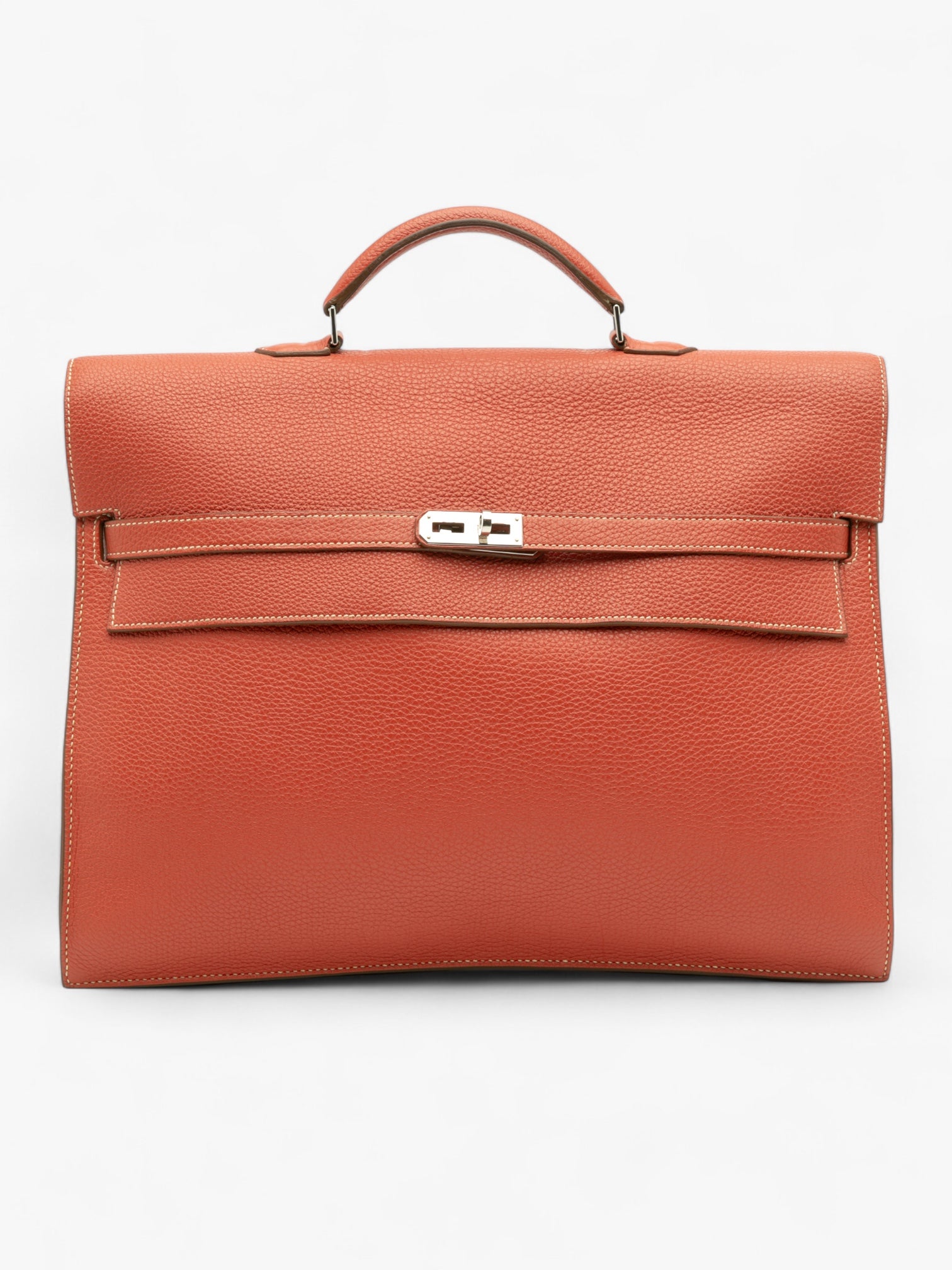 The Hermès Togo Kelly Depeches 38 is a refined business bag that reflects the maison’s mastery in craftsmanship and understated luxury. Designed in the rich Brique shade of Togo leather, it features a structured silhouette with a flat top handle and the signature twist-lock closure, making it a timeless companion for both professional and sophisticated settings.