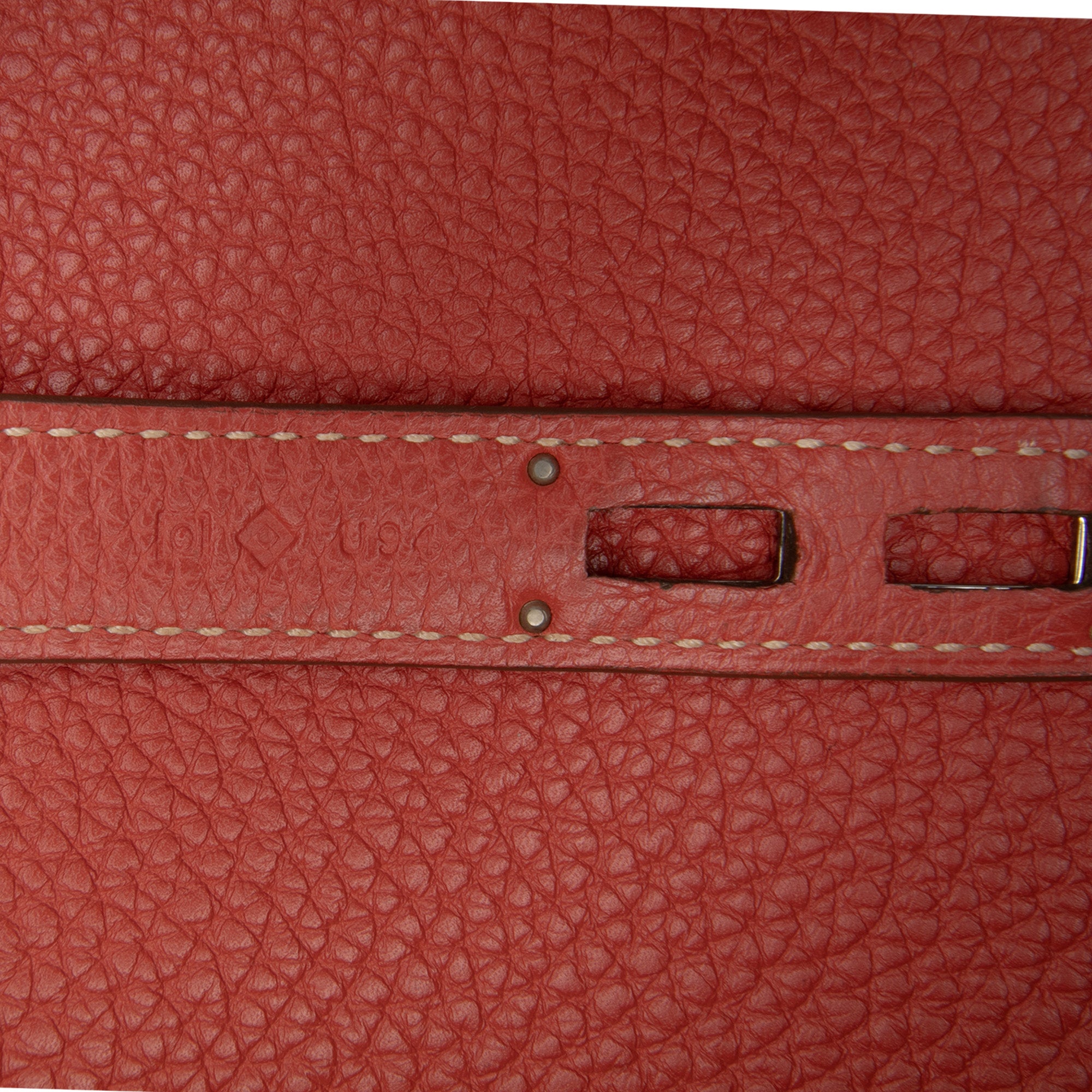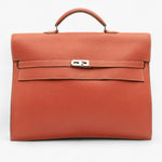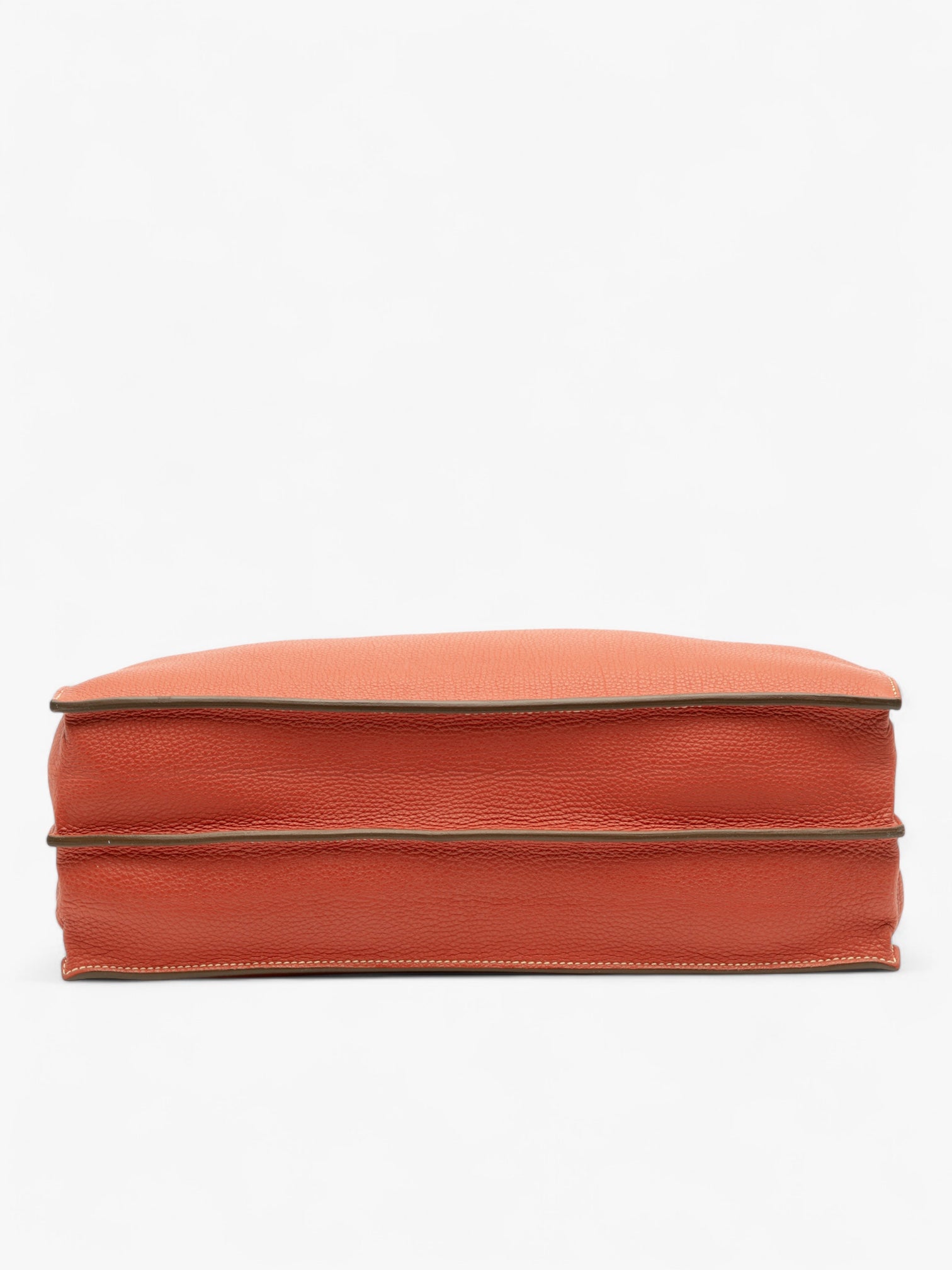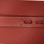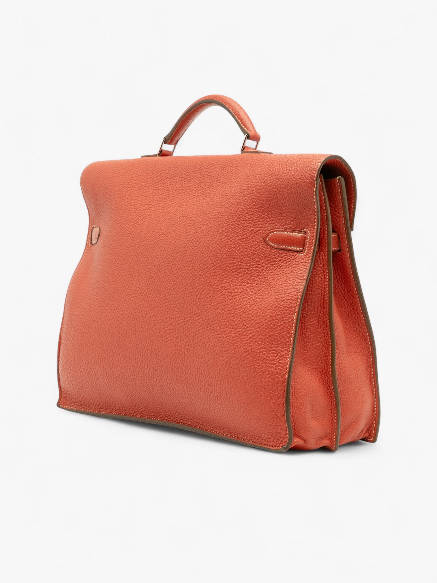 The Hermès Togo Kelly Depeches 38 is a refined business bag that reflects the maison’s mastery in craftsmanship and understated luxury. Designed in the rich Brique shade of Togo leather, it features a structured silhouette with a flat top handle and the signature twist-lock closure, making it a timeless companion for both professional and sophisticated settings.