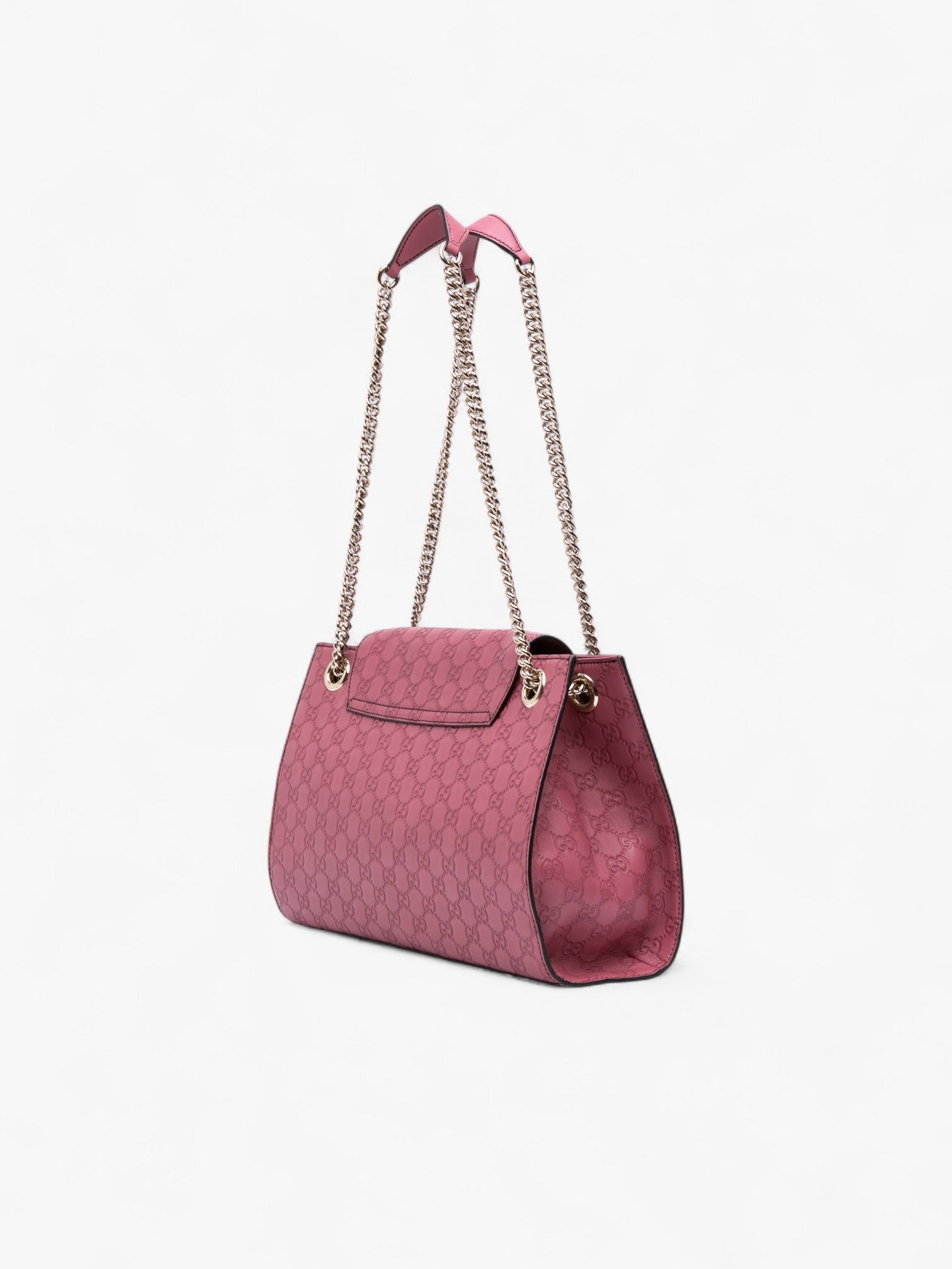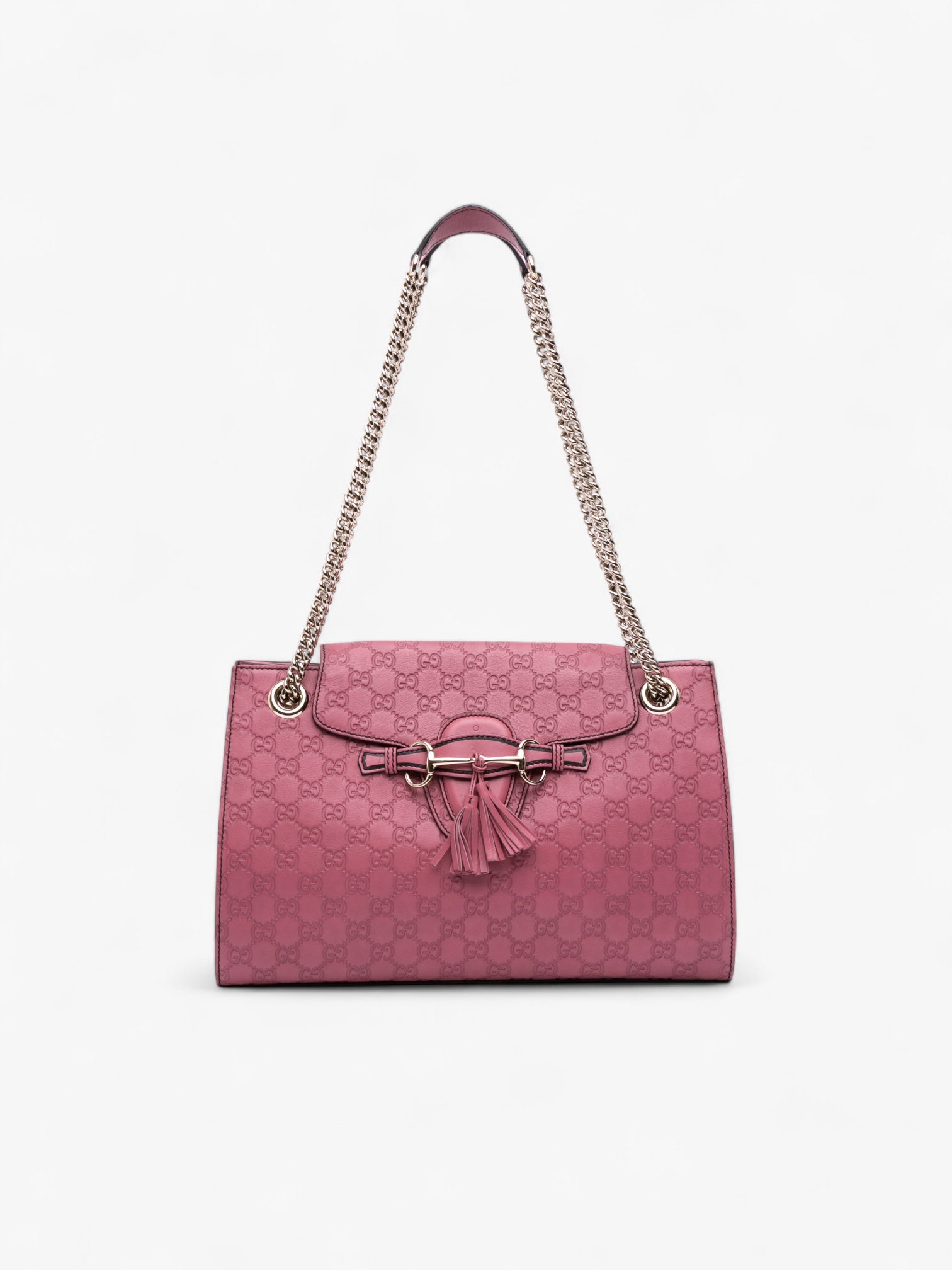The Emily shoulder bag features an embossed leather body, chain straps with flat leather shoulder guards, a front flap with slip through closure, and interior zip and open pockets.