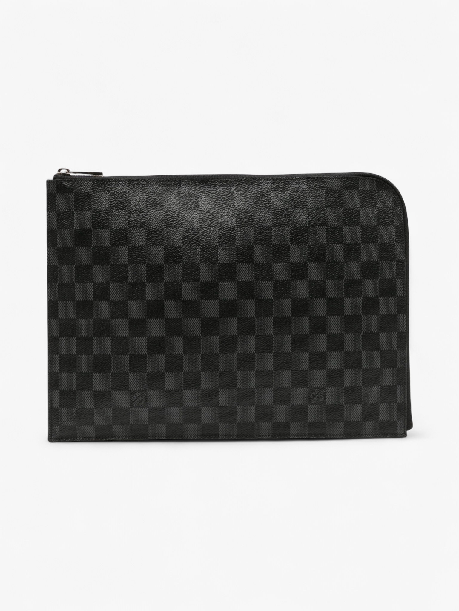 Indulge in the timeless elegance of the Louis Vuitton Damier Graphite Pochette Jour GM, a stunning accessory that effortlessly combines sophistication with practicality. Crafted from durable damier graphite canvas, this chic pouch features a zip-around closure that ensures your essentials are secure. Its sleek silhouette and versatile black hue make it an ideal companion for both day and evening wear, while the interior slip pocket offers convenient organization. A true testament to Louis Vuitton's renowned craftsmanship, this piece is perfect for the discerning individual who appreciates luxury and style.