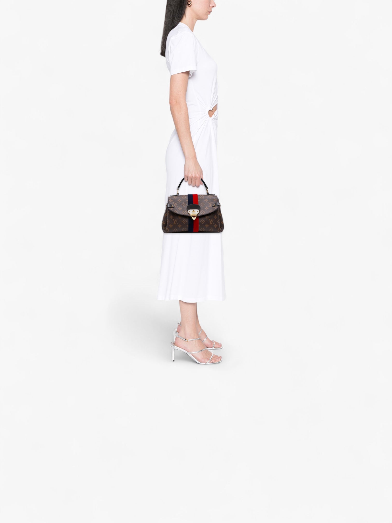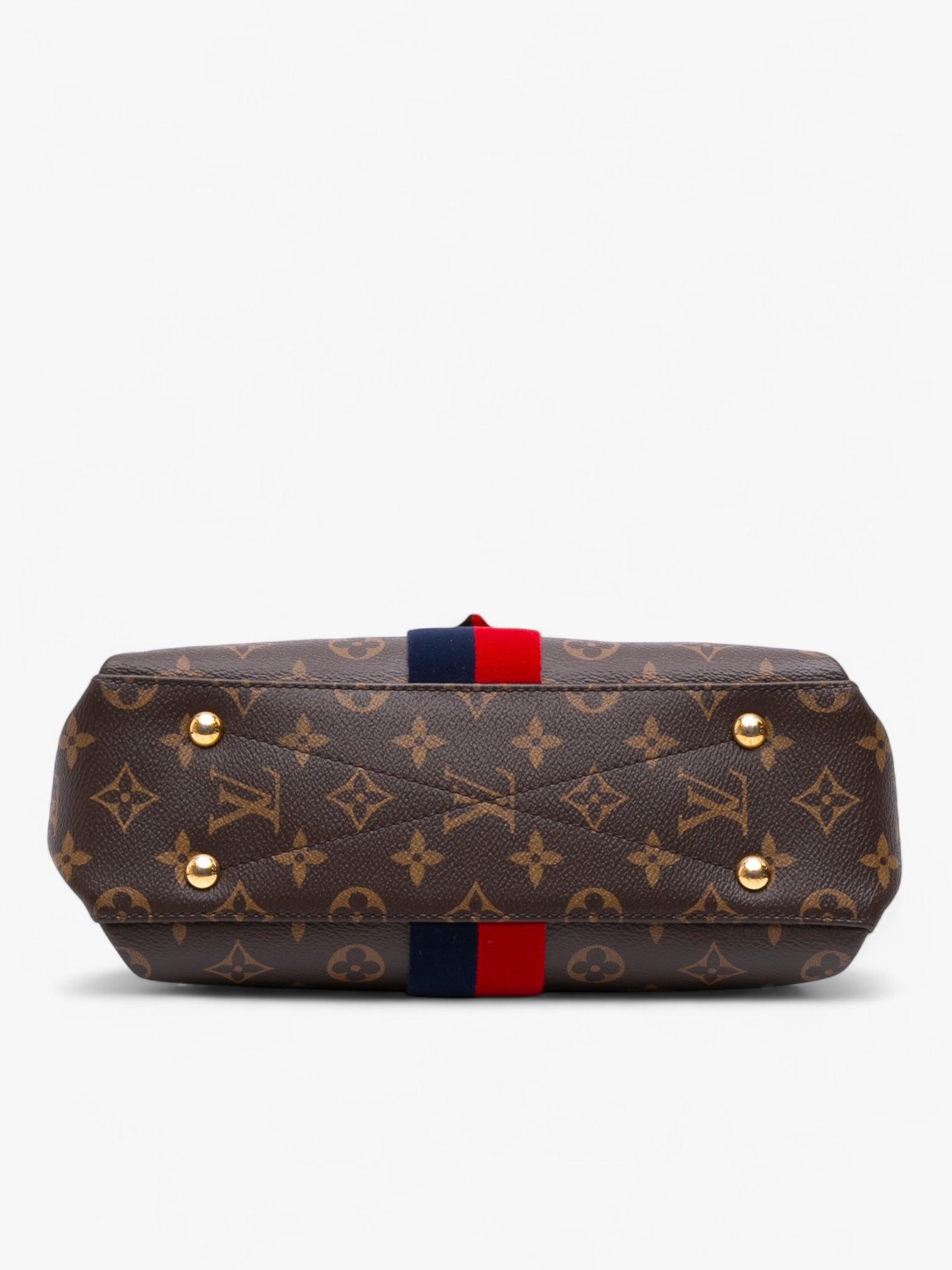 The Louis Vuitton Monogram Georges BB is a striking and sophisticated satchel crafted from monogram canvas with velvet trim and leather detailing. It features a flat leather handle, a front flap with magnetic snap closure, and an organized interior with slip pockets. The bold central stripe in red and blue adds a touch of modern elegance, making it a versatile piece for both daily wear and chic occasions.
