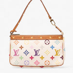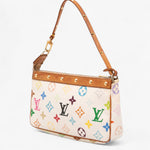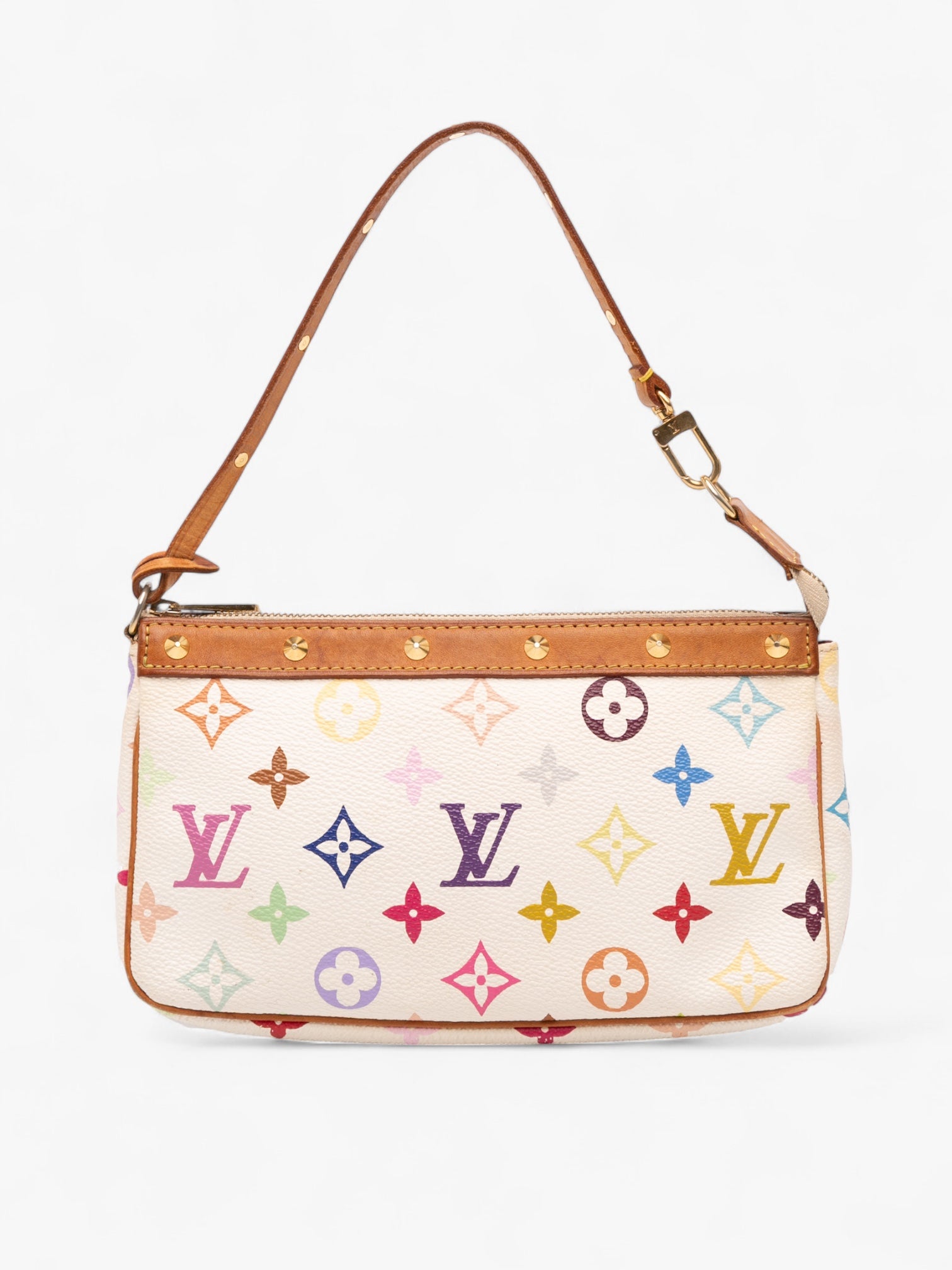The Louis Vuitton Monogram Multicolore Pochette Accessoires is an iconic Y2K-era collectible designed in collaboration with Takashi Murakami. Its playful multicolor monogram on a white canvas base, accented with natural vachetta leather and gold-tone studs, makes it instantly recognizable. Compact yet versatile, it can be carried by hand or on the shoulder, making it a perfect statement piece for both everyday wear and special occasions.