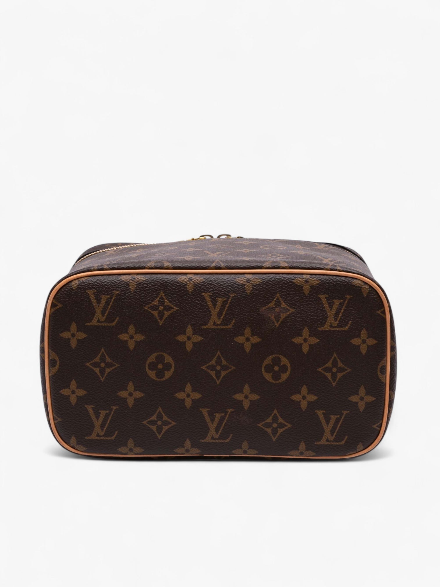 The Louis Vuitton Monogram Nice BB Vanity Case is crafted from monogram canvas with vachetta leather trim and a flat leather top handle. It features a top zip-around closure and an interior slip pocket. Compact yet functional, this vanity is perfect for organizing beauty essentials or as a chic mini travel case.