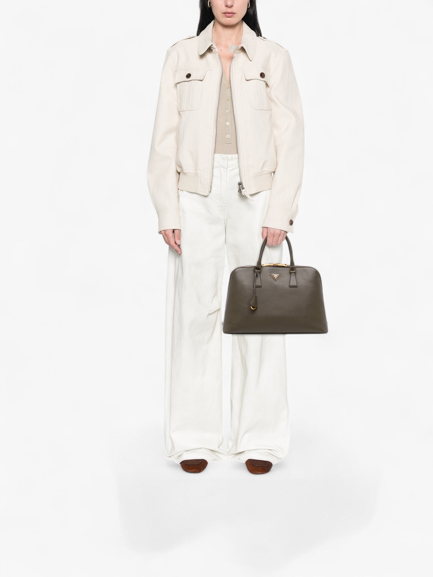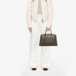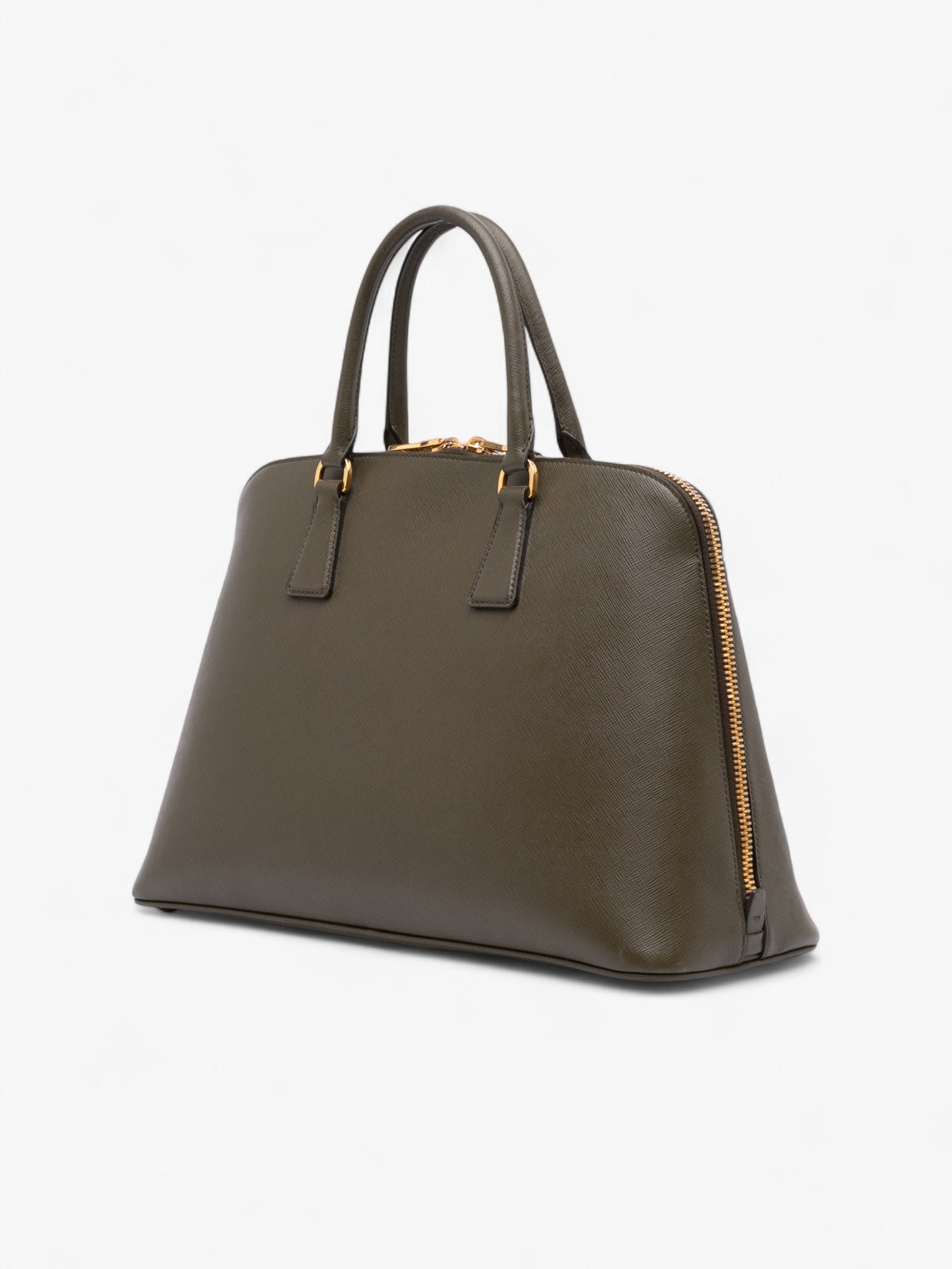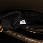The Prada Large Saffiano Lux Promenade Satchel is a sophisticated classic, admired for its refined structure and durability. Crafted from Saffiano leather in a deep brown tone, it features rolled leather handles, a secure zip-around closure, and an organized interior with multiple compartments — a polished and functional choice for everyday wear.