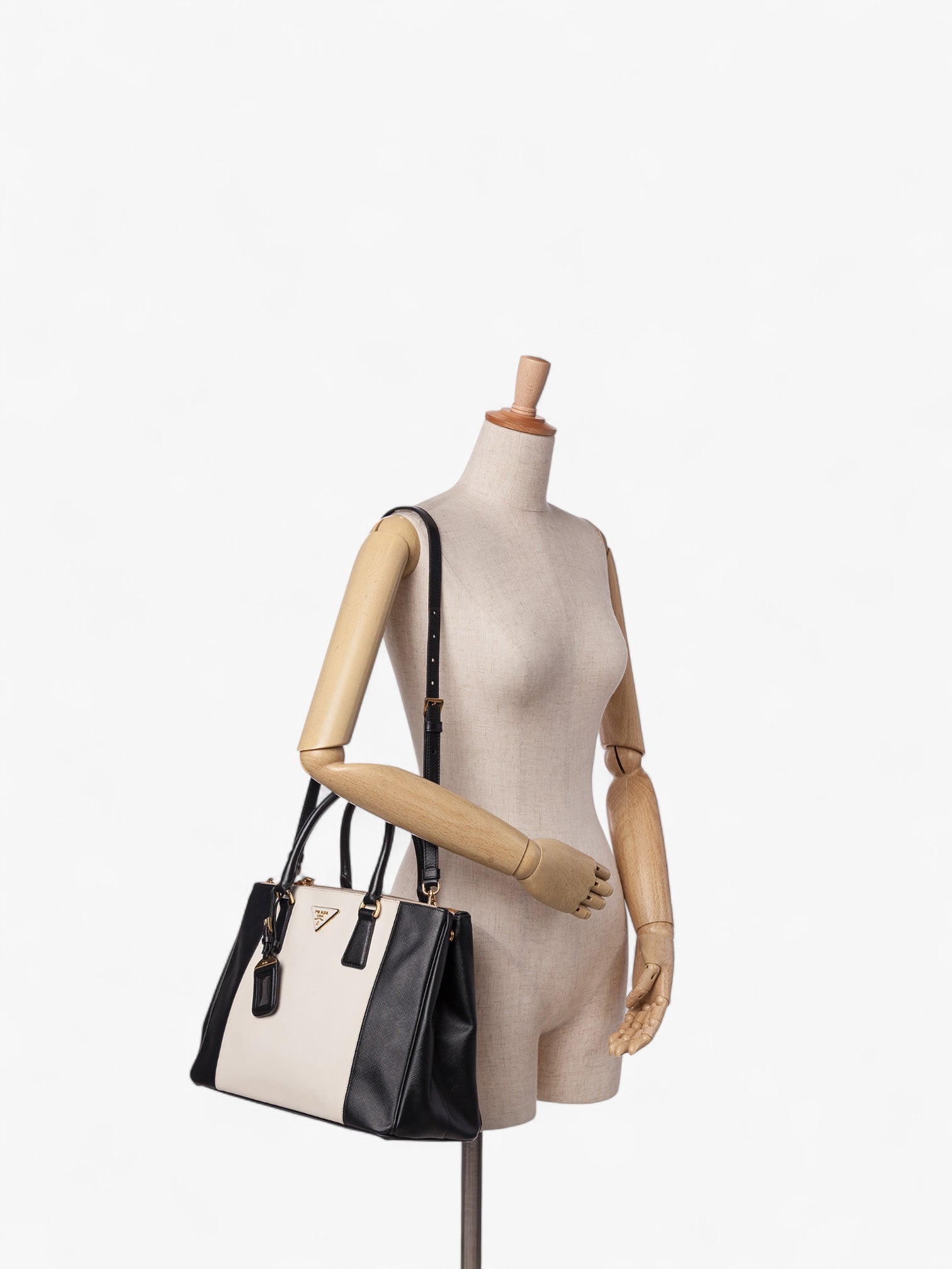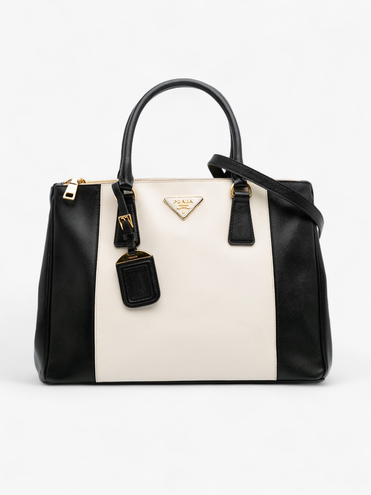 The Prada Medium Bicolor Saffiano Lux Galleria Double Zip Satchel is a refined and versatile piece that embodies the timeless elegance of Prada. Crafted from durable Saffiano leather in a sophisticated black and white bicolor design, it features rolled leather handles, a detachable flat leather strap, an open top with magnetic snap button closure, dual zip compartments, and interior zip and slip pockets. With its structured silhouette and polished details, this satchel is perfect for elevating both day and evening looks.