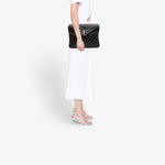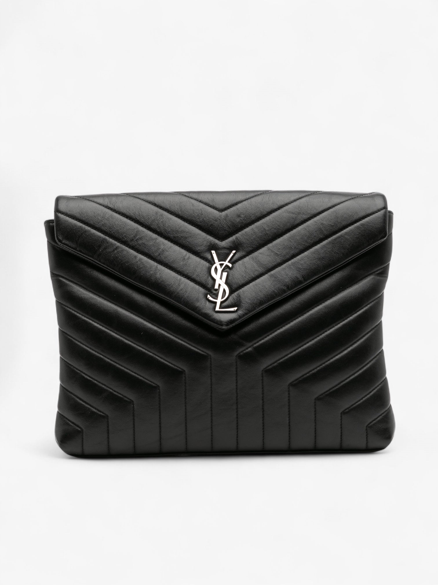 The Saint Laurent LouLou Document Clutch in matelassé calfskin is an elegant and versatile piece. It features the signature YSL logo, a quilted leather body, and a front flap with a magnetic snap closure. Perfect for carrying essentials with a sleek, sophisticated touch.