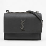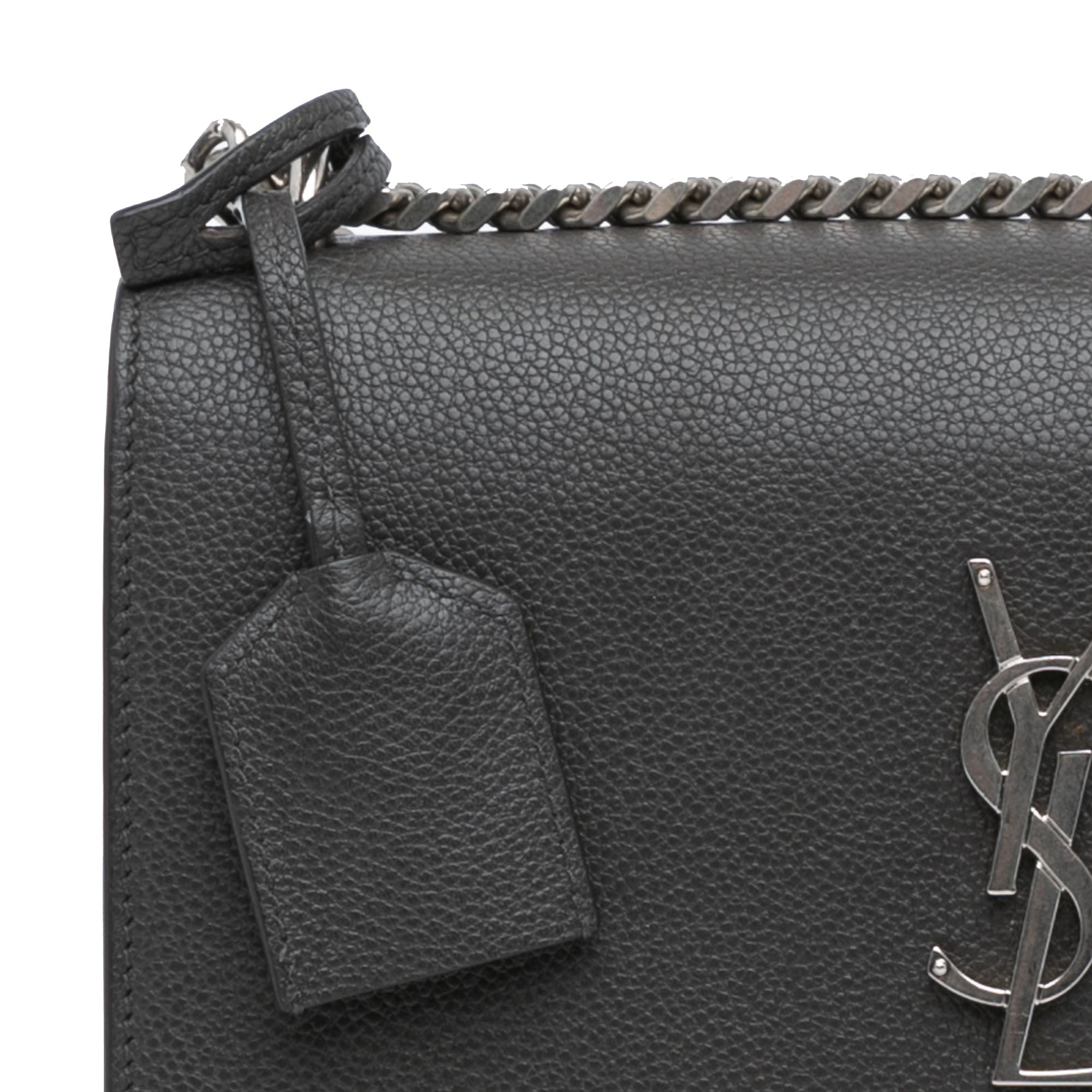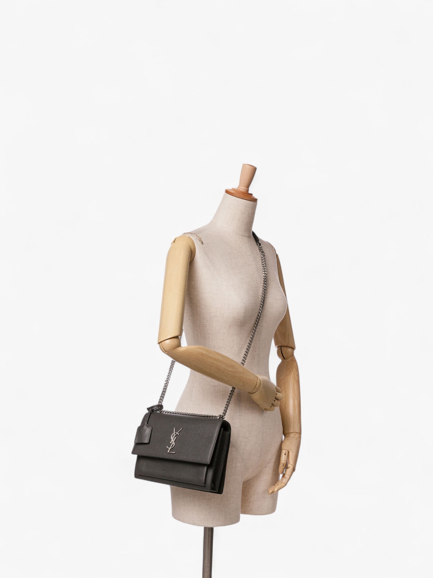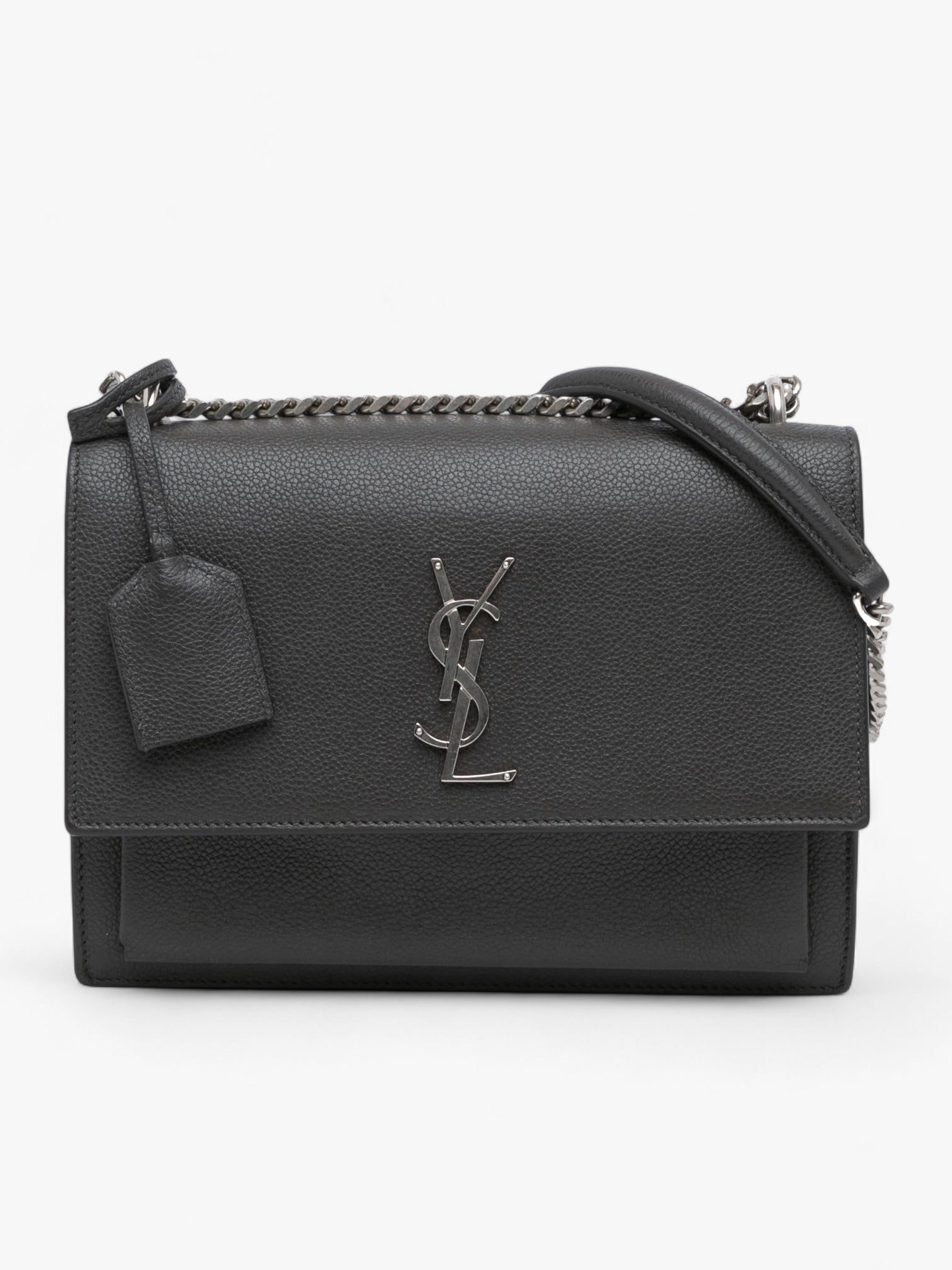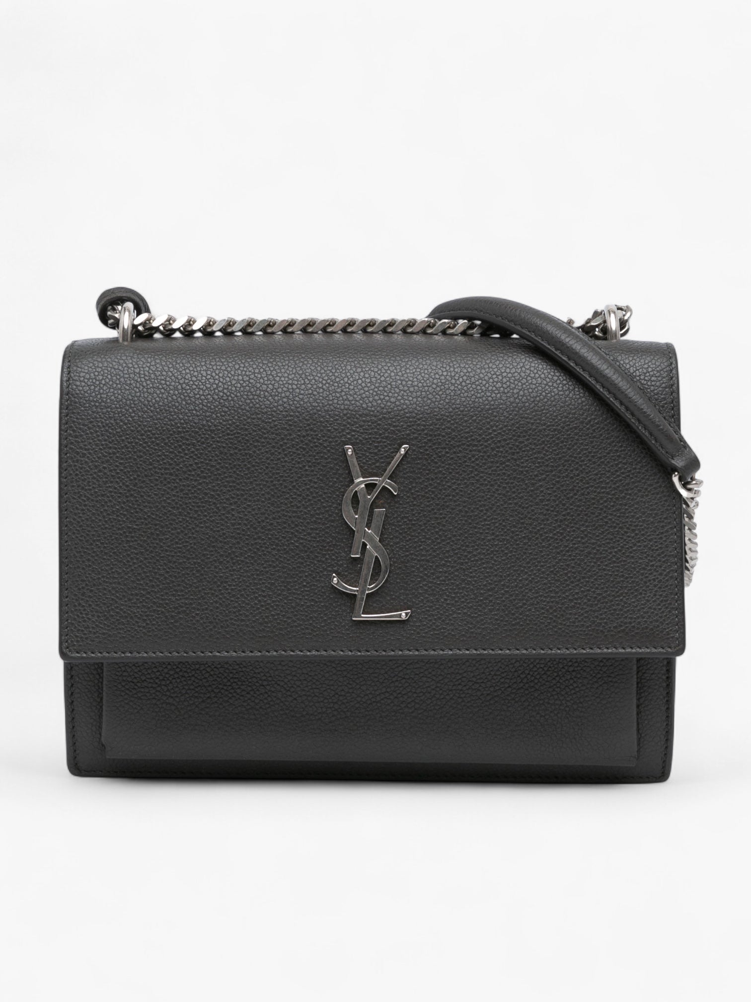 Refined and versatile, the Saint Laurent Medium Grained Calfskin Monogram Sunset Crossbody pairs structured lines with the iconic YSL hardware. Crafted in grey grained calfskin, it features a chain strap with leather guard, a front flap with magnetic snap, an exterior pocket, two interior compartments and a slip pocket — effortless from day to evening.