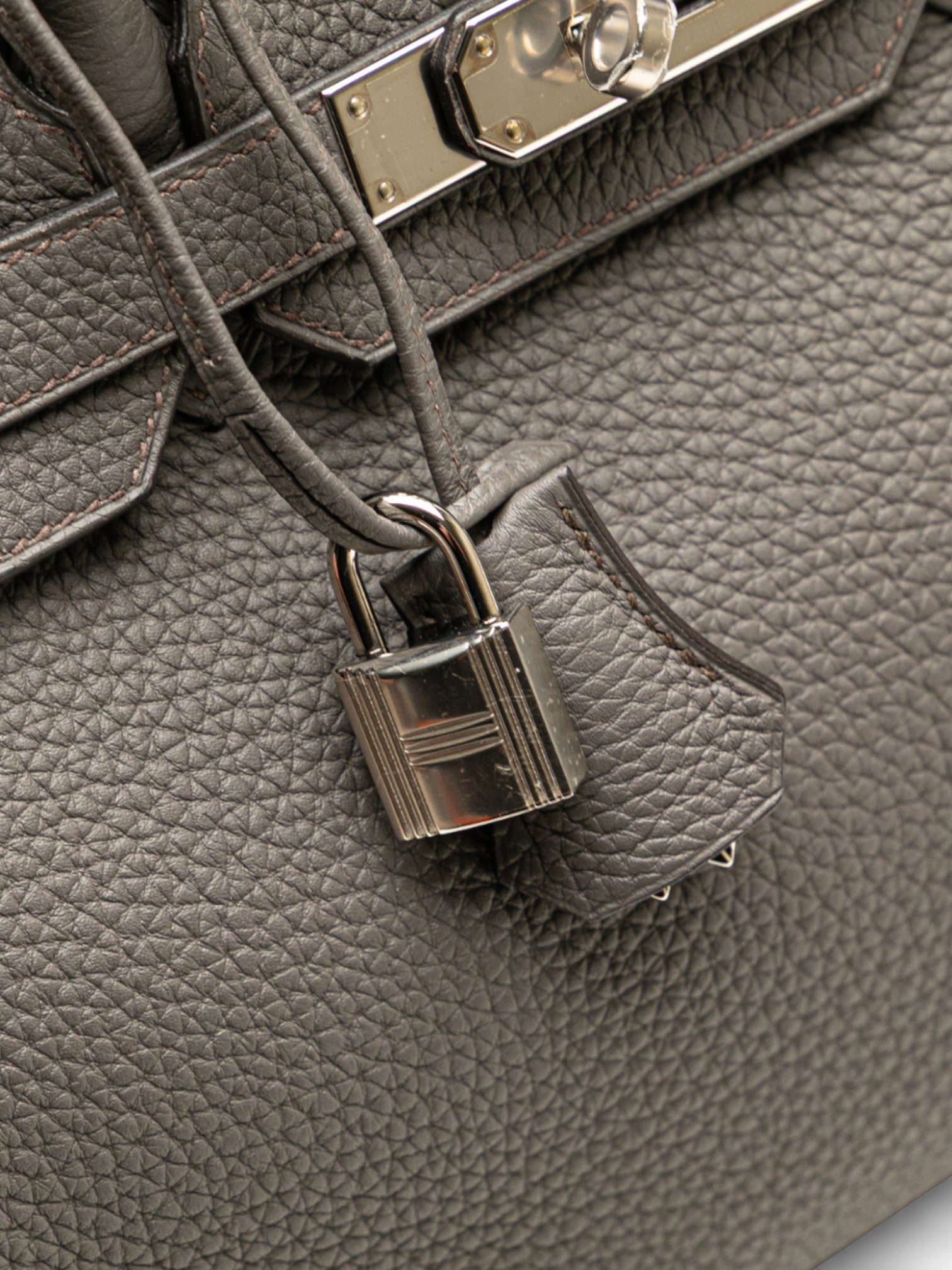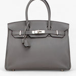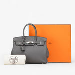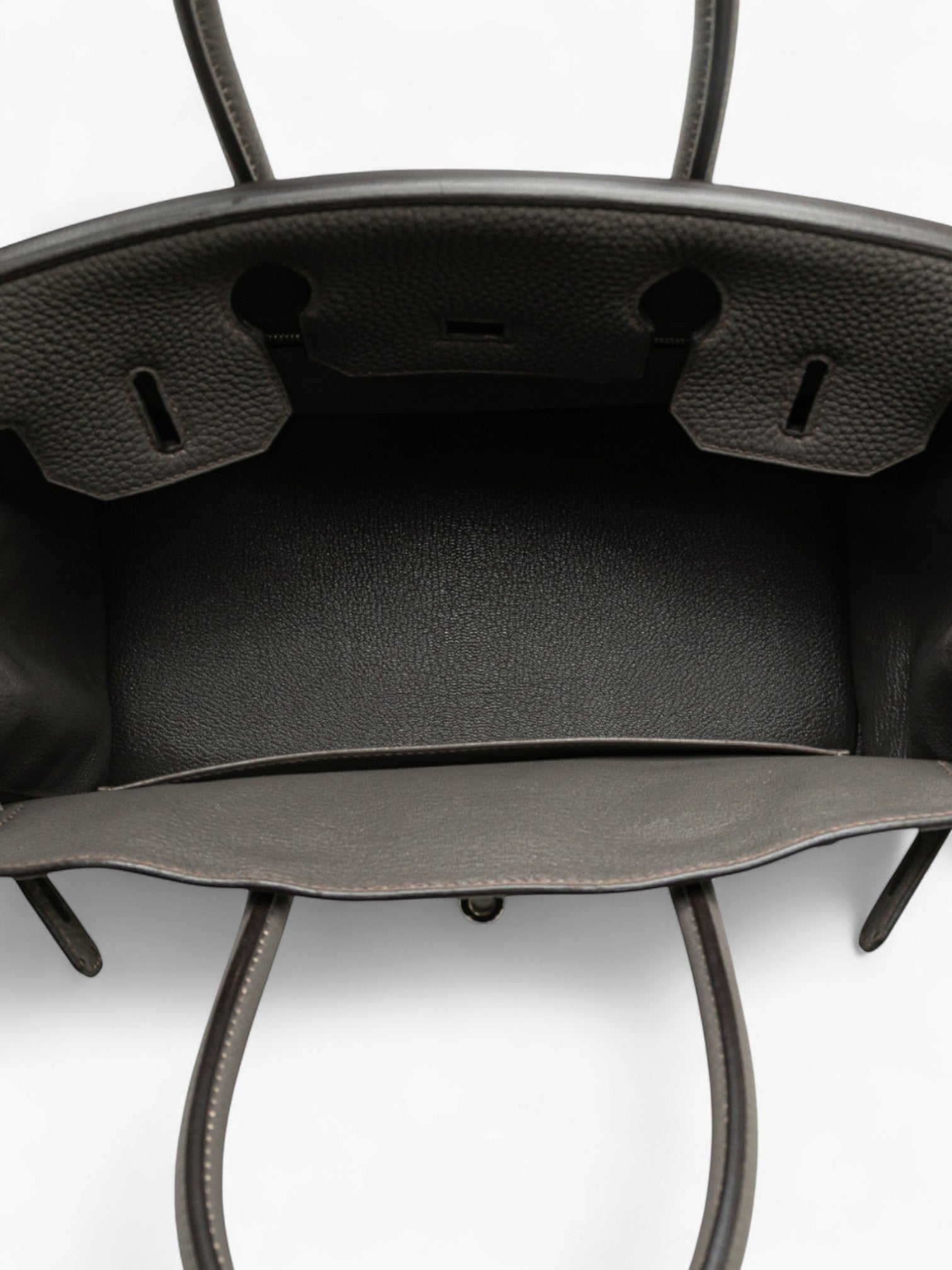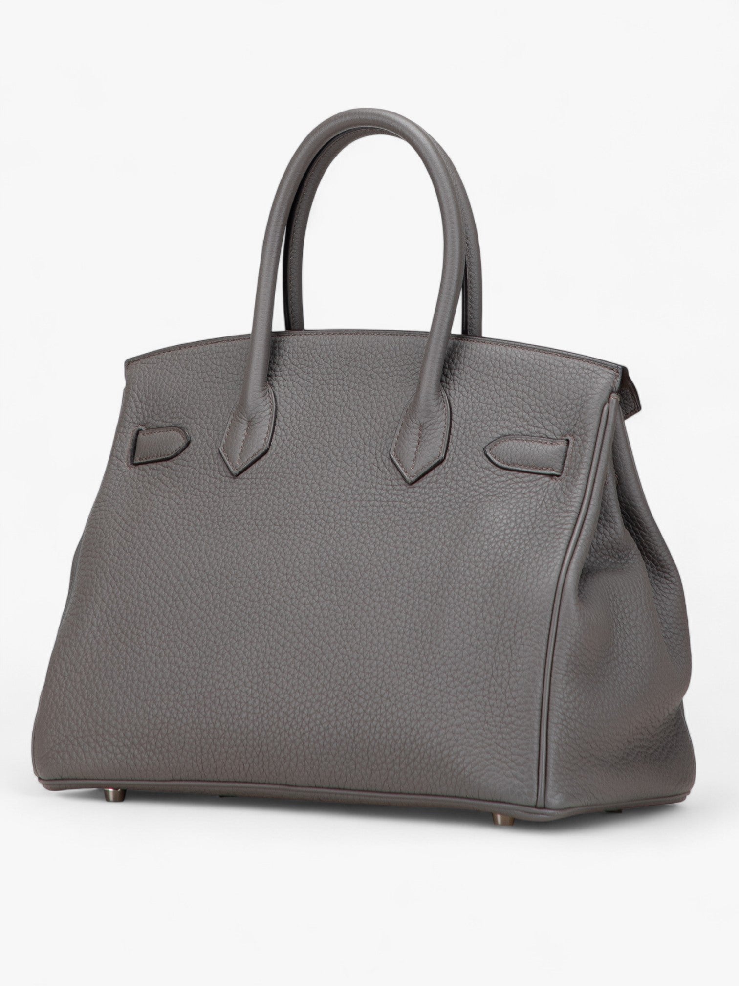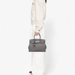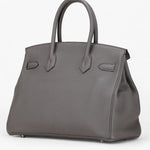 The Hermès Birkin 30 Retourne in Etain Togo leather is a refined expression of timeless elegance. Crafted from soft, durable Togo calf leather, this Birkin features the classic Retourne silhouette with slightly rounded edges, rolled leather handles, and the signature front flap with polished metal turn-lock closure. The interior includes both zip and slip pockets, combining practical organization with Hermès’ impeccable craftsmanship.