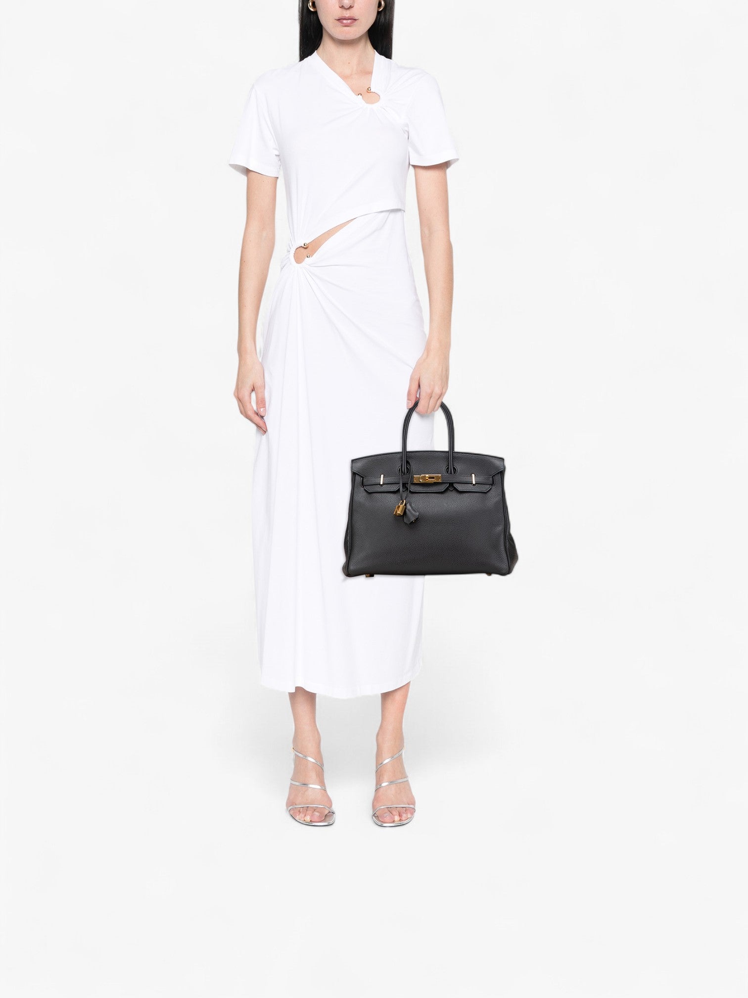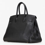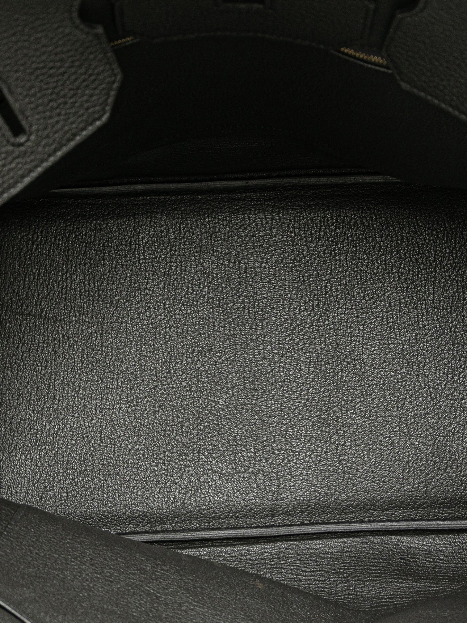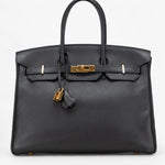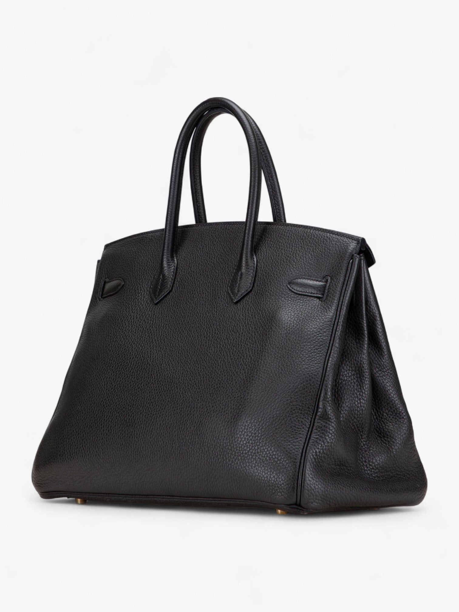 The Hermès Birkin 35 Retourne in Graphite Togo leather is a timeless symbol of refined sophistication. Crafted from supple, durable Togo calf leather in a deep graphite gray shade, this piece showcases the classic Retourne silhouette with softly curved edges, rolled leather handles, and the signature front flap with polished metal turn-lock closure. The interior features both zip and slip pockets, balancing elegant design with everyday functionality.