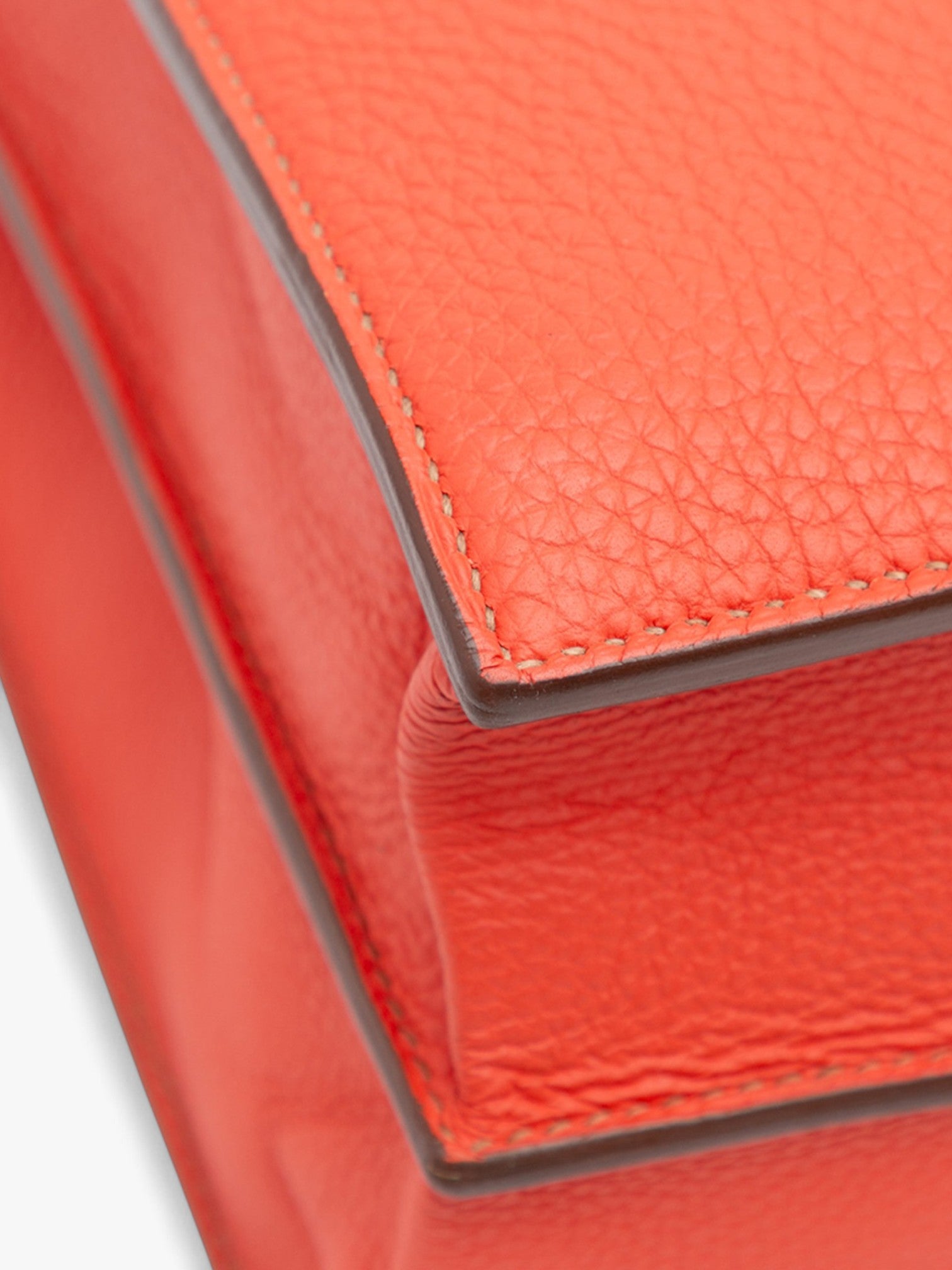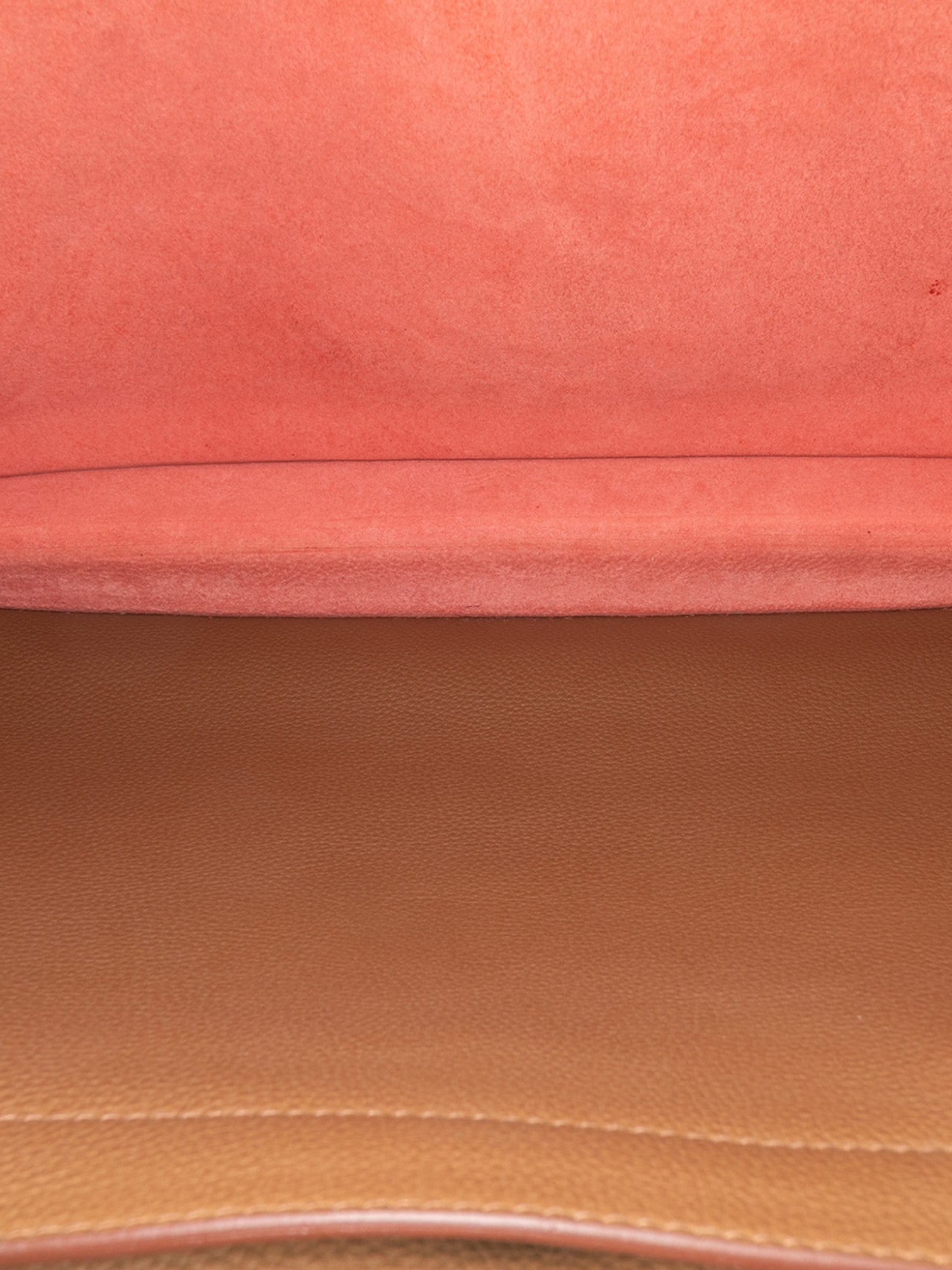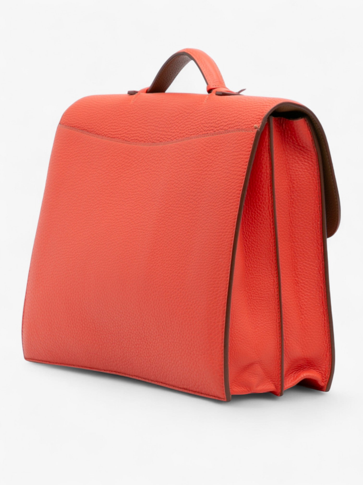 The Hermès Sac à Dépêches Verso 38 in Togo leather is a sophisticated briefcase that blends timeless craftsmanship with bold elegance. Crafted from durable and supple Togo calf leather in a striking combination of Capucine and Gold tones, it features a structured silhouette, a flat leather top handle, and a signature front flap with a polished flip-lock closure. The interior is designed with open and slip compartments, offering both refined organization and unmistakable Hermès luxury.