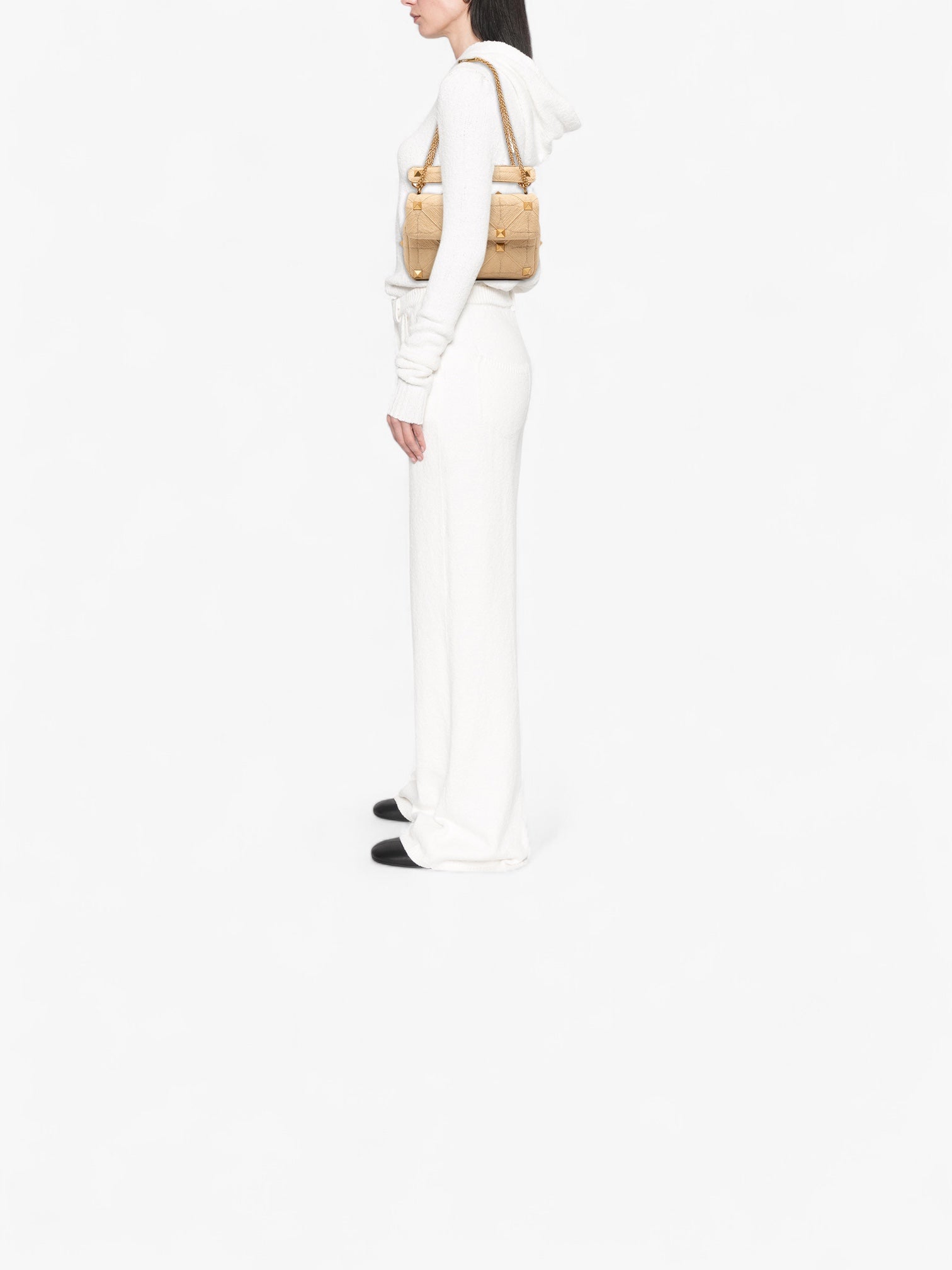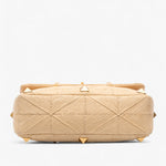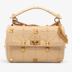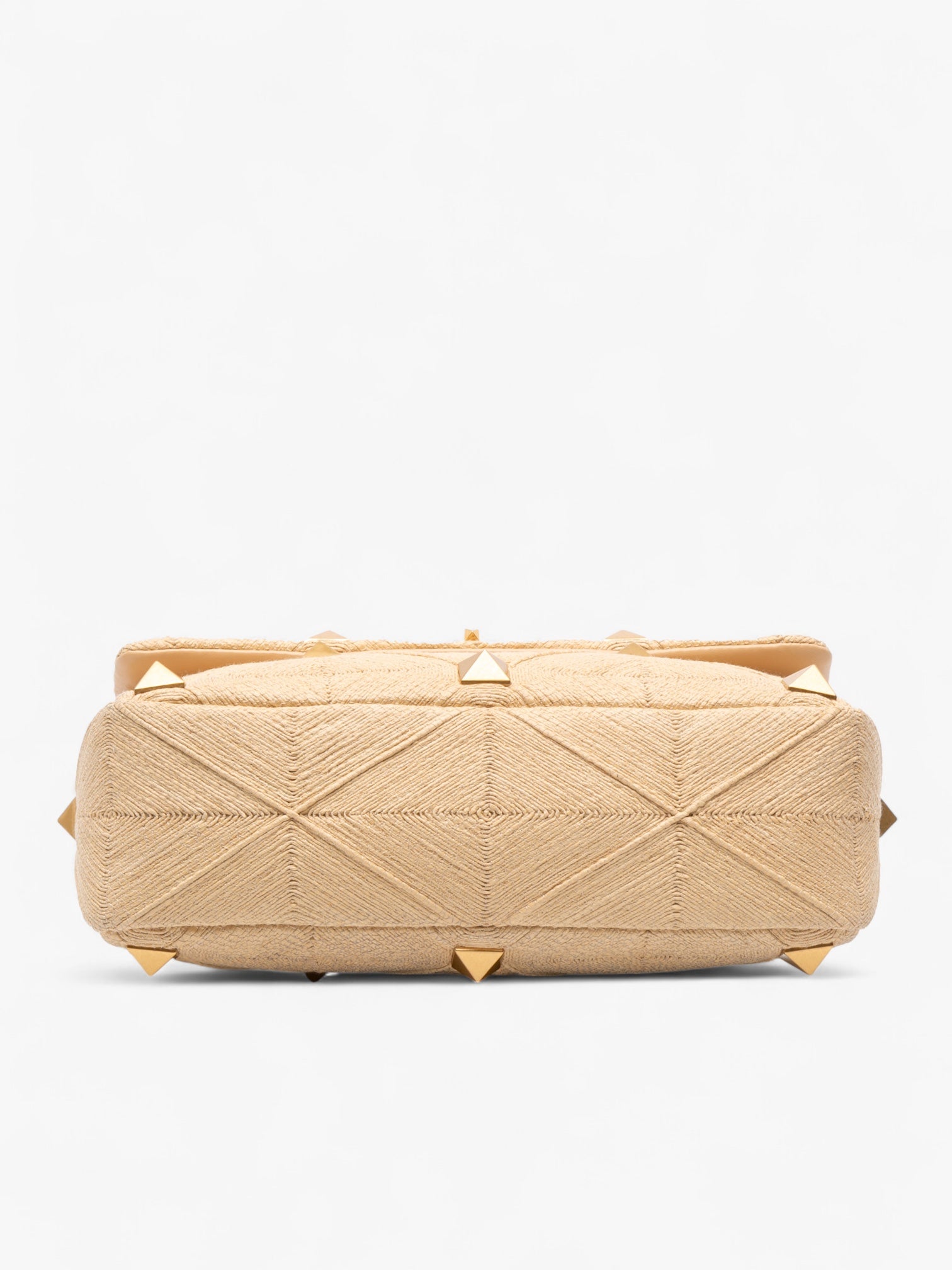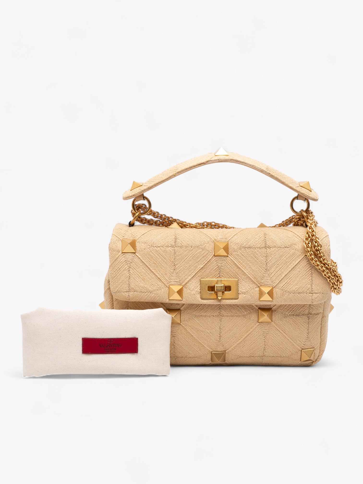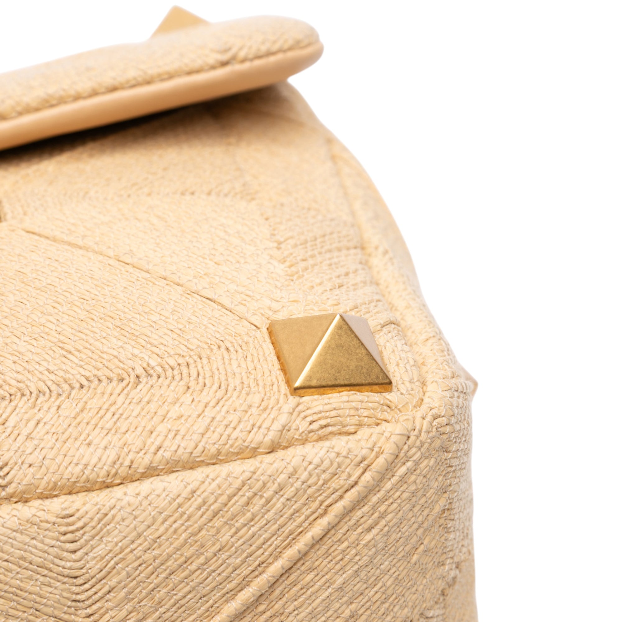 The Valentino Large Raffia Roman Stud Satchel is a chic and distinctive piece that merges natural textures with bold detailing. Crafted from raffia with leather trim, it features the iconic oversized Roman studs, a flat top handle, and a detachable gold-tone chain strap for versatile carry. The flap closes with a twist lock, while the interior offers zip and slip pockets for organization. A refined summer statement bag with a contemporary edge.