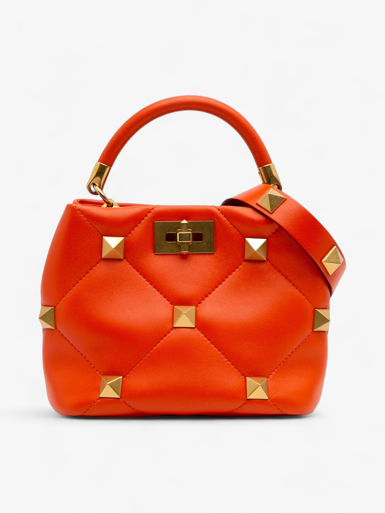 Introducing the Small Nappa Roman Stud The Handle Bag, a stunning creation that epitomizes luxury and sophistication. This exquisite satchel showcases a beautifully quilted leather body adorned with striking studs, offering a perfect blend of elegance and modernity. Its rolled leather handle and detachable strap provide versatility for any occasion, while the open top with twist lock closure ensures both style and security. With a spacious compartment featuring a magnetic closure and interior slip pockets, this piece is as practical as it is fashionable, making it a timeless addition to your collection.