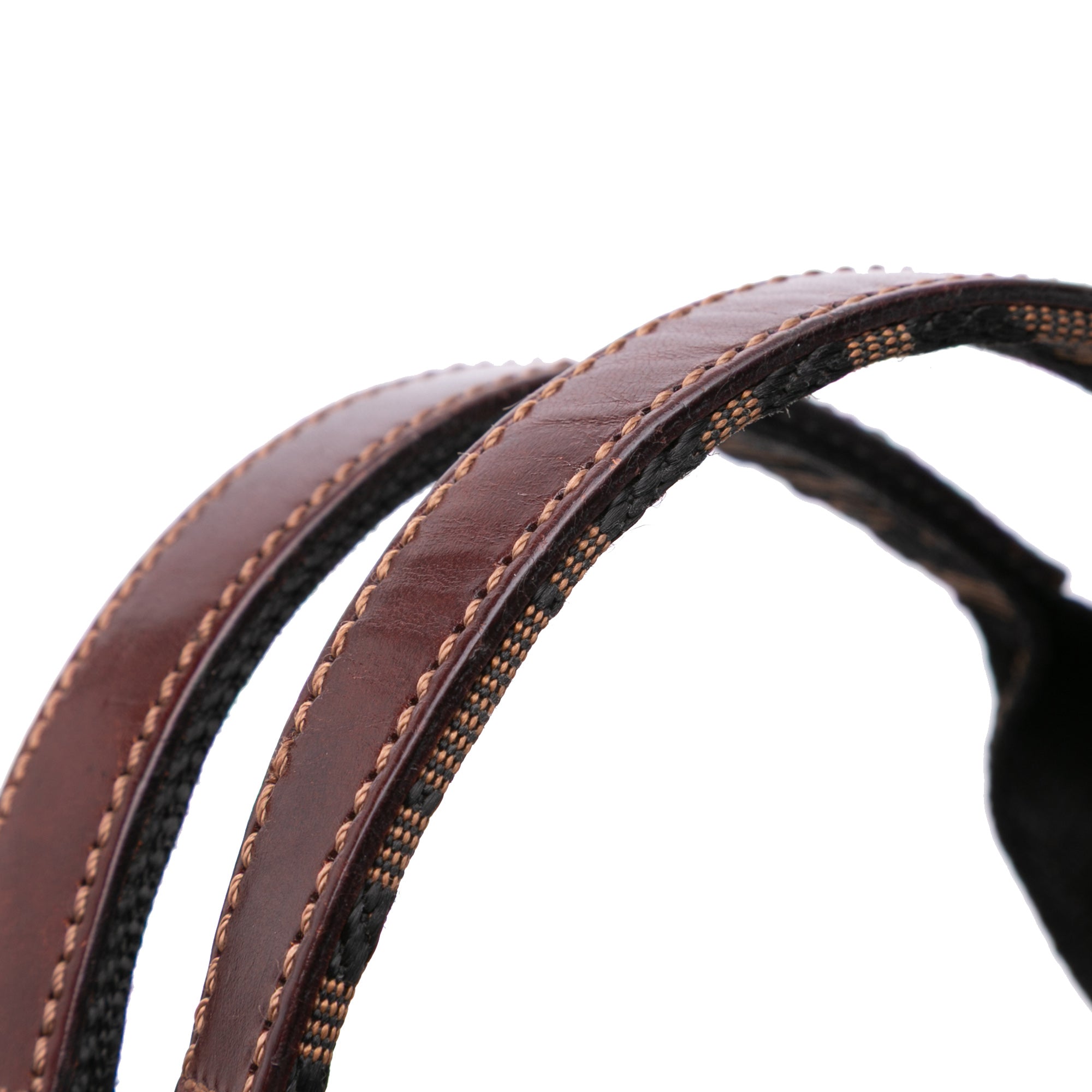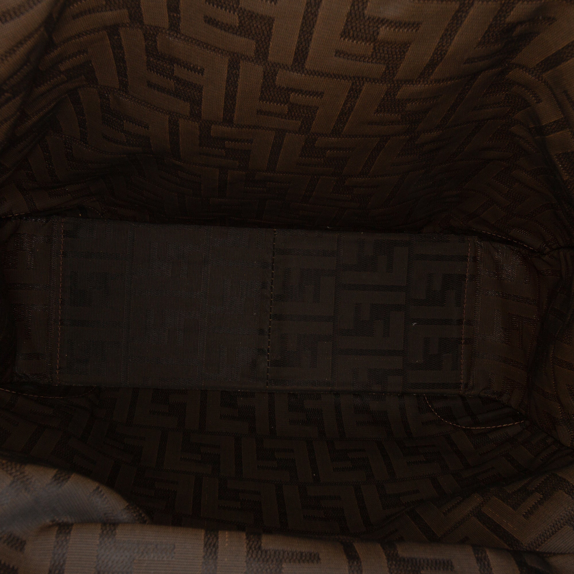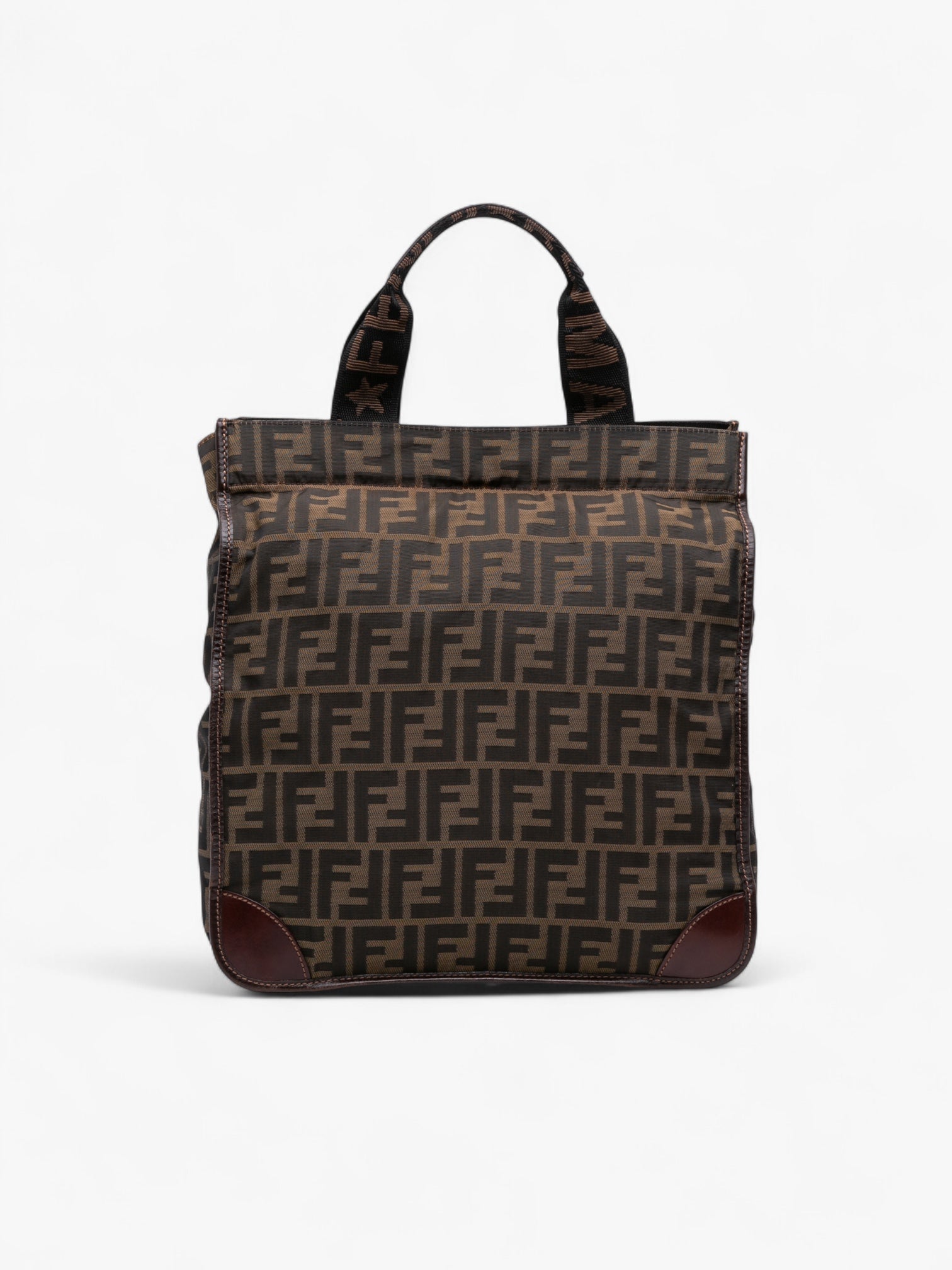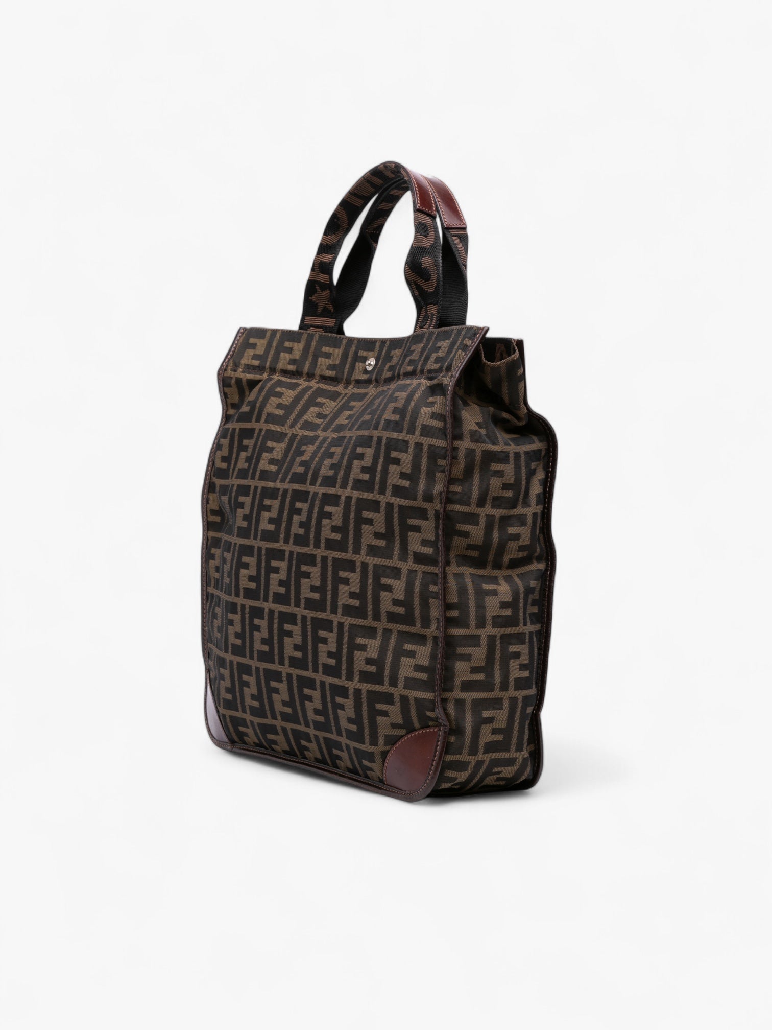 The Fendi Zucca Canvas Shopping Tote features a canvas body with leather trim, flat leather and canvas handles, and an open top with button closure.
