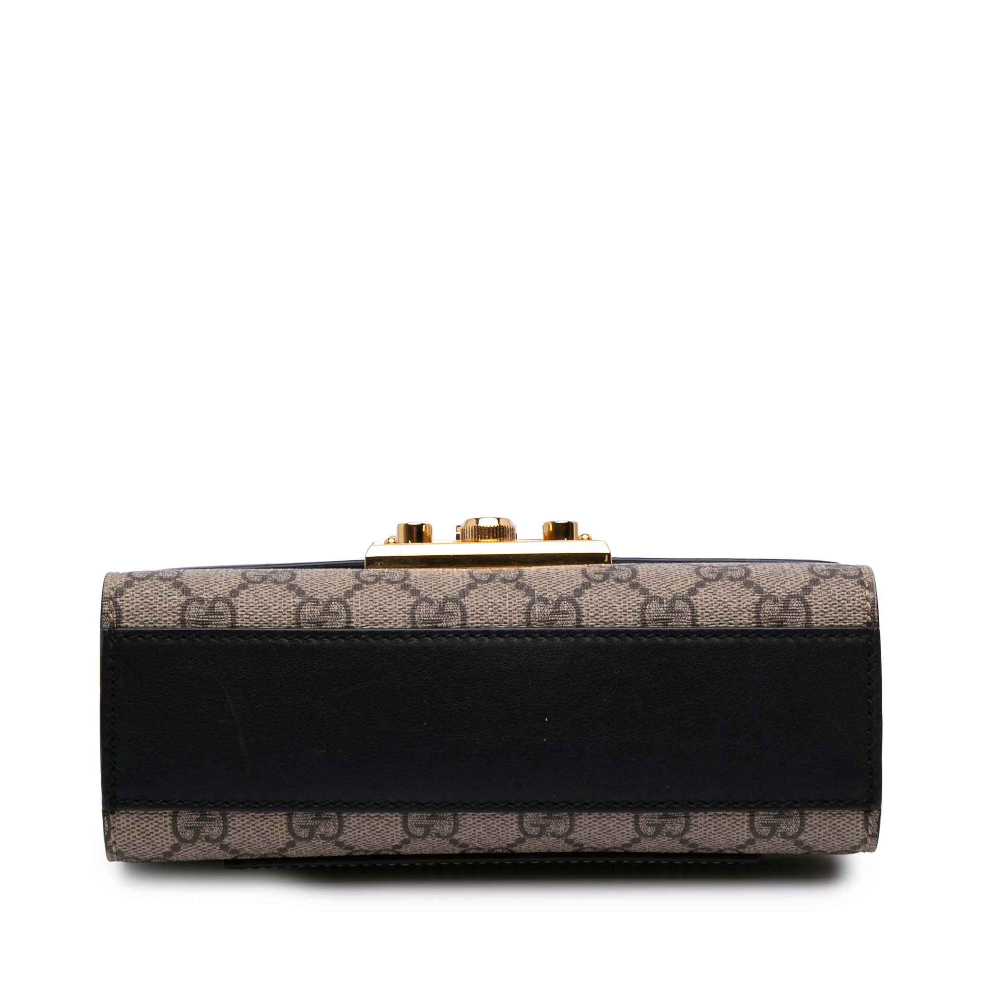 Aceasta este autentica geantă tip crossbody GUCCI Small GG Supreme Padlock. Această geantă excepțională este elegant realizată din pânză acoperită cu panouri laterale din piele, având o curea chic din lanț și o clapă frontală rafinată din piele cu închidere push-lock, încorporând esența luxului și sofisticării italiene.